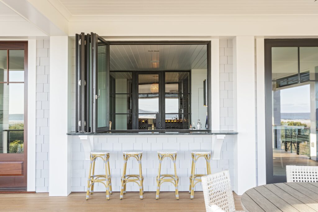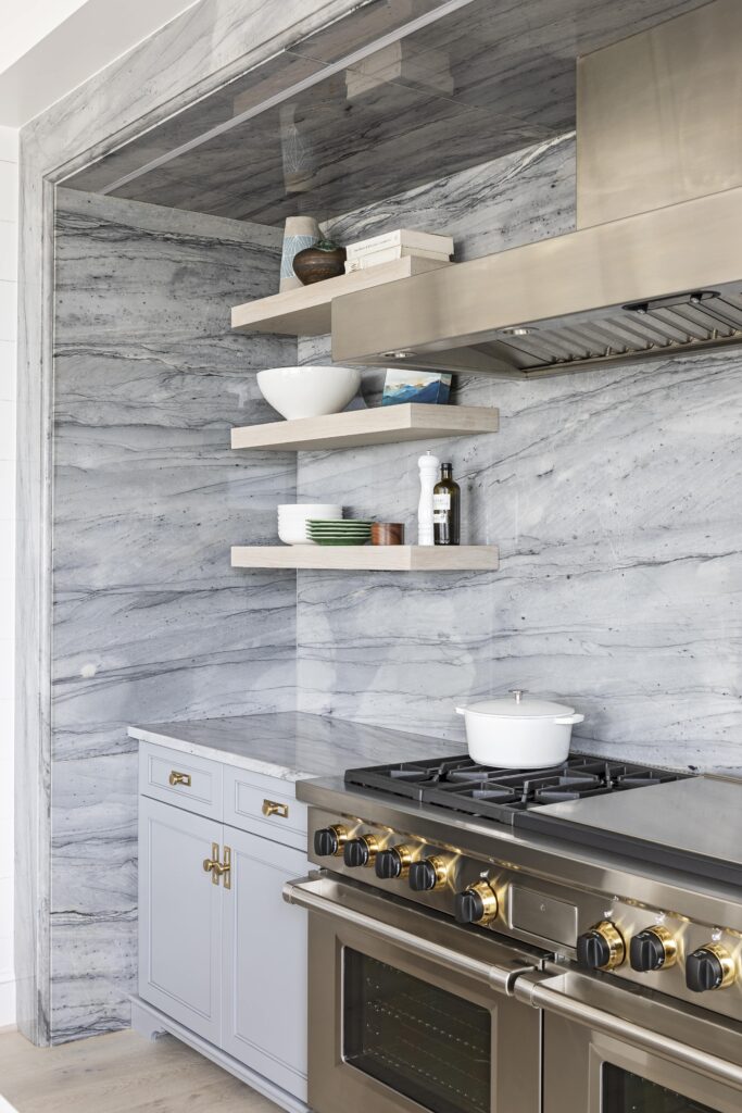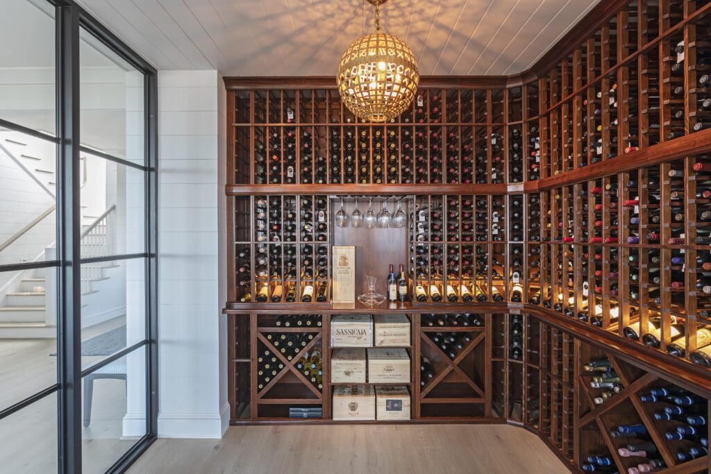 Inside, a wine room with a steel-and-glass frame steals the show, while the kitchen impresses with a hidden pantry door, mitered stone countertops, and a book-matched stone niche. The vaulted porch, lined with Lahala matt bamboo paneling, creates its own distinctive flair. An elevator and an outdoor shower linked to an indoor one adds a livable luxurious touch.