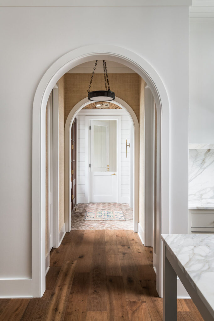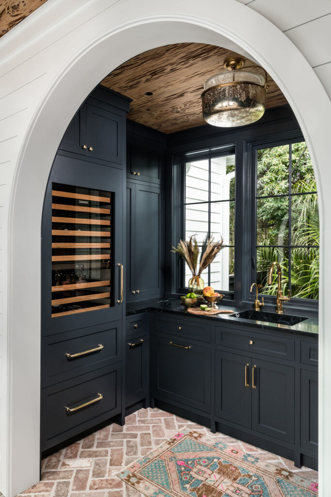 Inside this custom home remodel and renovation, the layout balances openness with definition, using arched openings and strong sight lines to connect the main living spaces. Wood and tile flooring set a consistent foundation, complemented by tailored millwork and a restrained approach to pattern and texture that maintains a cohesive interior. The interior entryway and adjacent wet bar and wine room feature beautiful pecky cypress ceiling treatments, paired with dark cabinetry and tailored details that give these spaces a distinct, collected feel. In the kitchen, a large central island, custom cabinetry, marble counters and backsplashes, and layered lighting support both daily routines and casual gatherings. Just outside the front door, an architectural water feature sets the tone before moving inside.