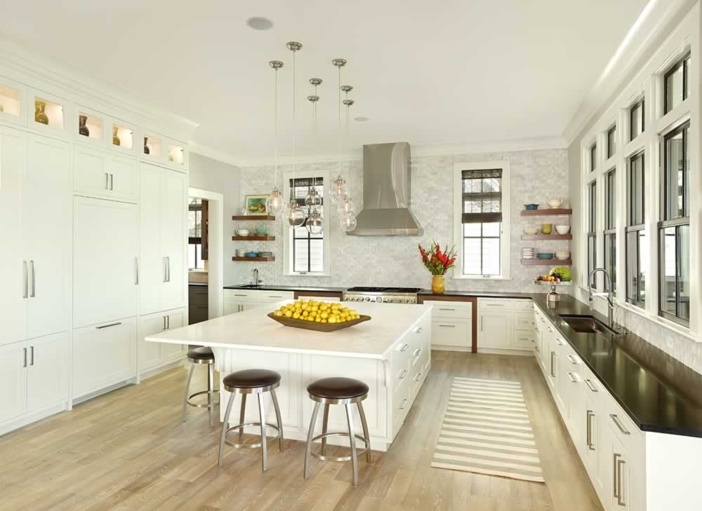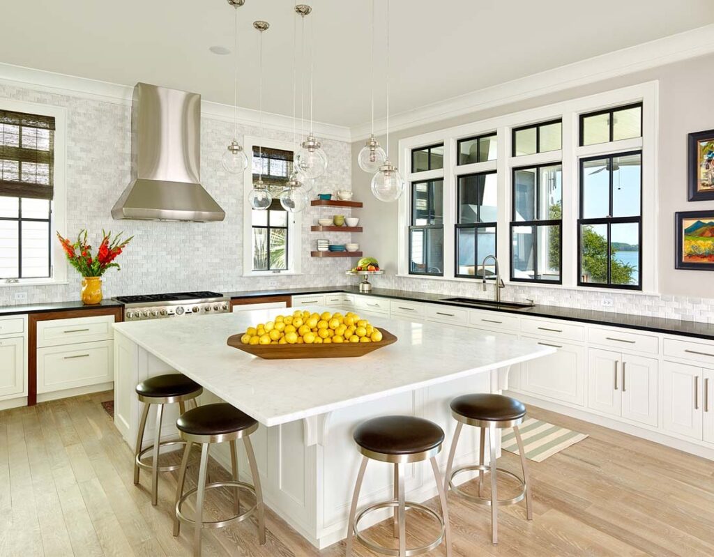 Inside, the layout feels open and easy. White oak floors and exposed beams bring warmth, while large windows fill the rooms with light and frame the river beyond. The kitchen blends painted and natural wood cabinetry with marble counters, balancing traditional craftsmanship with a fresh, modern touch.
