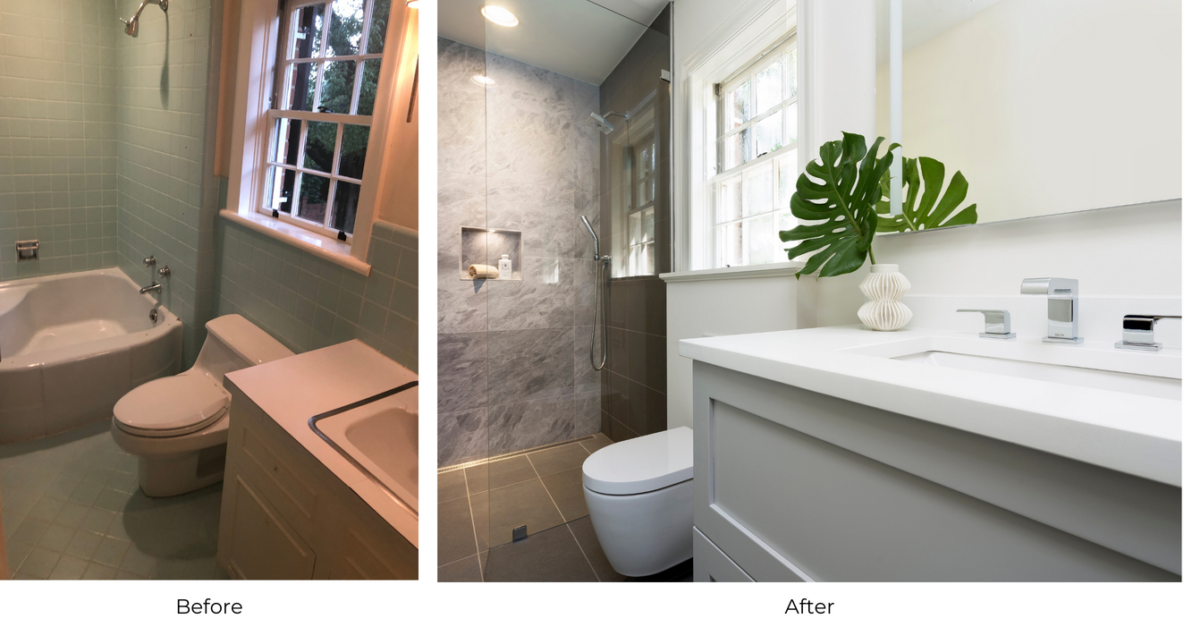 Upon entering the original bathroom, you could see a small bathtub, outdated blue tile walls and flooring, and a basic floor standing vanity. The new Walker Zanger gray porcelain tiles and polished stone back wall provide elegant visual texture and contrast next to the white walls and the white quartz countertop. To achieve a functional yet modern space, a floating vanity and a recessed storage medicine cabinet were chosen. For the shower area, waterproof puck lights, a frameless glass shower door, and a linear shower drain make the bathroom feel more light and spacious.