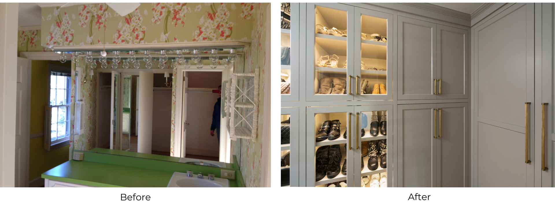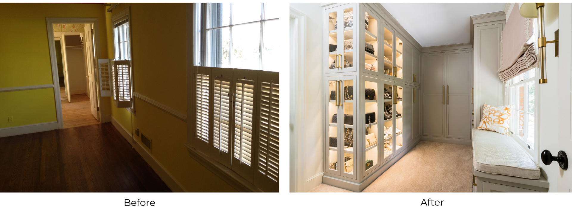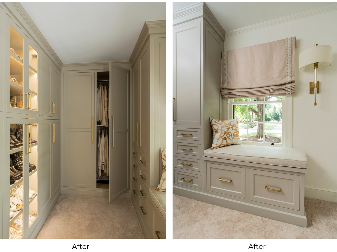 The custom built-in cabinets fit seamlessly into the space thanks to adjustable shelves, a bench seat with drawers, and beautiful crown molding. Two drawers require key fob access, providing security for valuable items. The client’s shoe and purse collections are beautifully displayed behind glass panels and cabinet lighting. To give this closet a soft but modernized feel, a light neutral color palette and gold accents were selected. The natural light shining from the window visually enlarges the space, creating a luminous and welcoming room to get ready in.
