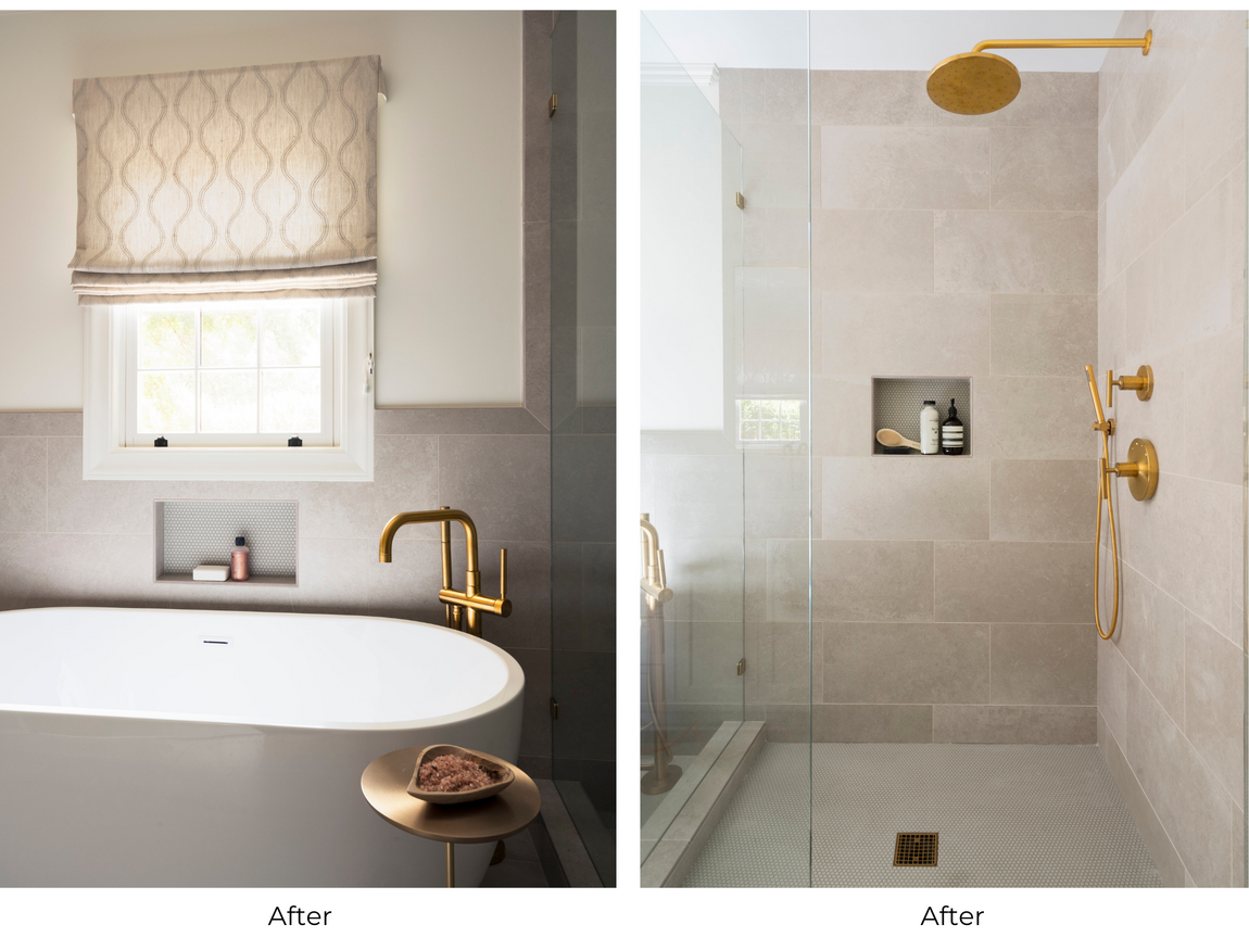 “We wanted this bathroom to have a luxurious, warm, and inviting feel. We chose a neutral color for tiles and brass fixtures which created warmth in the room.” -Homeowner
