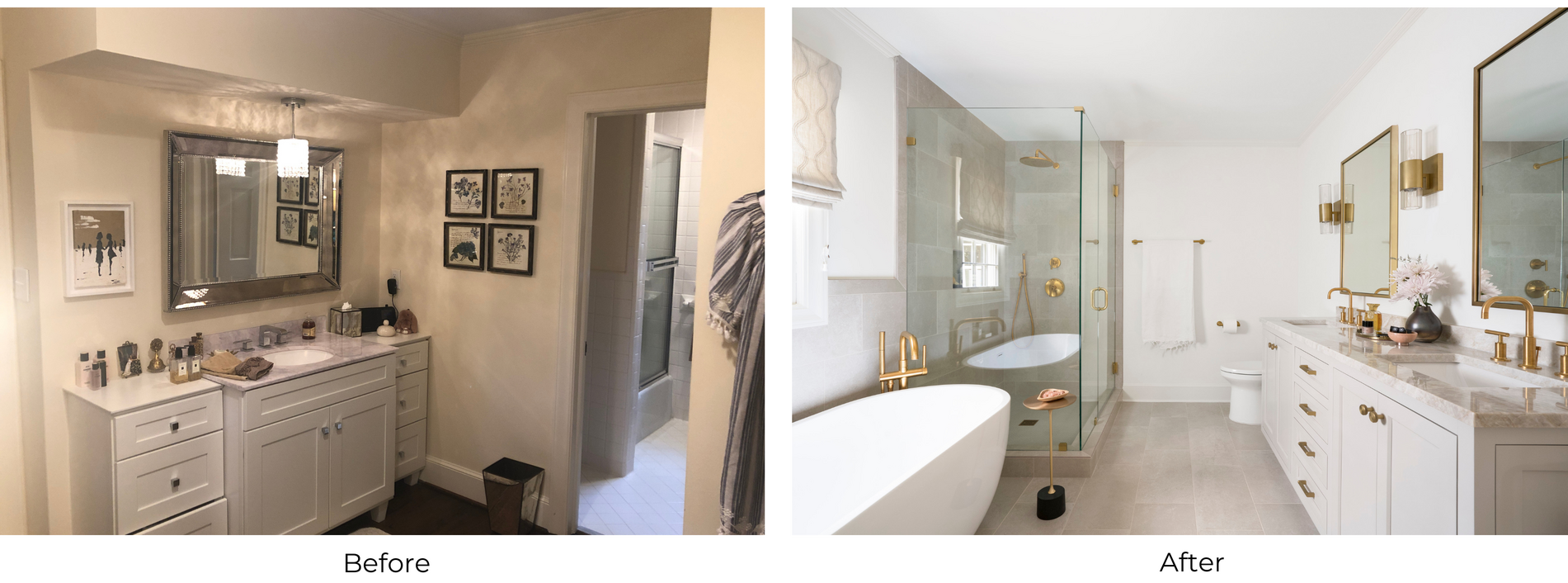 The soft and chic bathroom also boasts modern functionality. To enlarge the space and make room for the new bathroom, multiple walls were removed and closet space was used. The newly renovated bathroom includes a double vanity with polished quartzite countertops, Kohler brass pulls and hardware, a glass walk-in shower, and a freestanding tub. Natural light floods this space, creating a bright and welcoming atmosphere.