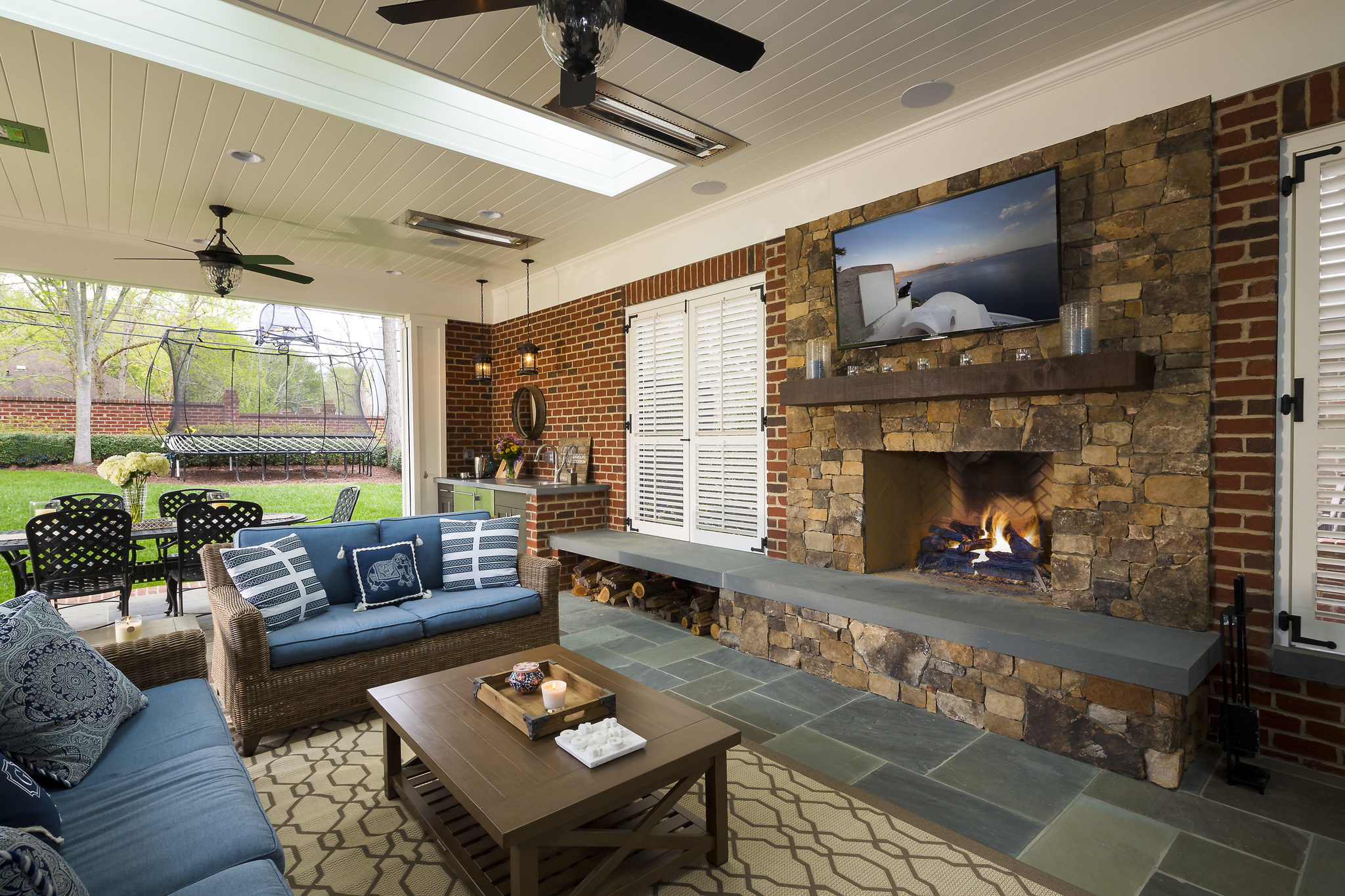 As you’re making your kid friendly home remodeling plans, don’t forget about outdoor spaces too. Kids love the outdoors, and the sky is the limit when it comes to adding options for your family to enjoy, whether that be a trampoline, a rock climbing wall, a swing set or even a swimming pool. For this family, having a space with a trampoline and room to run and enjoy a BBQ helped them to enjoy their days and summer evenings more. And who would mind sitting by the fire watching a ball game while the kids play nearby?