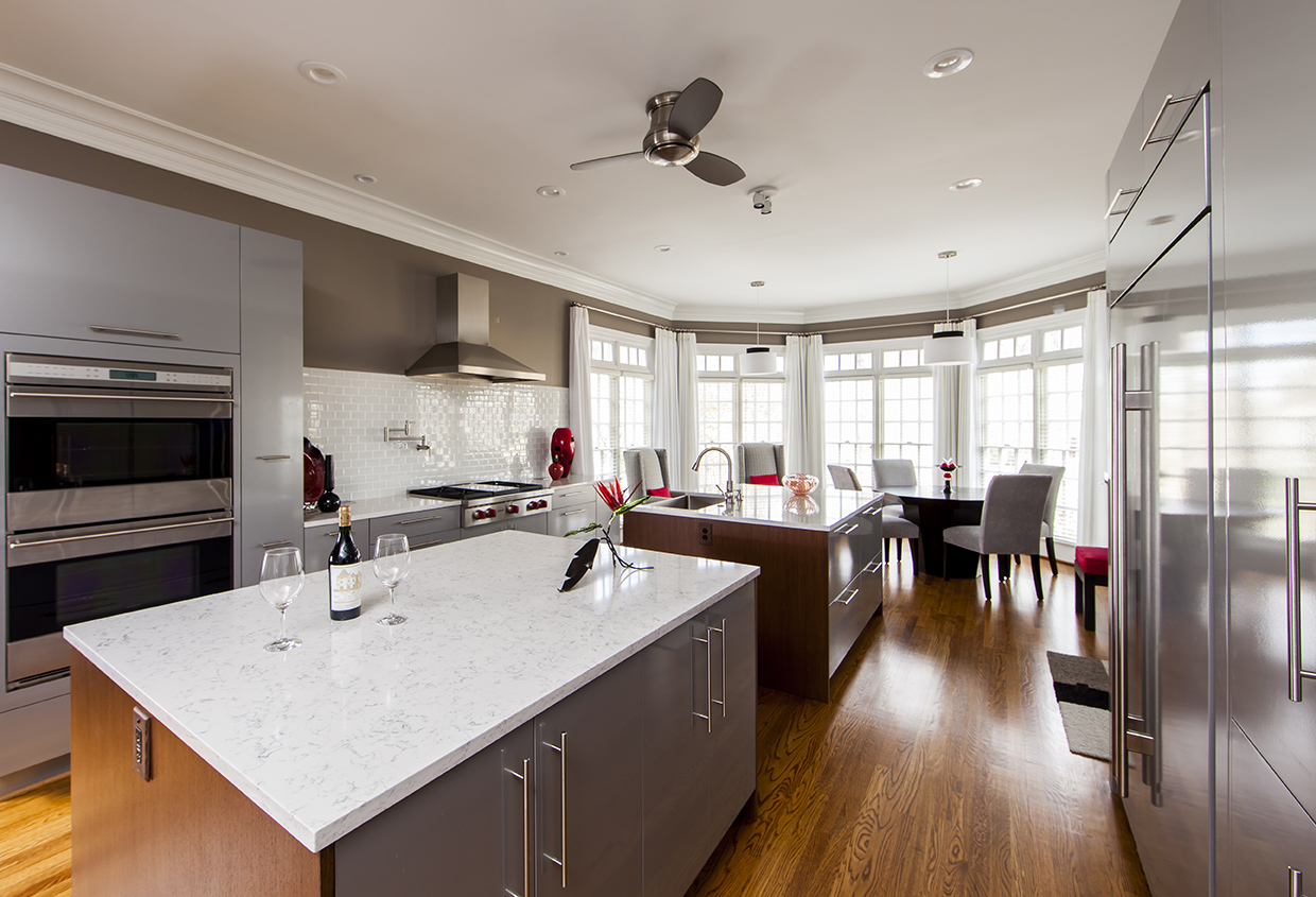 The kitchen cabinets here are a flat panel design. With a sleek high shine finish, they reflect the light coming from the clerestory windows on the opposite wall. You can clearly define a modern space reflective of Swedish influence.