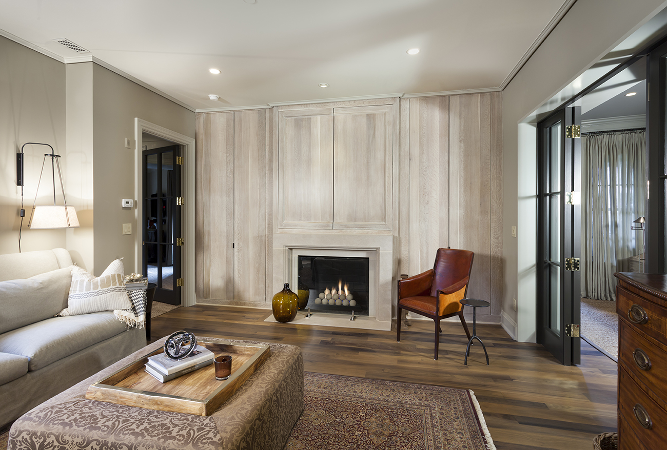 Here the paneled walls and the minimalistic fireplace allow for the eye to scan the room and see the lines of the room. You see the architecture and lines stopping only to see the small details. The details of the glass fire screen and gas fire cylinders feel modern. Traditional elements like the wood allow the room to still feel warm and inviting.