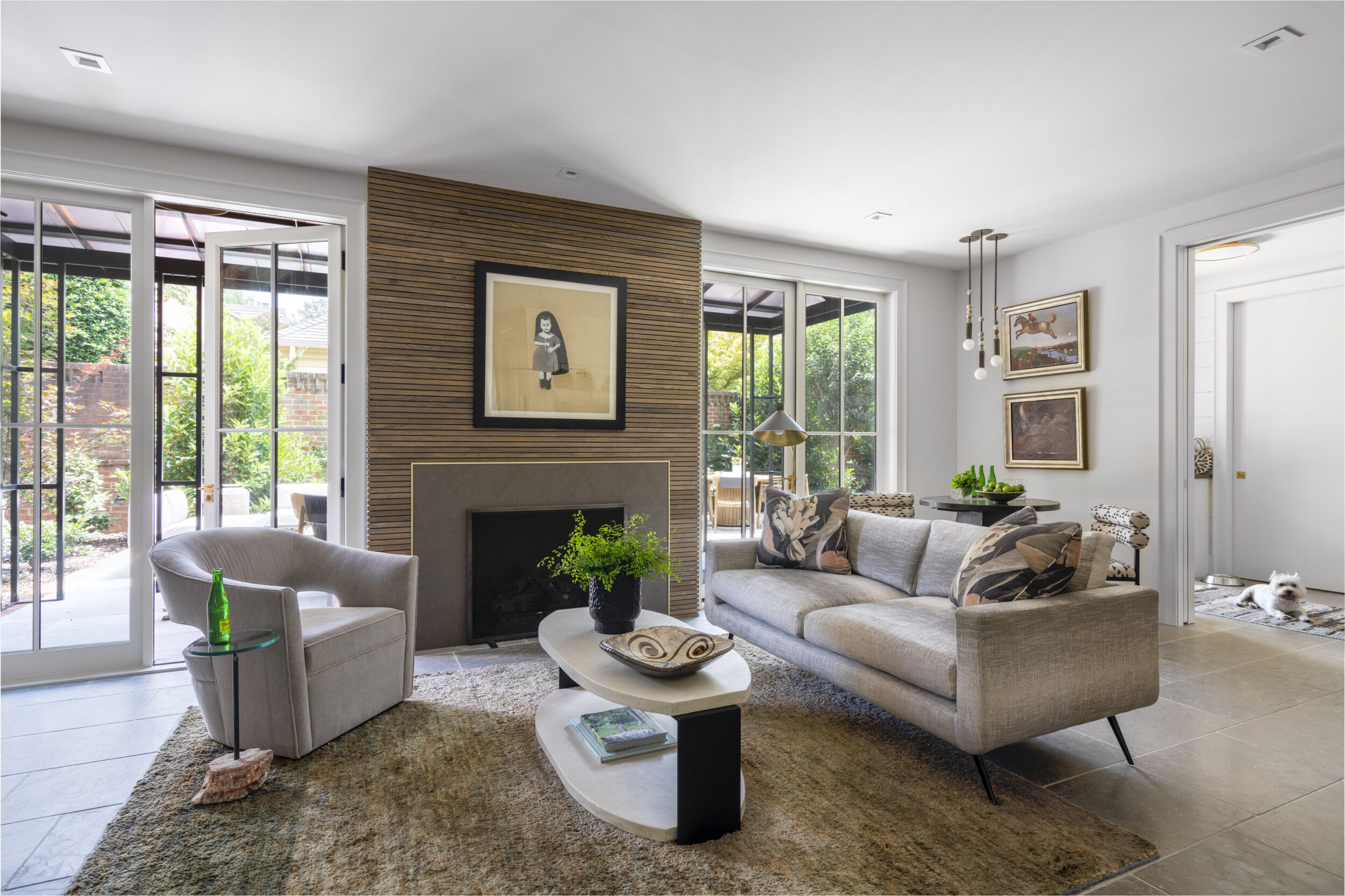 The renovated living room showcases an open floor plan with a custom Isokern fireplace, limestone flooring, and custom wood lite doors that allow the space to flow into the outdoor terrace.