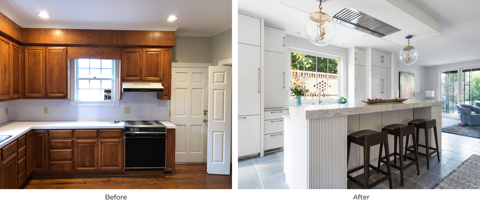 The original dark L-shaped kitchen was transformed into a bright modern space with a kitchen island providing ample room to prep and cook meals.
