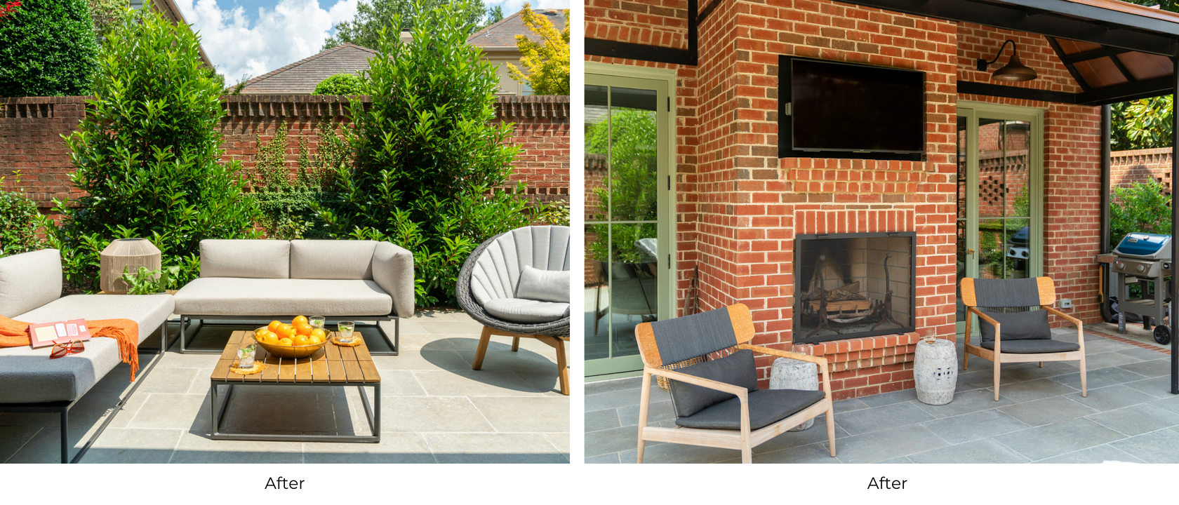 The remodeled outdoor living space displays custom aluminum powder-coated canopies with copper stand and seam roofing. Rectangular pattern limestone was installed throughout the first floor of the home as well as on the front and rear terraces for a continuous look. A new brick Isokern fireplace was added to create a cozy and welcoming space for relaxing and entertaining.