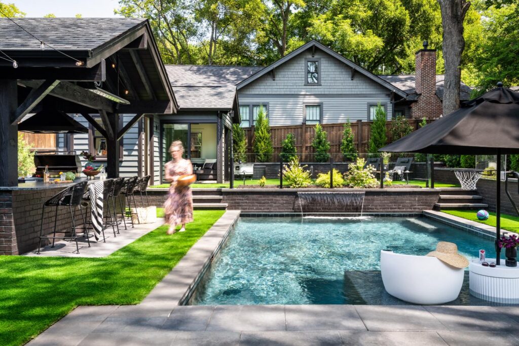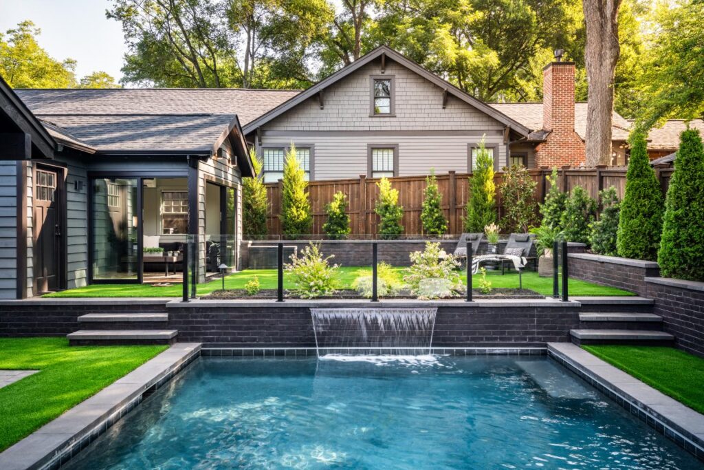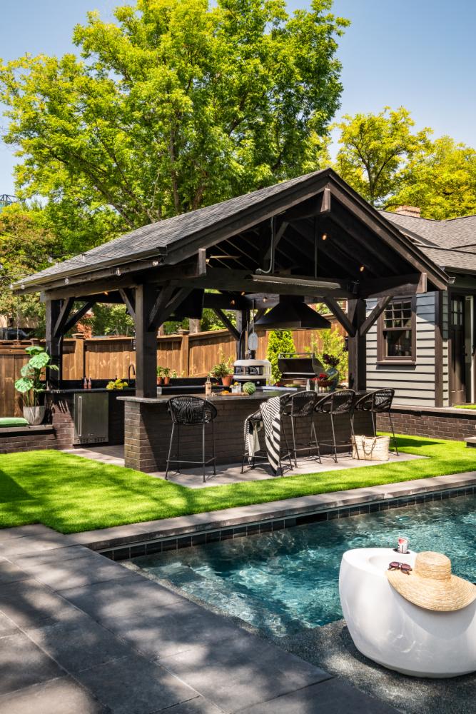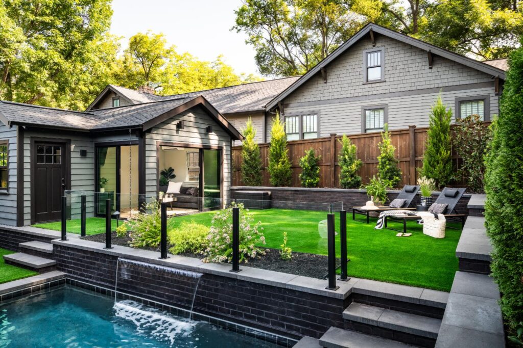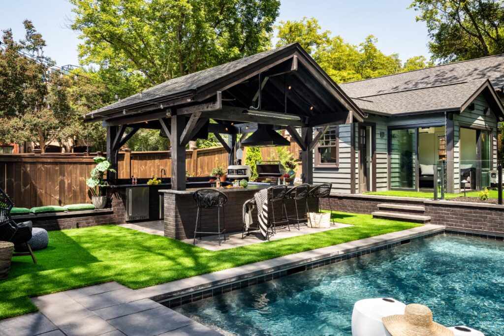 This project transformed an existing backyard into a modern outdoor living space featuring a pool, custom kitchen, and a large open turf area. This space seamlessly connects to an adjacent ADU through triple sliding glass doors, allowing for effortless indoor/outdoor entertaining.