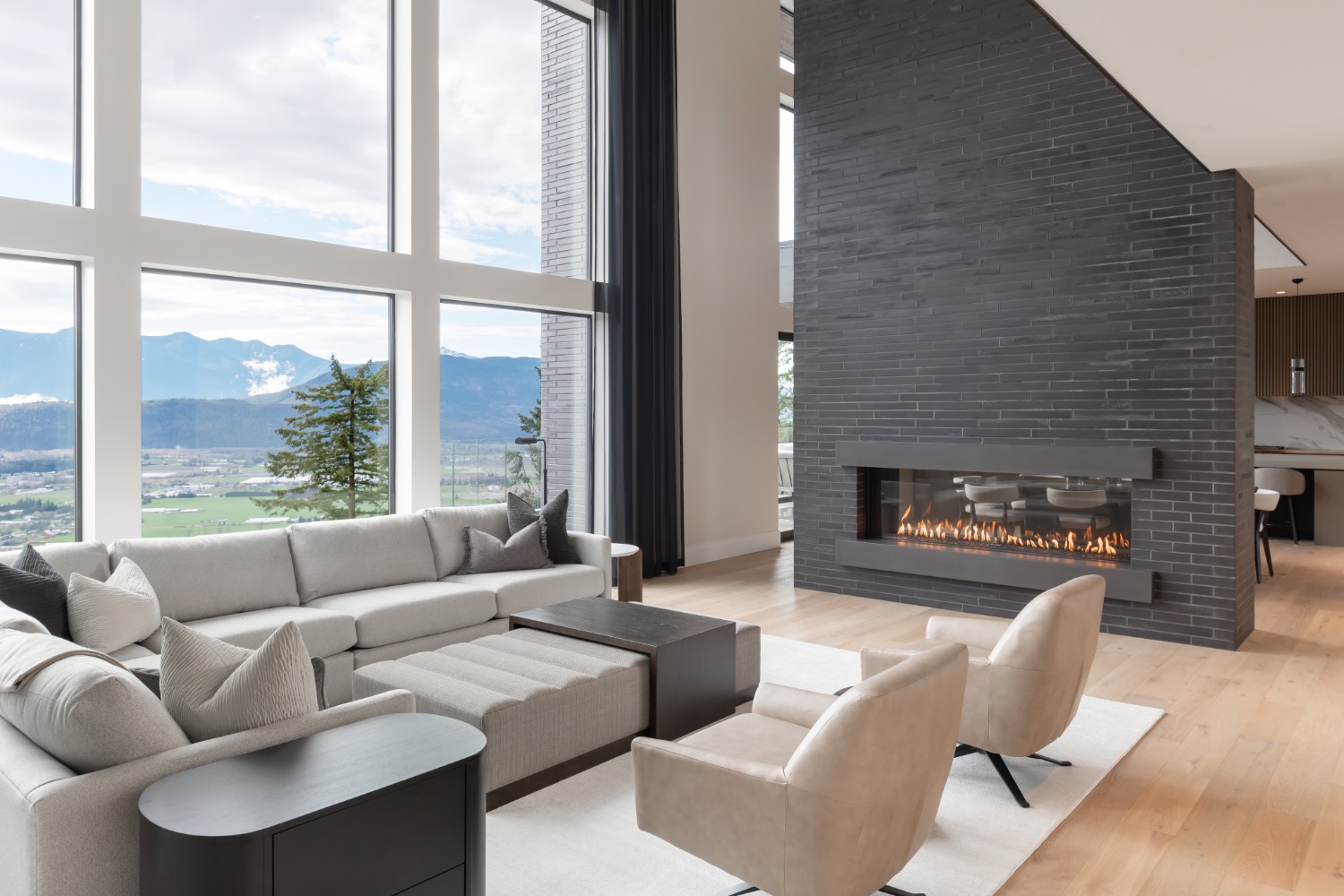 From the moment you step inside, your eyes are drawn to the soaring 20-foot windows. They frame dramatic views of the Fraser Valley below. A striking black fin wall divides the living and dining spaces, housing a double-sided fireplace that adds warmth and architectural interest.