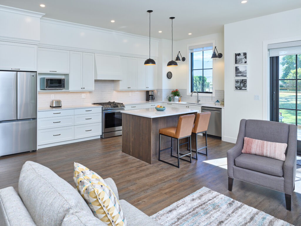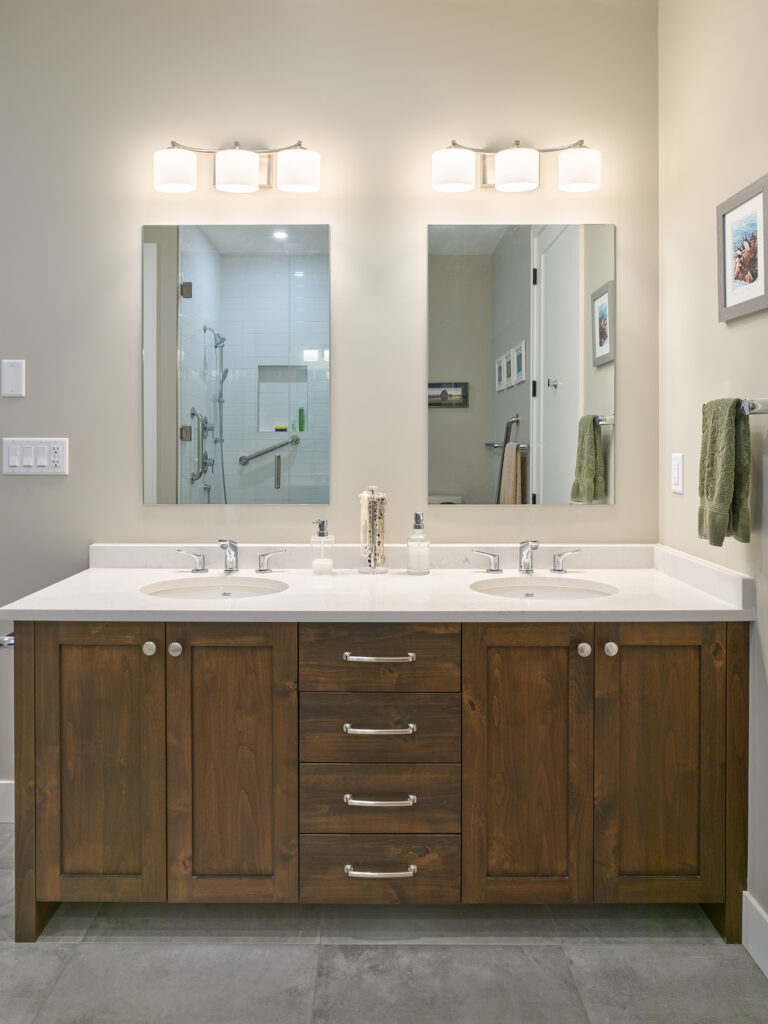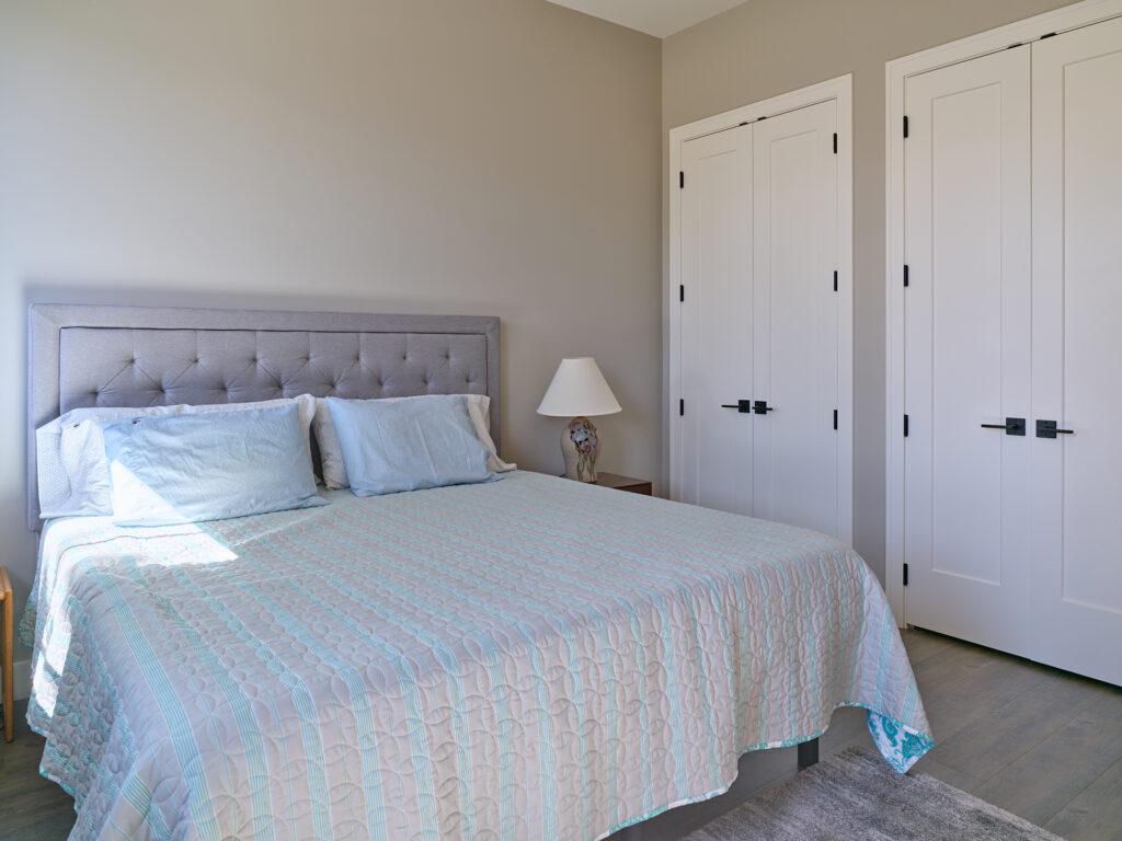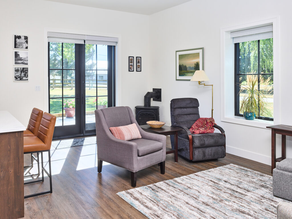 Conversion of a woodwork shop into a secondary suite for aging parents. The entire space was insulated well for fire and sound and a two-bedroom suite was incorporated into the existing workshop. Heated with in-floor hydronic heat and a dedicated AC unit. Features a grade-level patio accessed through a pair of French doors.