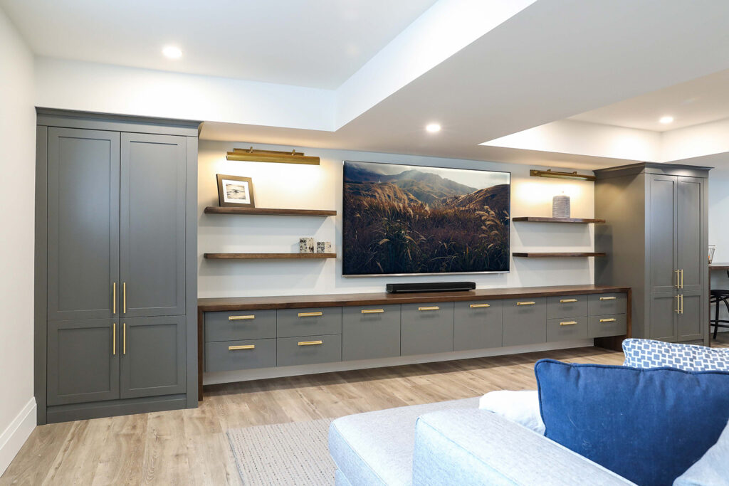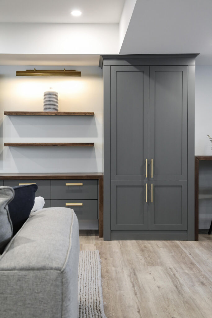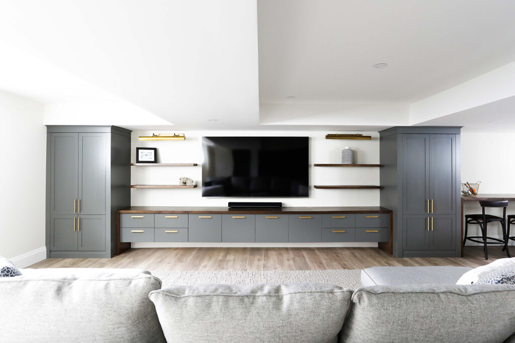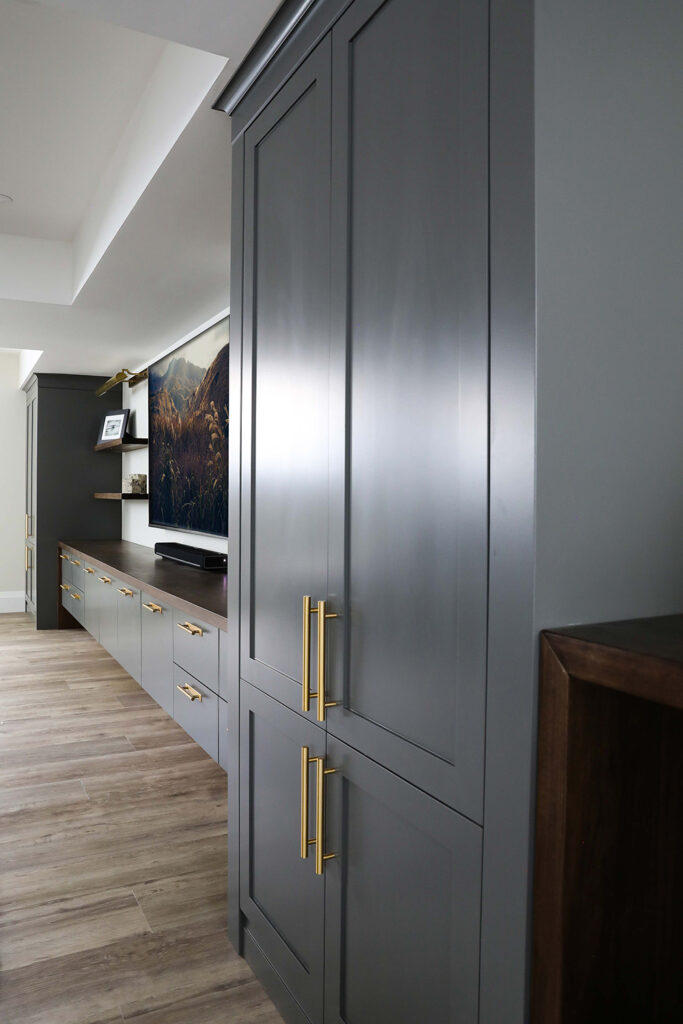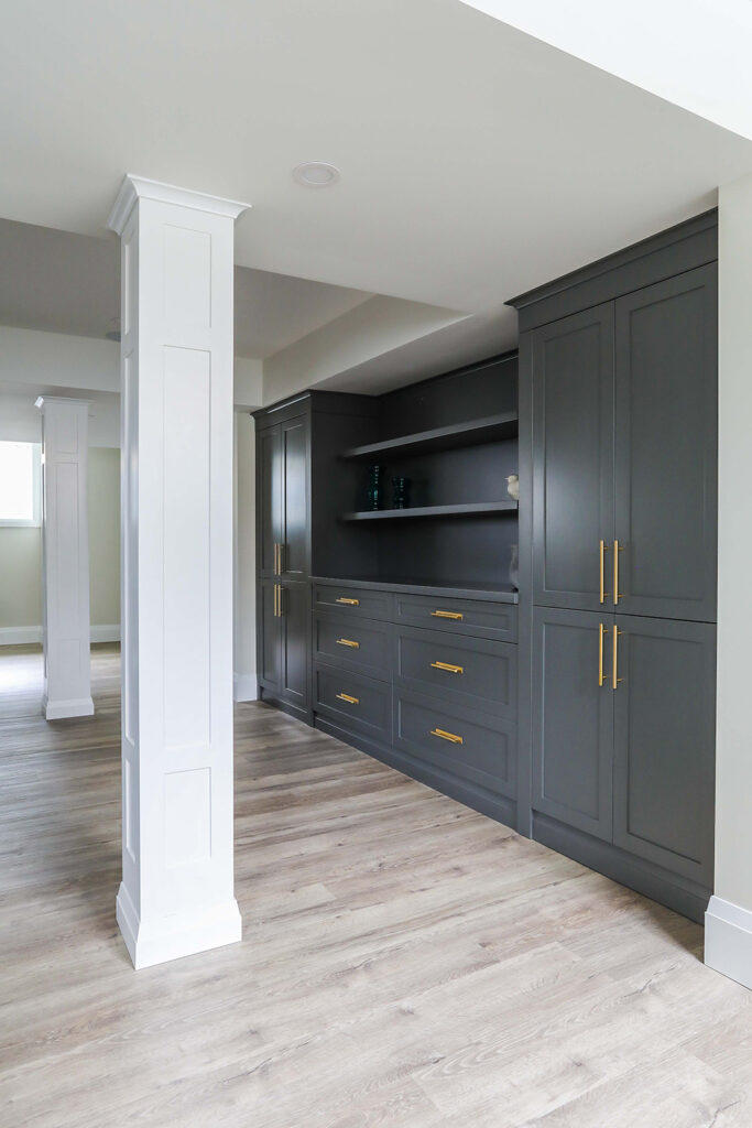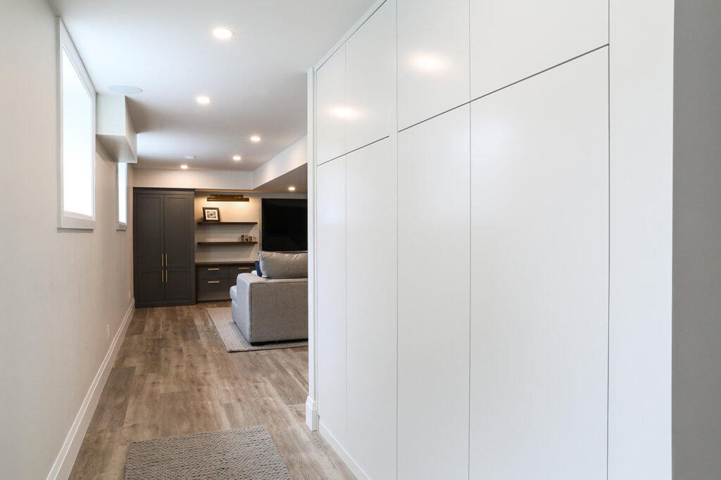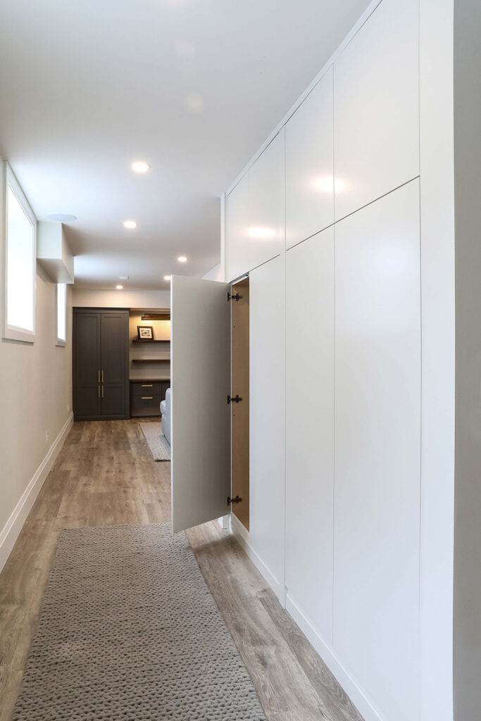 The client’s objective was to create a space that could accommodate family time as well as a kids play area. They also required additional specific storage solutions, and wanted everything custom designed and built-in in order to create an equal balance of functionality and beauty. Both the laundry and basement have been designed with elegance.