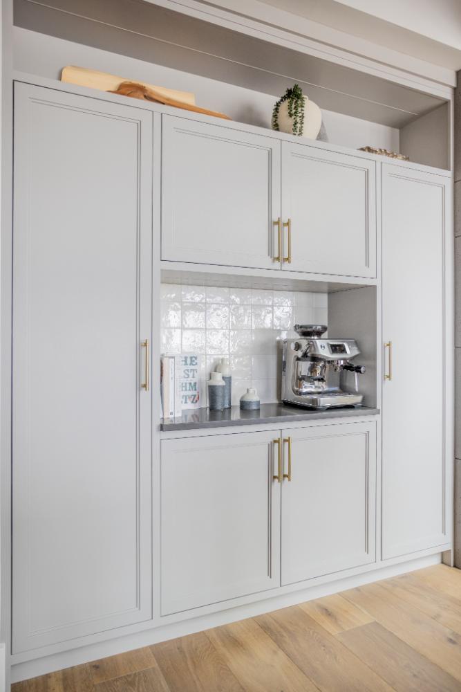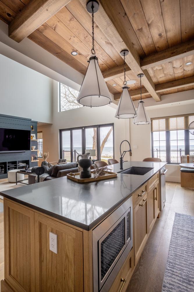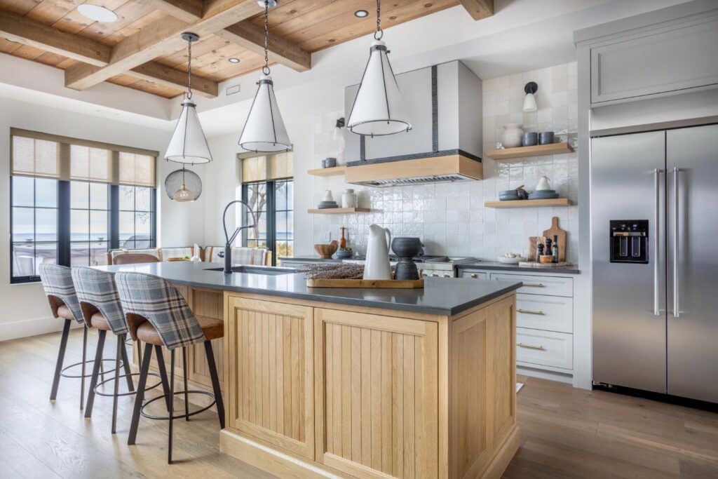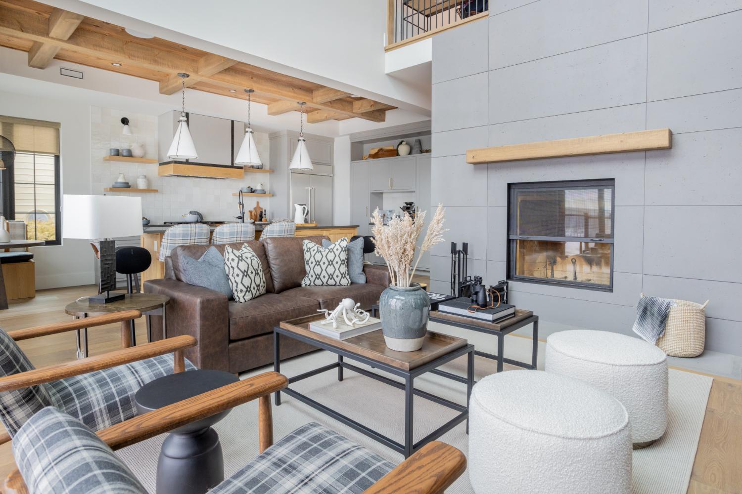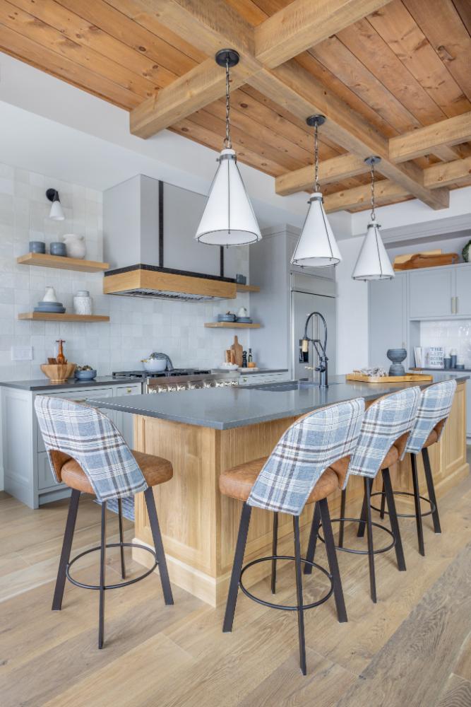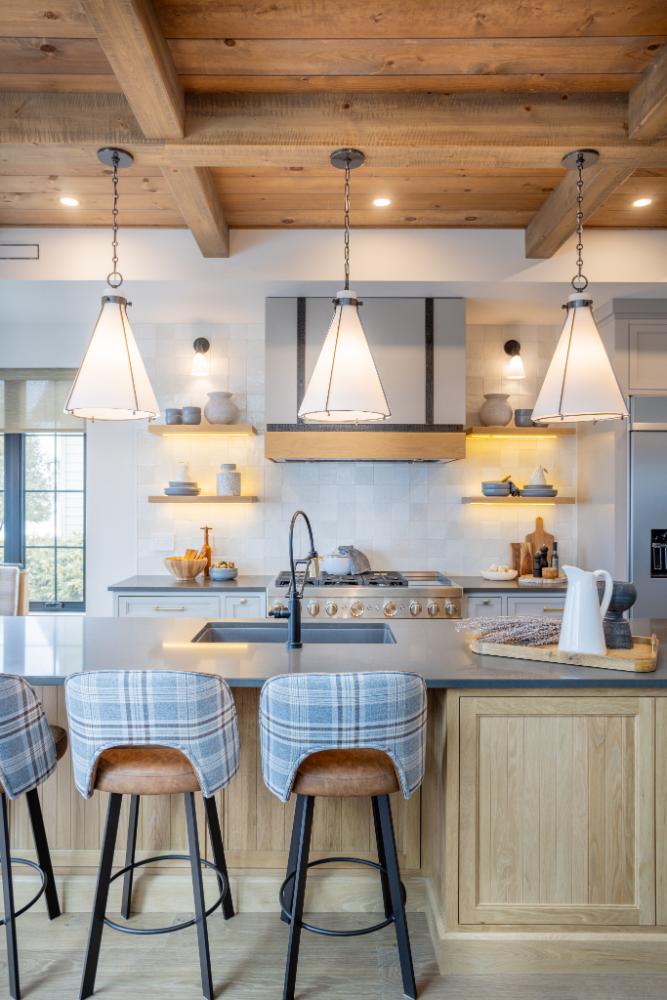 From the details such as the coffee bar, adorned with a meticulously tiled backsplash that adds a touch of sophistication to your morning routine. Wooden ceilings soar overhead, infusing the space with warmth and character, while intriguing light fixtures cast a soft glow, creating an inviting ambiance throughout.