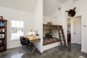 This remodel transforms a unique space in a practical way, inspiring the feelings of escape and adventure. The distressed wood trim of the built-in bunk bed paired with a modern sawbuck desk give this room a “summer camp meets creative nook” feel.