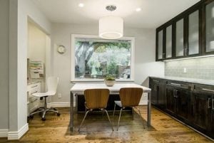 The kitchen often acts as the unspoken hub of your home. So, incorporating a home office space seems both practical and efficient in terms of use. Having the ability to serve as a space for household management and professional workflow, this remodel is a less invasive approach to meeting your home office needs.This office space exudes functionality while playing up hints of mid-century modern flair. Great lighting in your kitchen is an even better excuse to jump on this remodel. Not only does it provide an office with a view, but it also has the added benefit of nearby snacks!