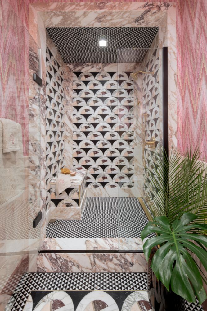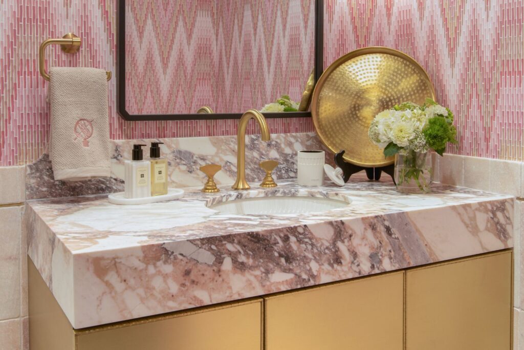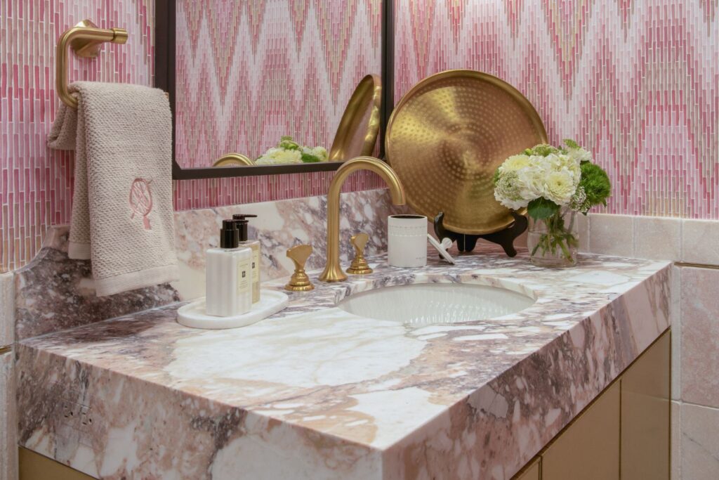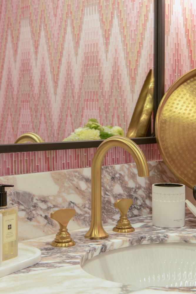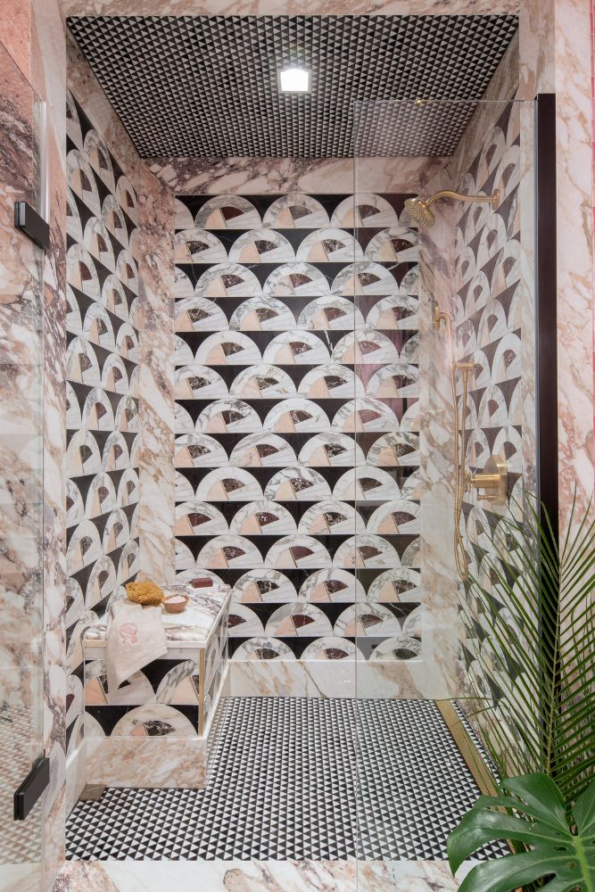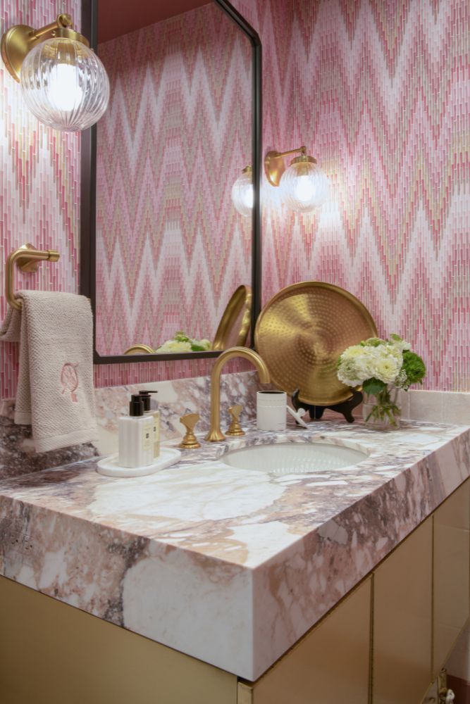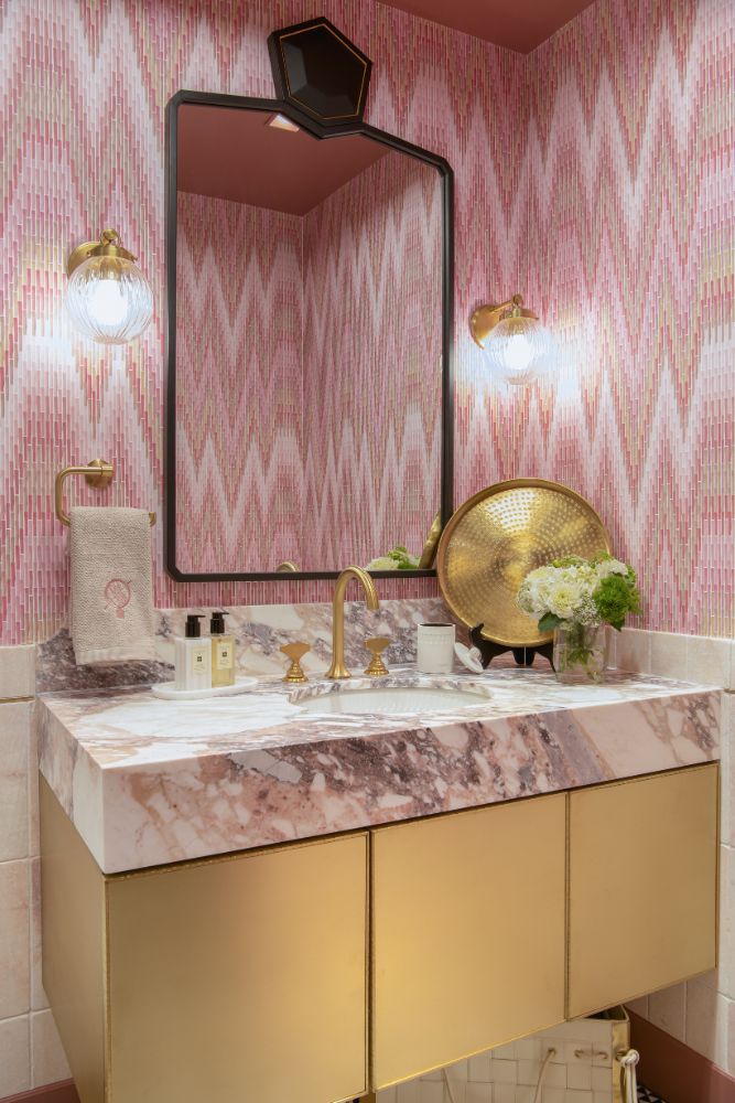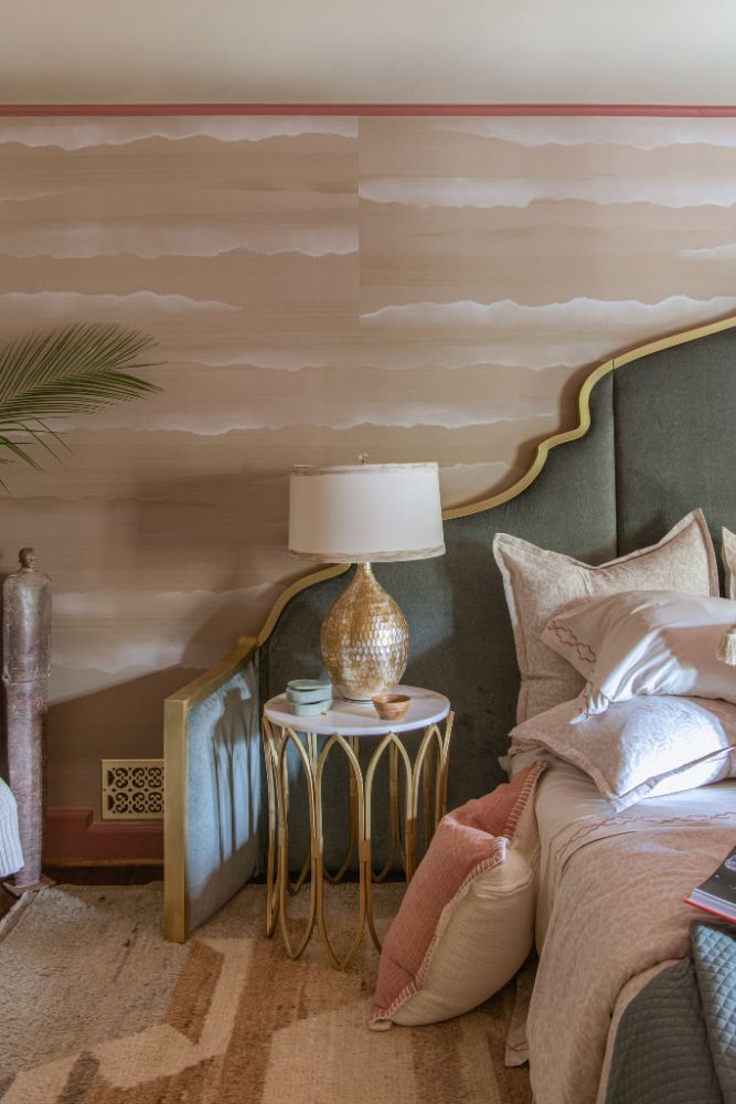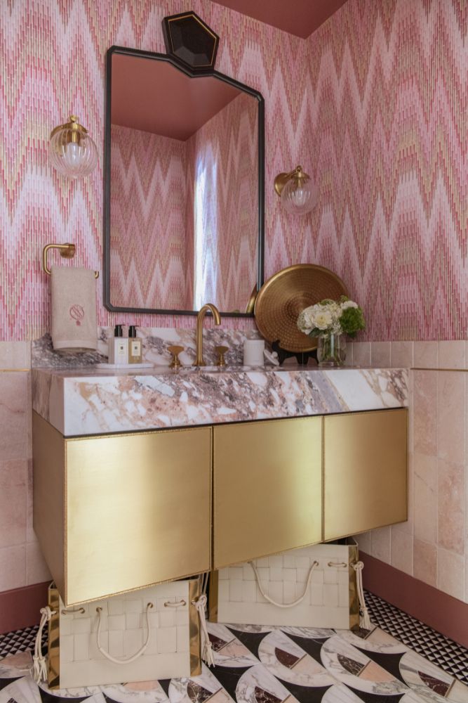 This secondary suite was designed and built for the 2023 Kips Bay Decorators Showhouse Dallas. ‘Memoirs of Marrakesh’, designed by Kristi Nelson of KMNelson Designs, is a bright, vibrant bedroom and bathroom space inspired by the architecture and colors of Marrakesh in the 1970s. When we met the designer for this space, the room was a blank slate as it had already been stripped down to the framing. We touched almost every inch of this entire suite painting a sunset ombre effect on the ceiling, lining the walls with Frommental silk wallpaper, and completely making over the bathroom and closet with all new cabinetry, countertops and tile. In the bathroom, the solid brass wrapped floating vanity topped with waterfall edge stone slabs from Artistic Tile accented with the art deco style tile on the floor and walls of the shower took patience to line up just right. Wainscotting with tumbled marble tile and brass accent gives the perfect platform for the bright herringbone hand painted custom wallpaper from Frommental. Matte brass Kohler fixtures were installed including the Kohler Veil smart toilet. We even disguised the outlet in the side of the vanity recessed in the stone by having it hand painted to hide it. The closet was lined with custom materials and installed by Inspired Closets DFW.