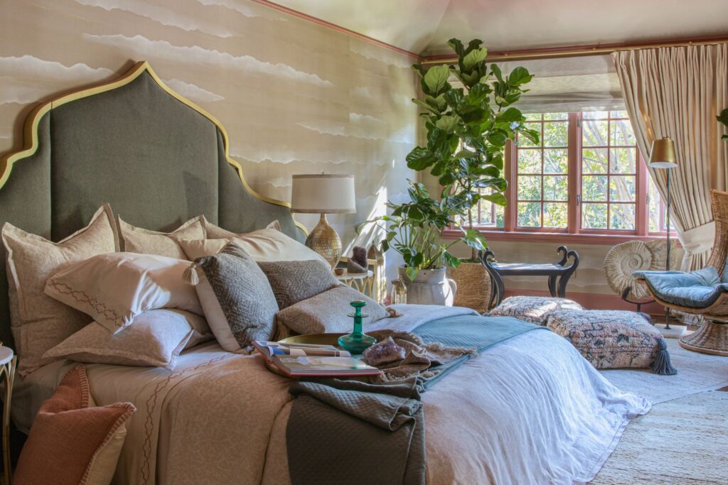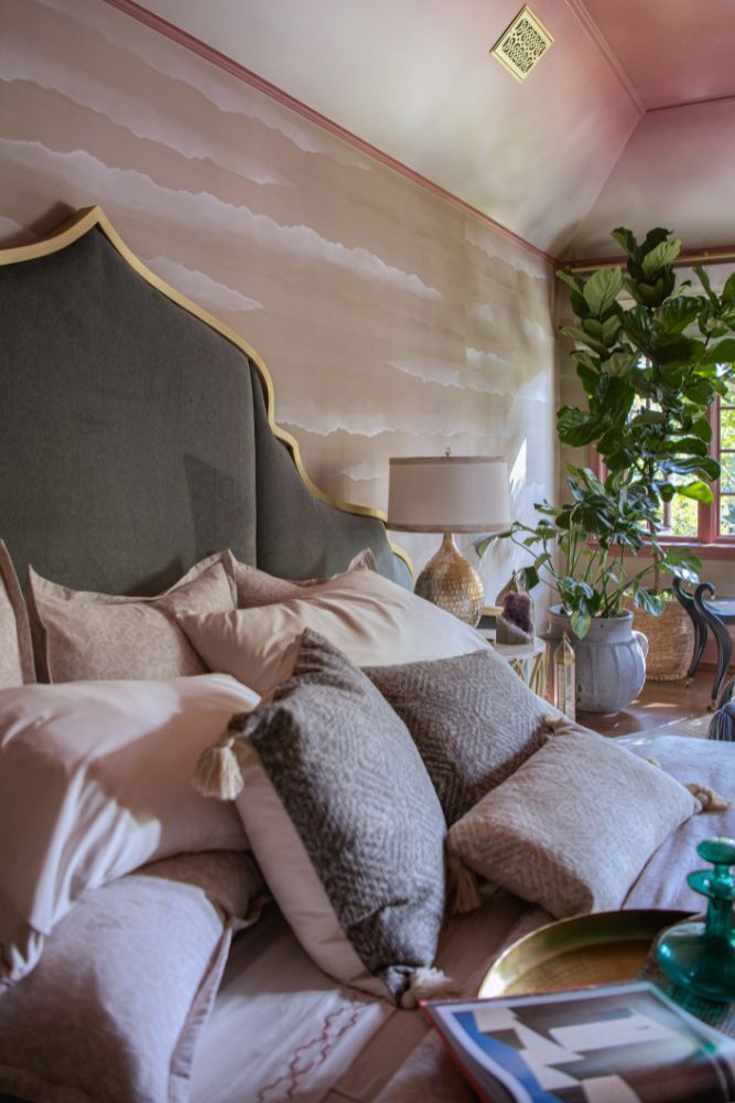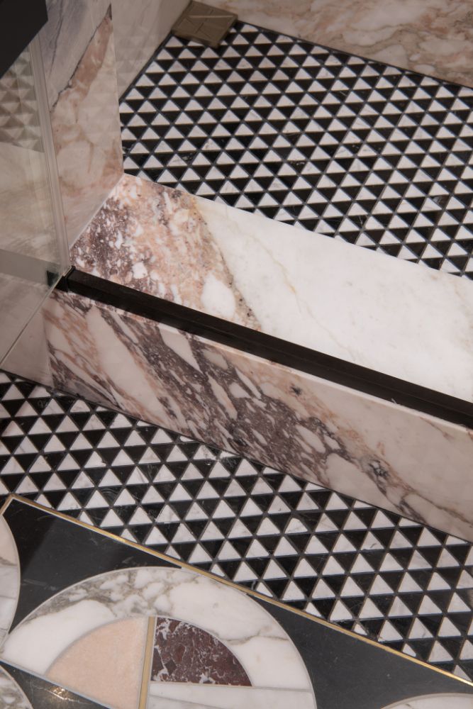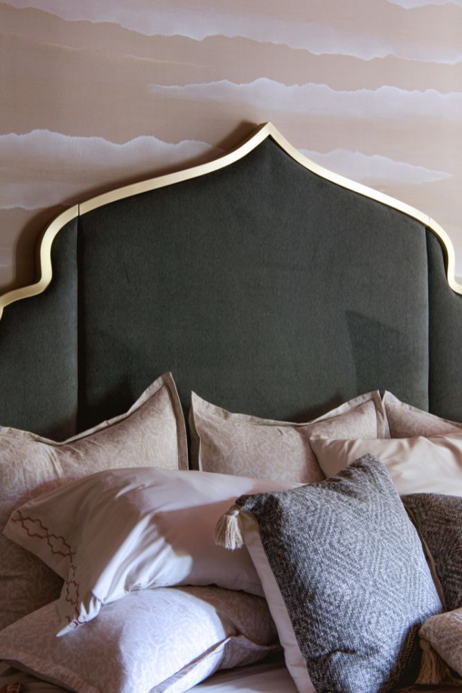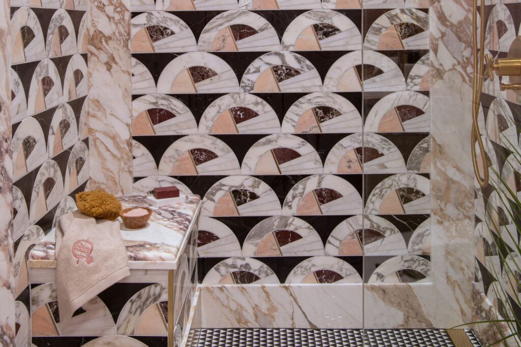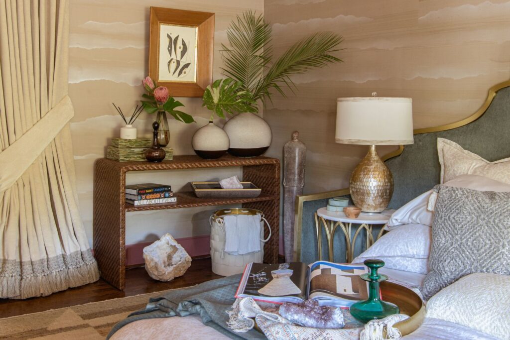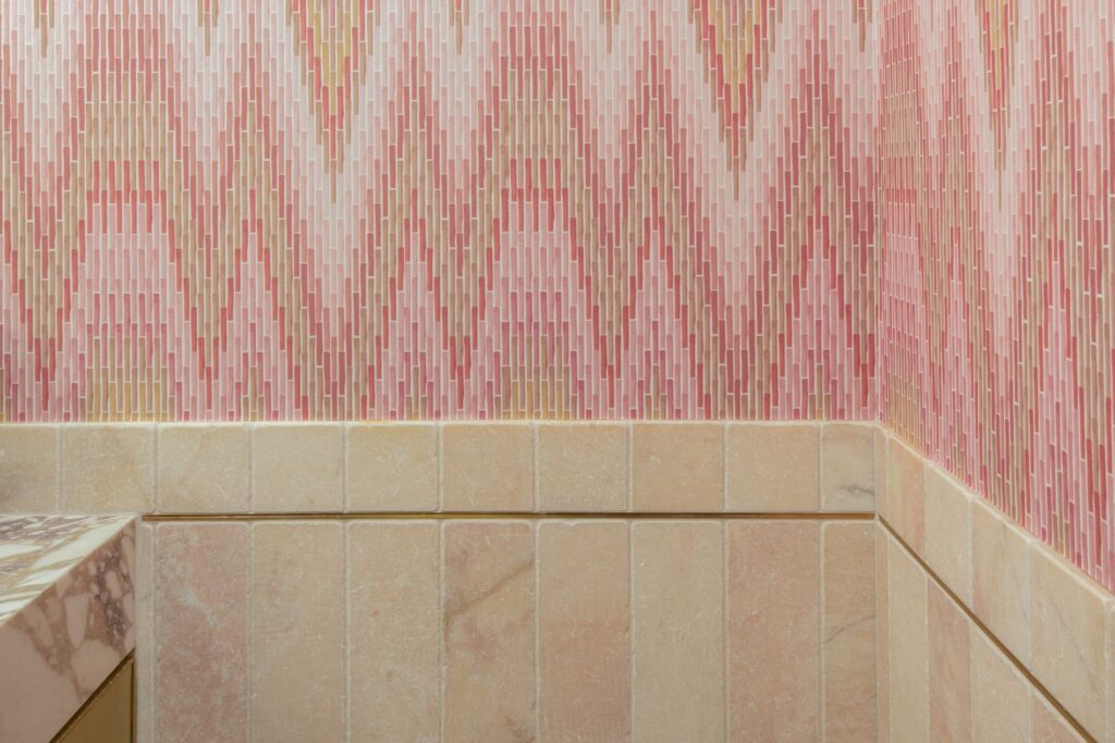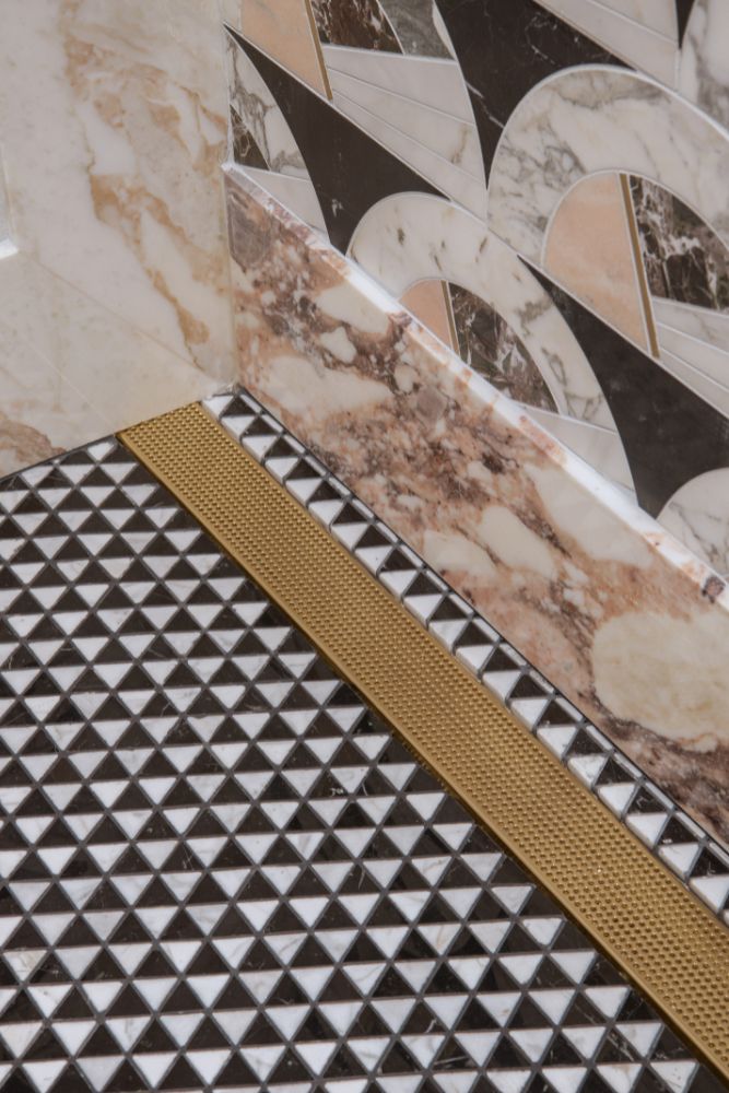 This secondary suite was designed and built for the 2023 Kips Bay Decorators Showhouse Dallas. ‘Memoirs of Marrakesh’, designed by Kristi Nelson of KMNelson Designs, is a bright, vibrant bedroom and bathroom space inspired by the architecture and colors of Marrakesh in the 1970s. When we met the designer for this space, the room was a blank slate as it had already been stripped down to the framing. We touched almost every inch of this entire suite painting a sunset ombre effect on the ceiling, lining the walls with Frommental silk wallpaper, and completely making over the bathroom and closet with all new cabinetry, countertops and tile. In the bathroom, the solid brass wrapped floating vanity topped with waterfall edge stone slabs from Artistic Tile accented with the art deco style tile on the floor and walls of the shower took patience to line up just right. Wainscotting with tumbled marble tile and brass accent gives the perfect platform for the bright herringbone hand painted custom wallpaper from Frommental. Matte brass Kohler fixtures were installed including the Kohler Veil smart toilet. We even disguised the outlet in the side of the vanity recessed in the stone by having it hand painted to hide it. The closet was lined with custom materials and installed by Inspired Closets DFW.
