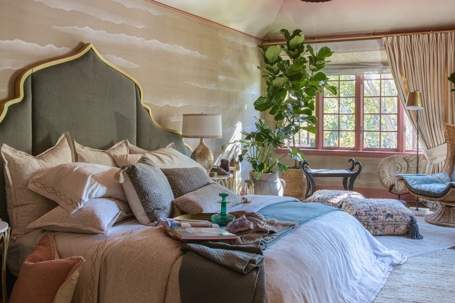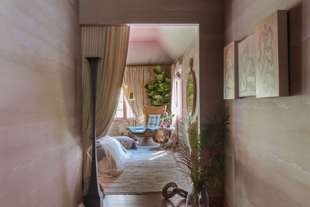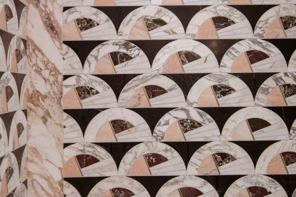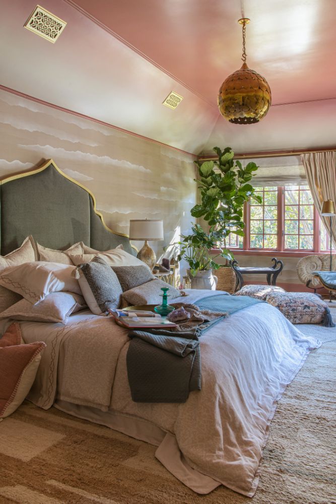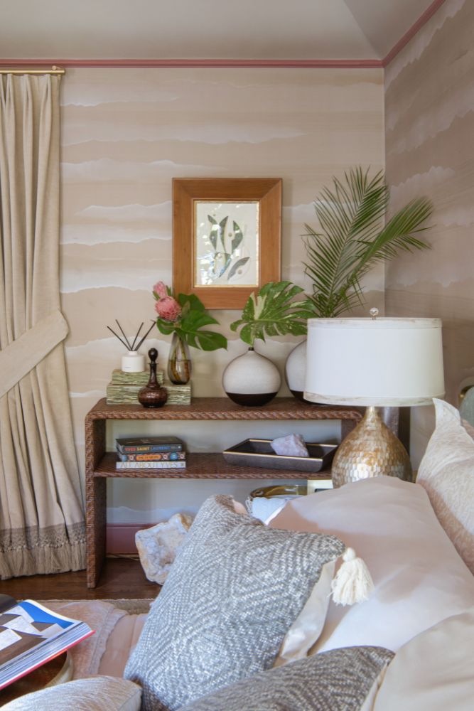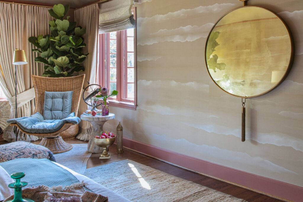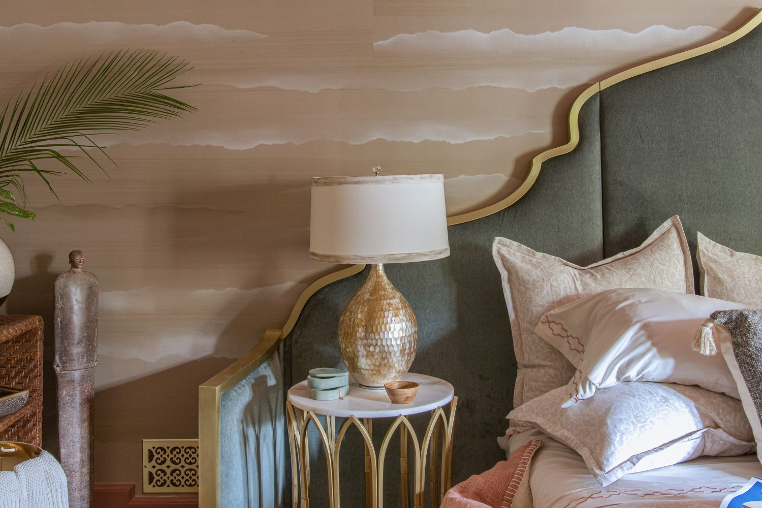 This secondary suite was designed and built for the 2023 Kips Bay Decorators Showhouse Dallas. ‘Memoirs of Marrakesh’, designed by Kristi Nelson of KMNelson Designs, is a bright, vibrant bedroom and bathroom space inspired by the architecture and colors of Marrakesh in the 1970s. When we met the designer for this space, the room was a blank slate as it had already been stripped down to the framing. We touched almost every inch of this entire suite painting a sunset ombre effect on the ceiling, lining the walls with Frommental silk wallpaper, and completely making over the bathroom and closet with all new cabinetry, countertops and tile. In the bathroom, the solid brass wrapped floating vanity topped with waterfall edge stone slabs from Artistic Tile accented with the art deco style tile on the floor and walls of the shower took patience to line up just right. Wainscotting with tumbled marble tile and brass accent gives the perfect platform for the bright herringbone hand painted custom wallpaper from Frommental. Matte brass Kohler fixtures were installed including the Kohler Veil smart toilet. We even disguised the outlet in the side of the vanity recessed in the stone by having it hand painted to hide it. The closet was lined with custom materials and installed by Inspired Closets DFW.