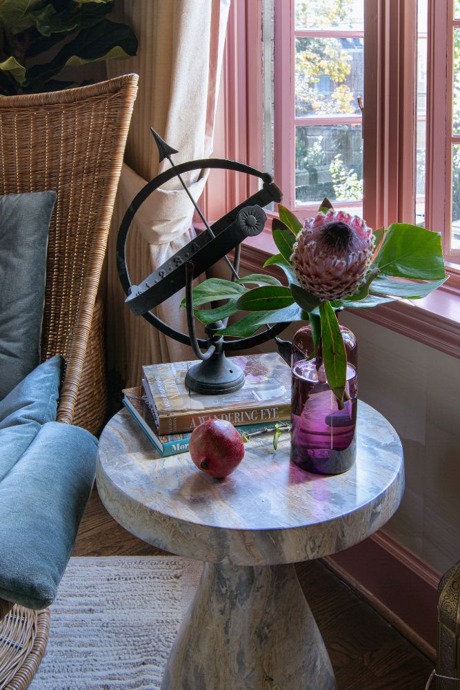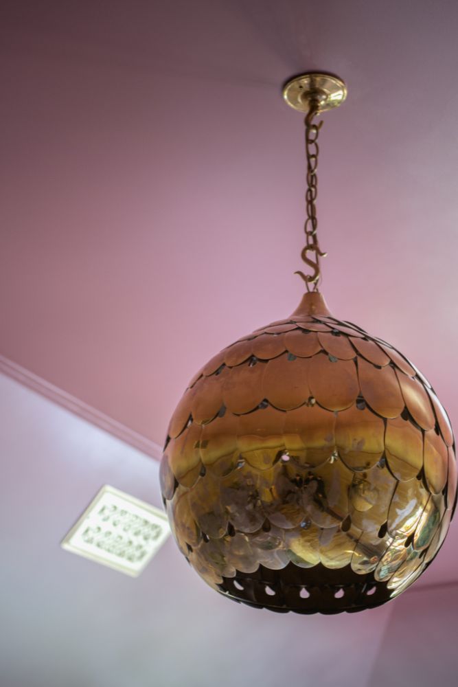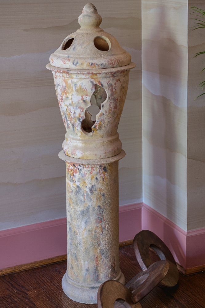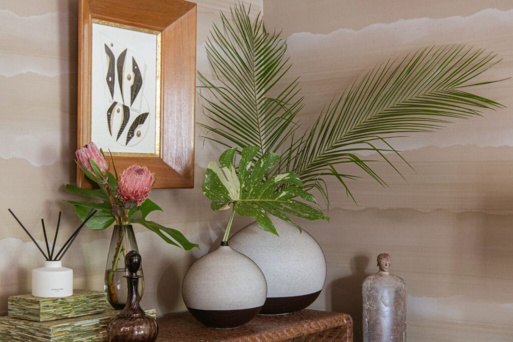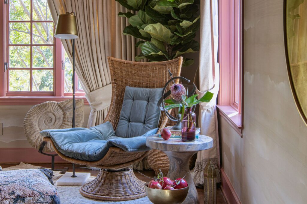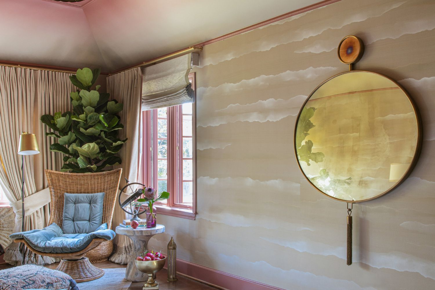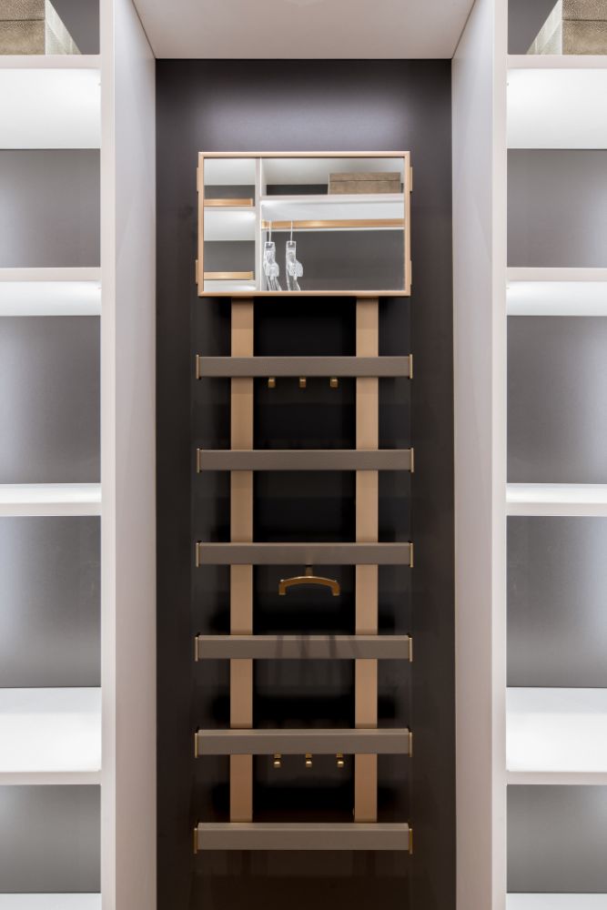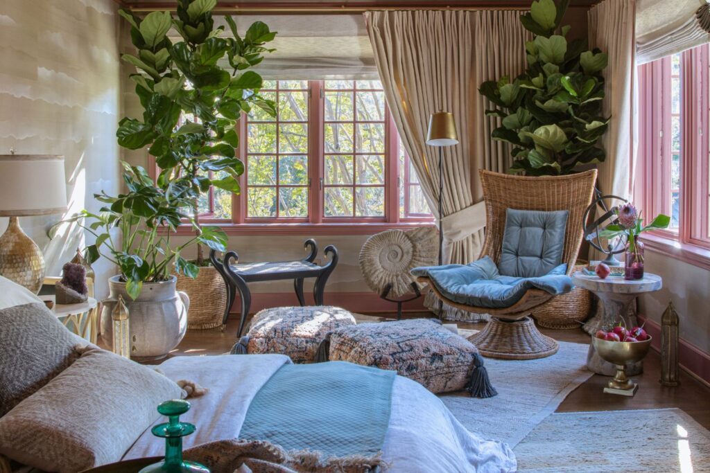 This secondary suite was designed and built for the 2023 Kips Bay Decorators Showhouse Dallas. ‘Memoirs of Marrakesh’, designed by Kristi Nelson of KMNelson Designs, is a bright, vibrant bedroom and bathroom space inspired by the architecture and colors of Marrakesh in the 1970s. When we met the designer for this space, the room was a blank slate as it had already been stripped down to the framing. We touched almost every inch of this entire suite painting a sunset ombre effect on the ceiling, lining the walls with Frommental silk wallpaper, and completely making over the bathroom and closet with all new cabinetry, countertops and tile. In the bathroom, the solid brass wrapped floating vanity topped with waterfall edge stone slabs from Artistic Tile accented with the art deco style tile on the floor and walls of the shower took patience to line up just right. Wainscotting with tumbled marble tile and brass accent gives the perfect platform for the bright herringbone hand painted custom wallpaper from Frommental. Matte brass Kohler fixtures were installed including the Kohler Veil smart toilet. We even disguised the outlet in the side of the vanity recessed in the stone by having it hand painted to hide it. The closet was lined with custom materials and installed by Inspired Closets DFW.