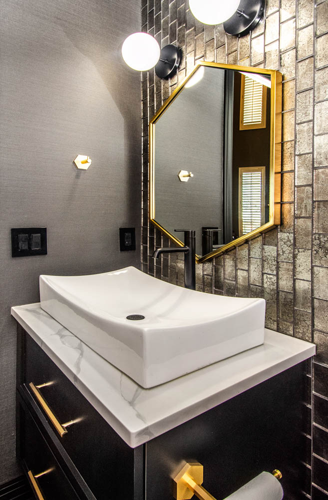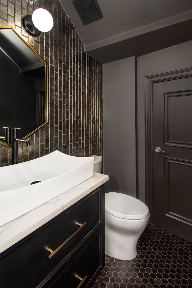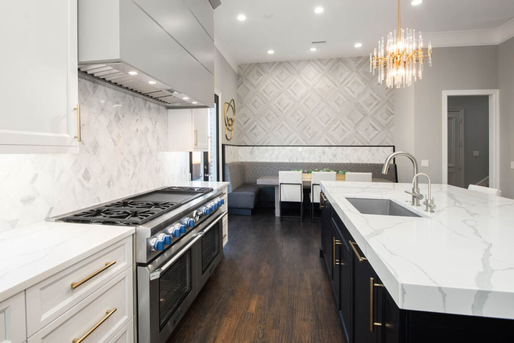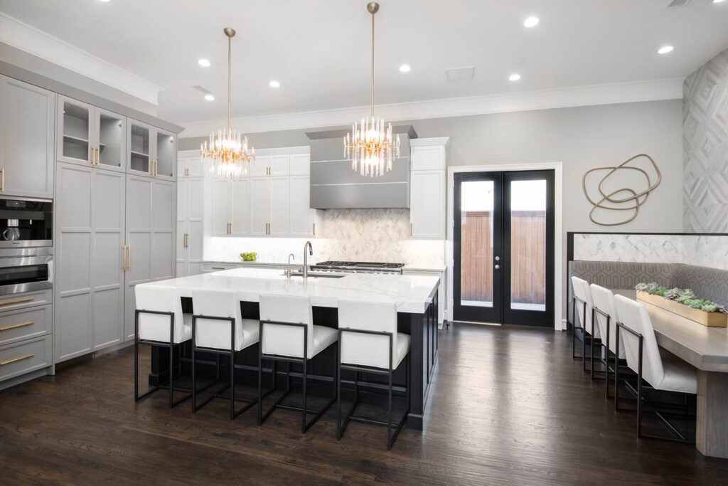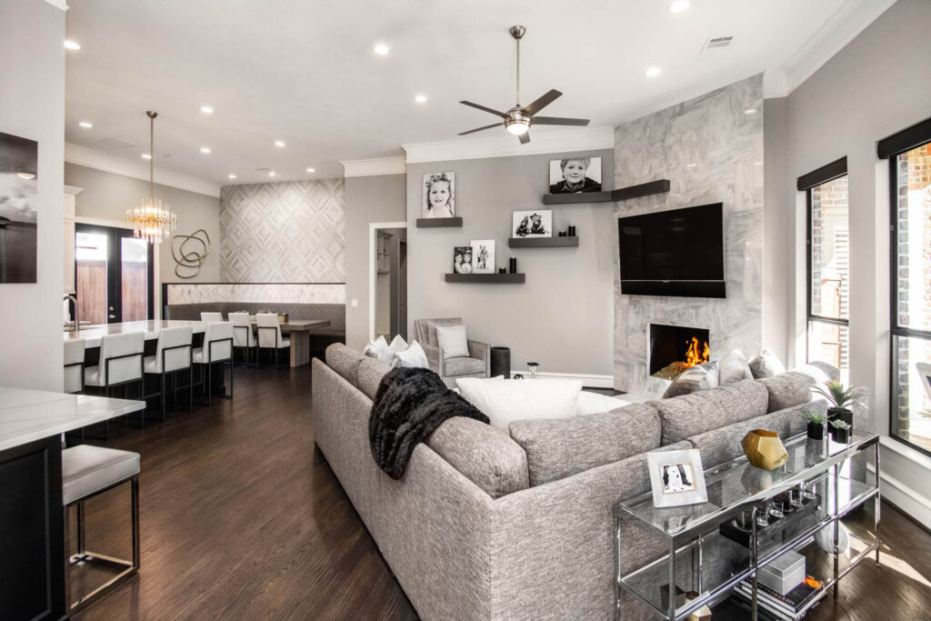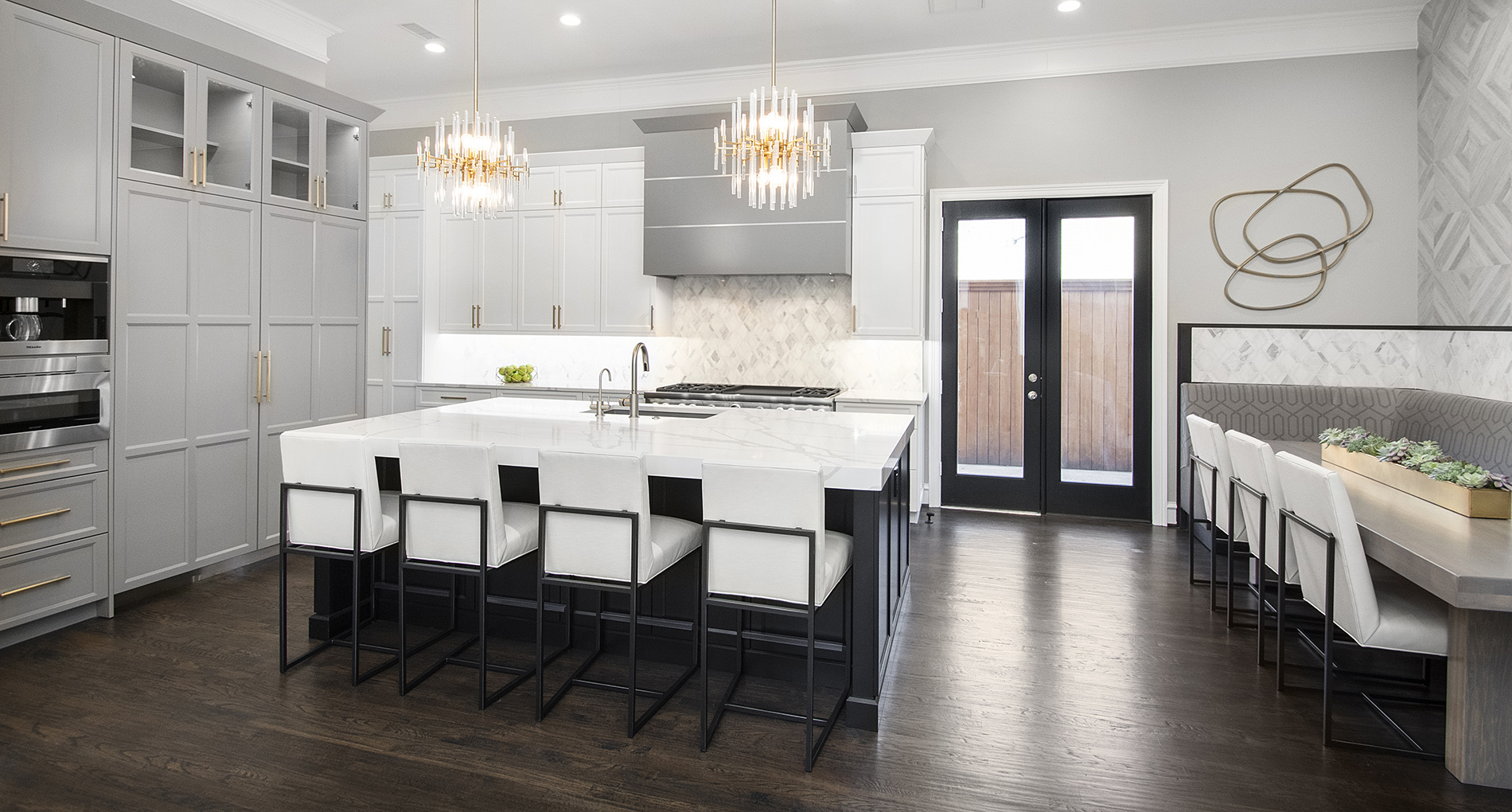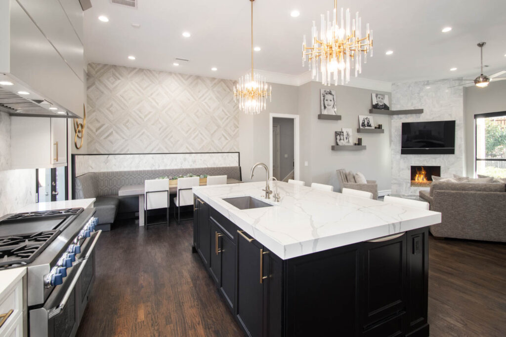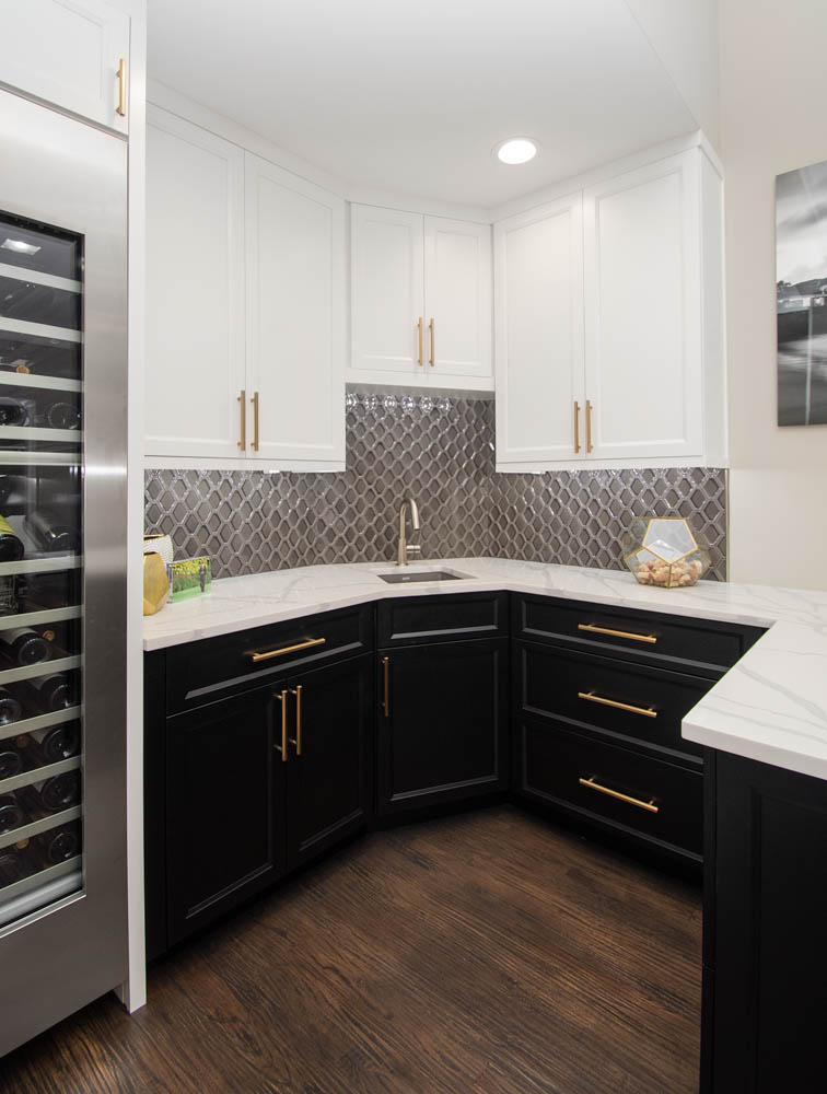 Our clients wanted to open their living spaces; including their kitchen, bar, and den. They wanted a cleaner look but feared an all-white kitchen was trendy. Their kitchen was not utilized well and was very dark. We gutted the kitchen and added a large island and banquet seating table. In the den, we eliminated the dark built-ins and fireplace surround. The walls were flushed out, floating shelves were added, and the fireplace is now covered in marble. The bar was gutted, opened up and completely redone. The powder bath also got a fun makeover! Our clients absolutely love their new space.