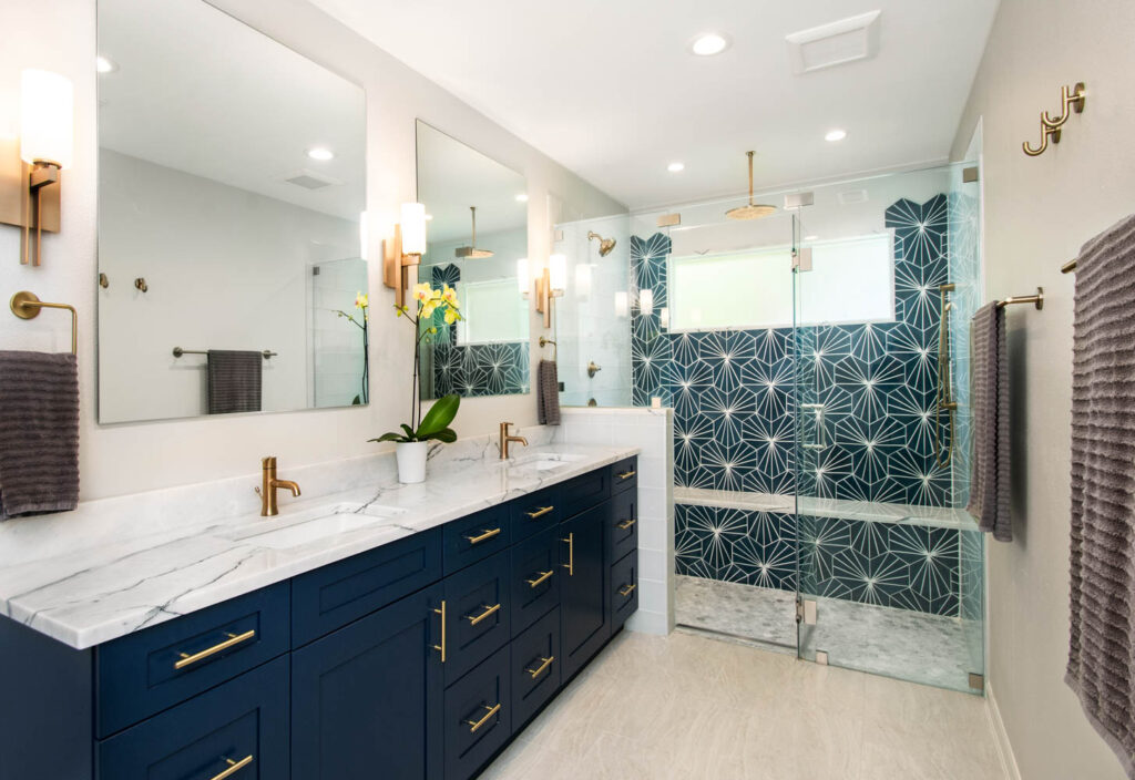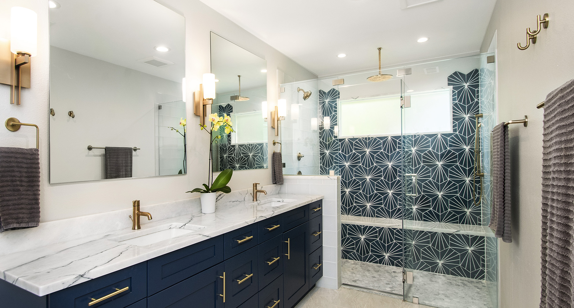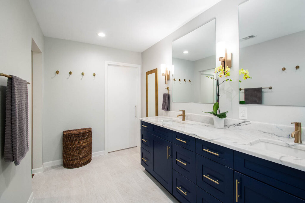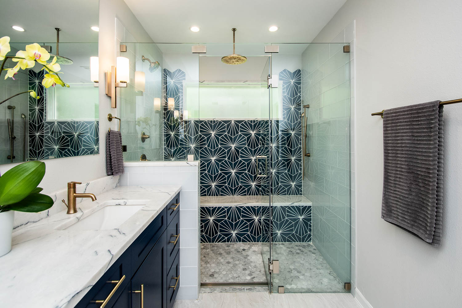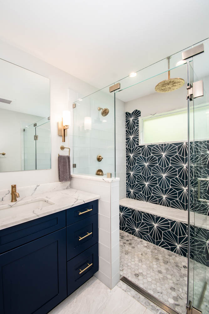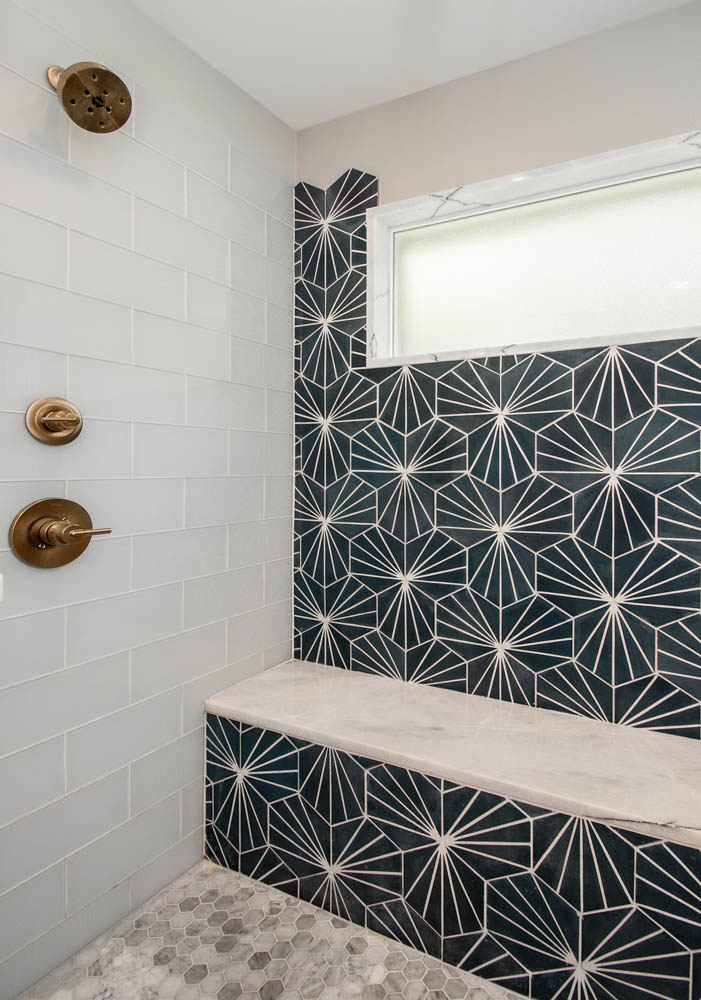 From there, the space flows into their new beautiful, contemporary bathroom. They decided that a bathtub wasn’t important to them, but a large double shower was. So, the new shower became the focal point of the bathroom. The new shower has contemporary Marine Bone Electra cement hexagon tiles and brushed bronze hardware. A large bench, hidden storage, and a rain shower head were must-have features. Pure Snow glass tile was installed on the two side walls while Carrara Marble Bianco hexagon mosaic tile was installed for the shower floor.