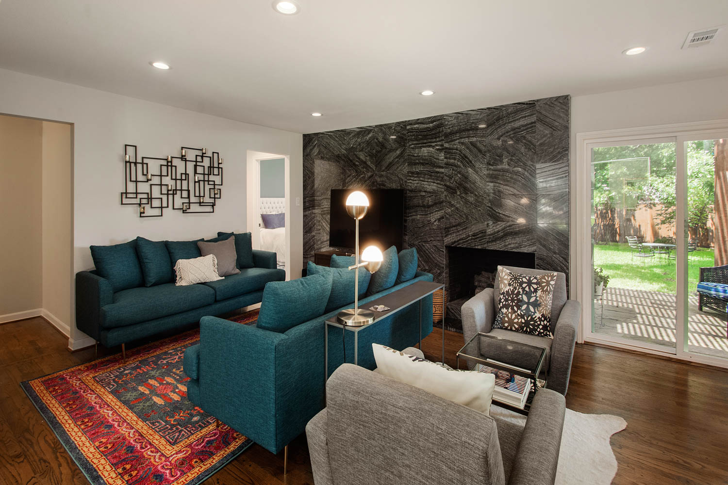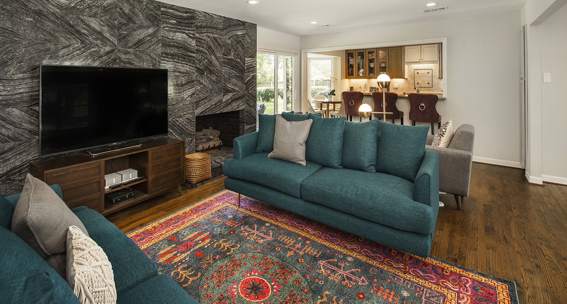 We started by completely removing the wall between the formal living and formal dining space and enlarging the opening between the formal living and the main living room. We also removed a built-in desk and the fur down in the main living room. Then, we removed the window to the left of the fireplace and added a new entrance into the master suite corridor.