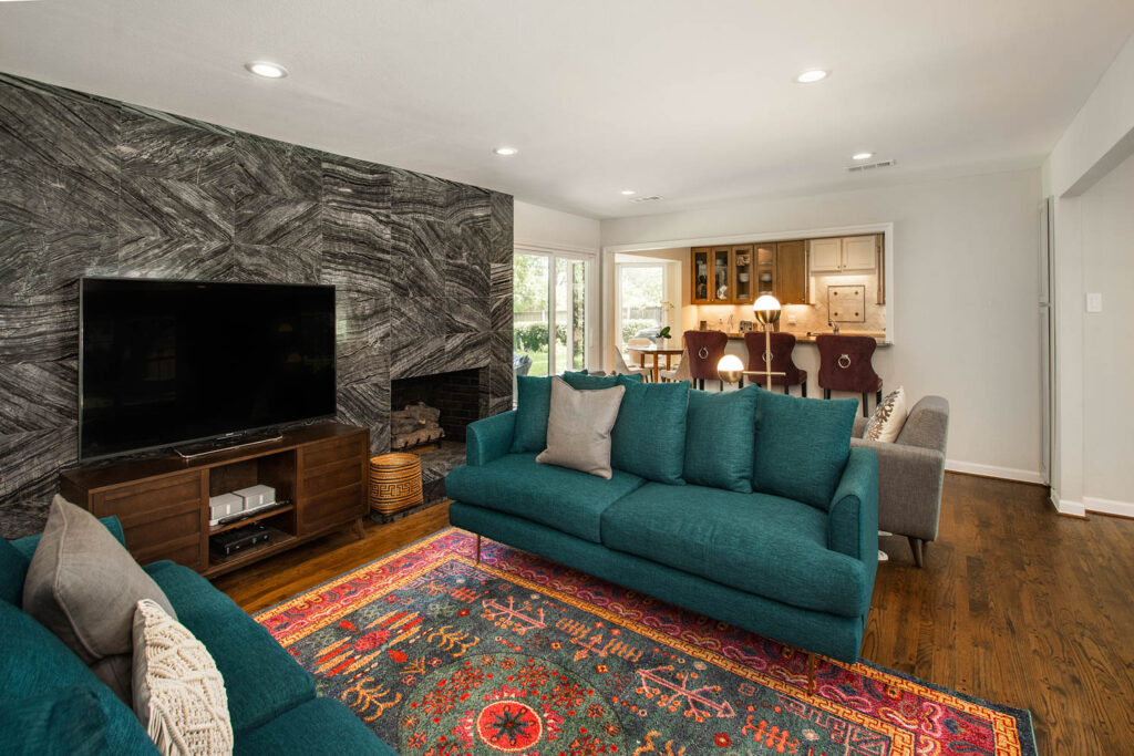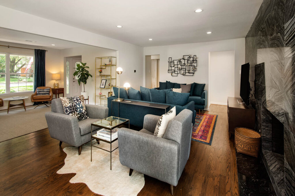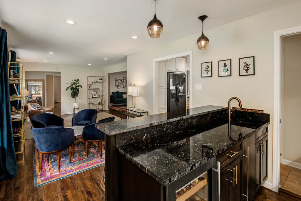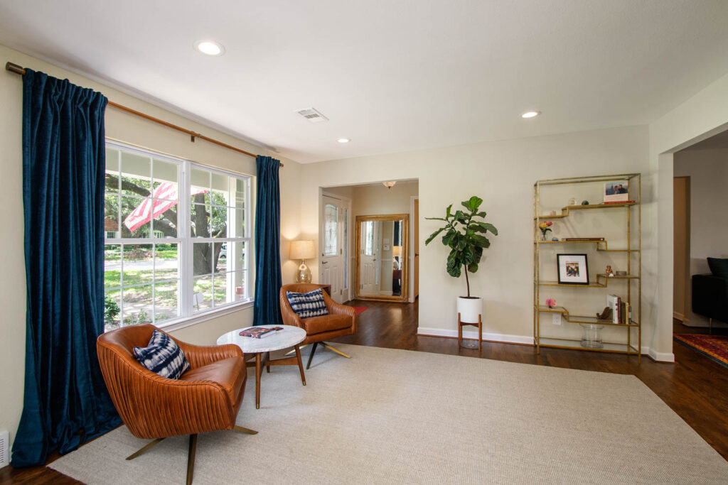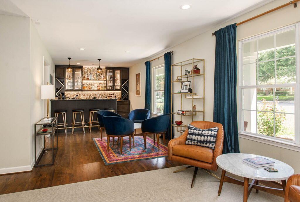 This gorgeous Dallas house, built in 1959, had great bones but was now too closed off and dark for this family’s current active lifestyle. It is in the Disney Streets neighborhood of Midway Hills, located in northwest Dallas. They had an outdated entry, as well as a formal living and dining area, which were hardly used as such. Their kids were getting older, so they were constantly coming and going, usually with a friend or two, and the homeowners like to entertain. They wanted to open the space to create a better flow and functionality, while keeping a separate seating area. They also wanted to add a bar since they often entertain. For their more traditional-style furniture, they wanted to make an update to create more of a transitional or mid-century-modern-style space.