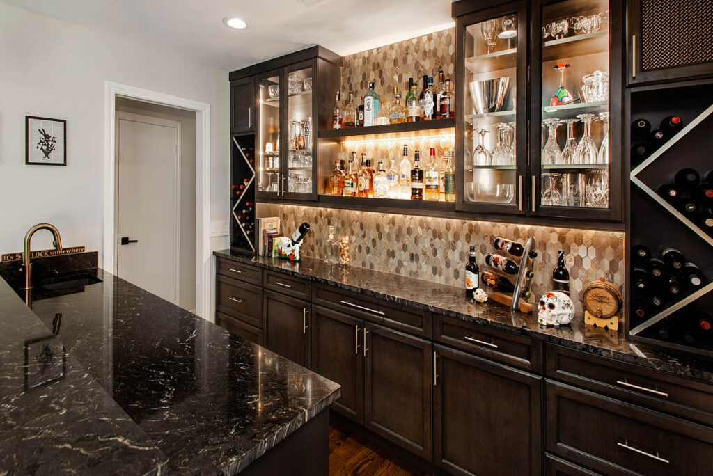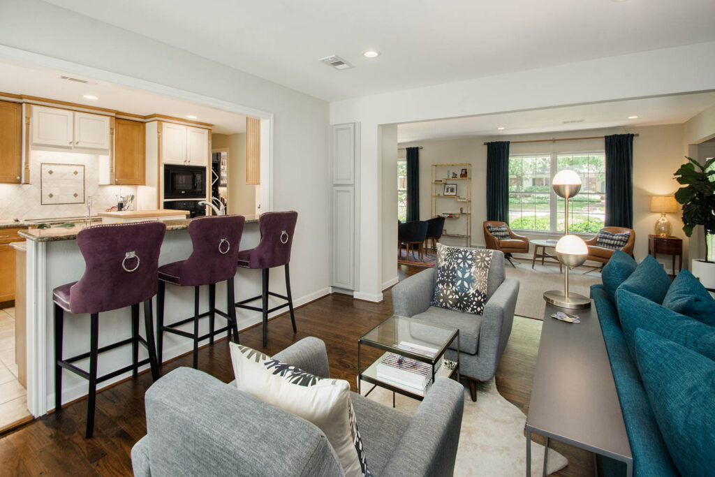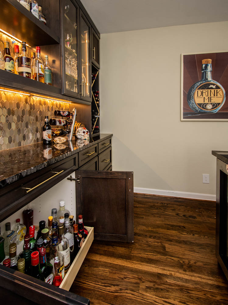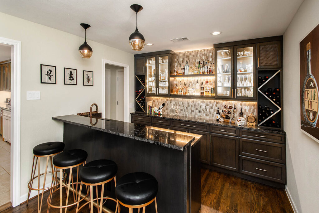 This gorgeous Dallas house, built in 1959, had great bones but was now too closed off and dark for this family’s current active lifestyle. It is in the Disney Streets neighborhood of Midway Hills, located in northwest Dallas. They had an outdated entry, as well as a formal living and dining area, which were hardly used as such. Their kids were getting older, so they were constantly coming and going, usually with a friend or two, and the homeowners like to entertain. They wanted to open the space to create a better flow and functionality, while keeping a separate seating area. They also wanted to add a bar since they often entertain. For their more traditional-style furniture, they wanted to make an update to create more of a transitional or mid-century-modern-style space.