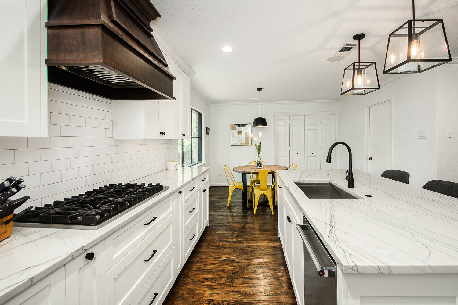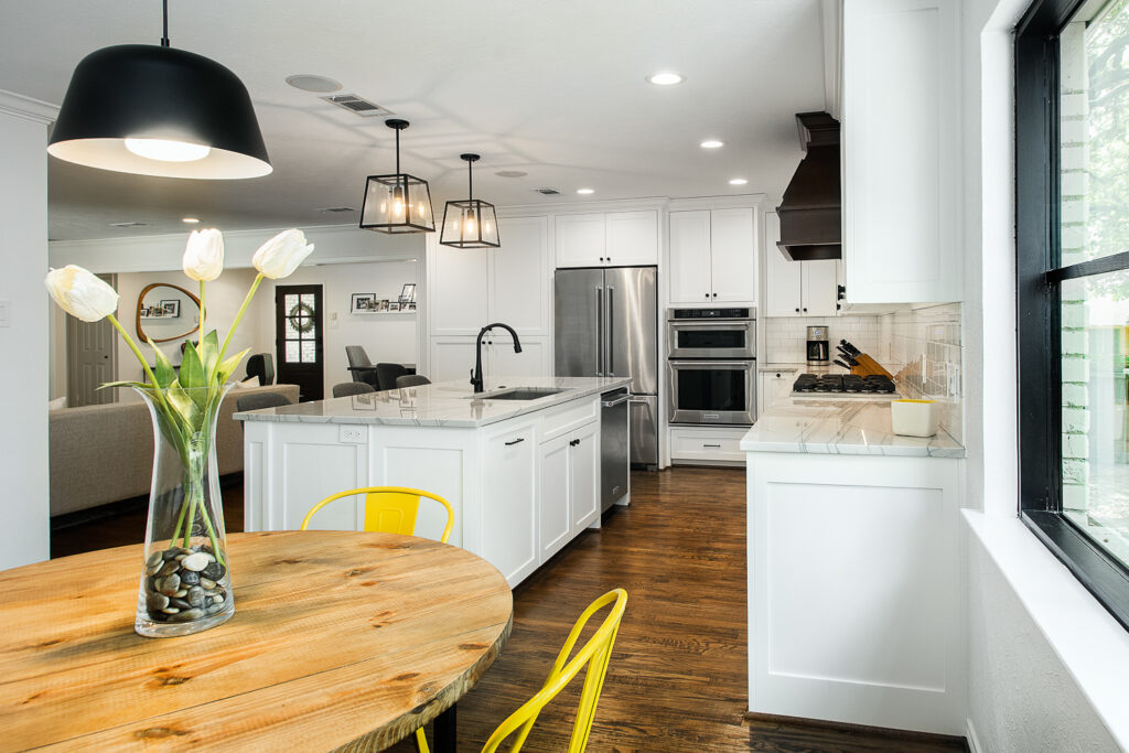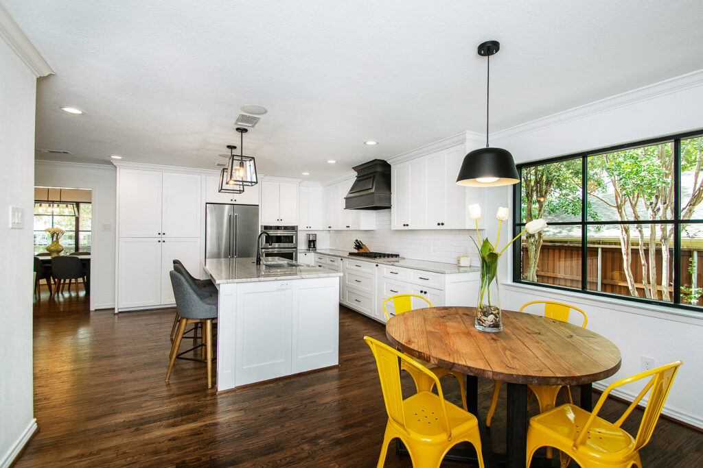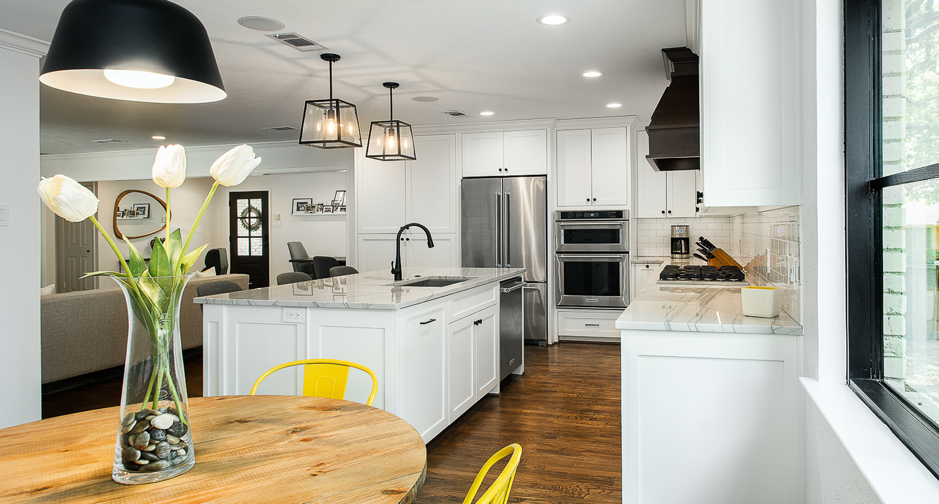 We demoed the entire kitchen and all of the flooring throughout the kitchen, family room, living room and formal living room. We removed most of the wall that closed off the kitchen to the living room, with the exception of the half wall that became part of the new island. The doorway that used to go between the formal dining and kitchen was closed off, creating more kitchen wall space and allowing an office to be added at the back of the formal dining that could be closed off, when needed. White Chandler cabinets were installed with beautiful Quartzite countertops and a custom wooden vent-hood. Matte black pulls and knobs coordinate with the island pendants, the kitchen table chandelier, and the Kohler kitchen sink and faucet in the island.