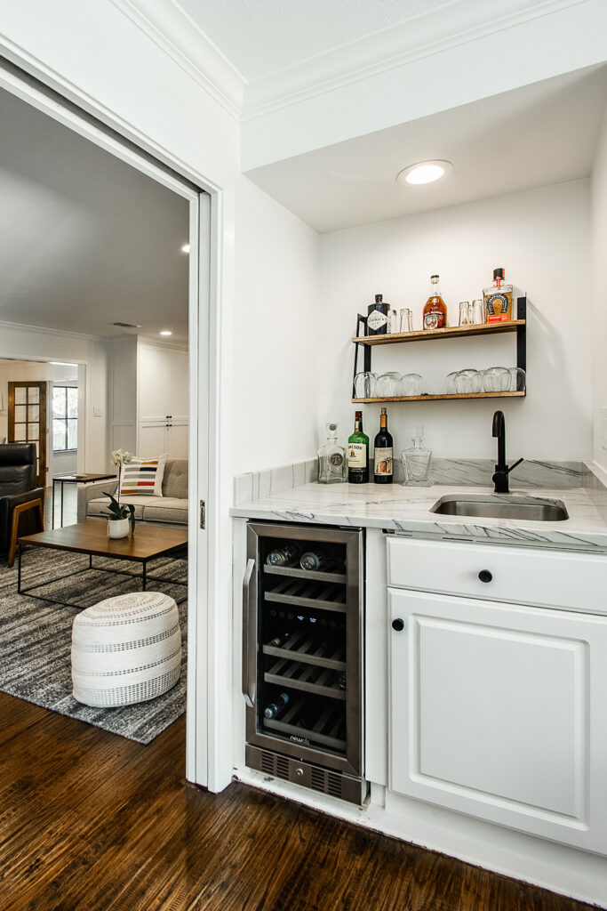 Adjacent to the living room was an office/wet bar area, where we replaced the existing wet bar with a new cabinet, countertop and a wine refrigerator. Hardwood floors were installed throughout the entire front of the house, tying it all together. Recessed lighting was installed throughout the dining room, living room and kitchen, really giving the space some much needed light. A fresh coat of paint to top it all off really brightened up the space and gave our clients exactly what they were wanting.