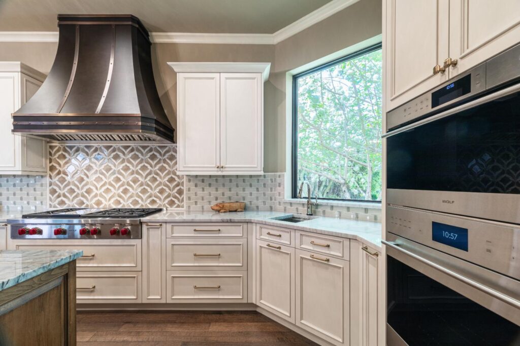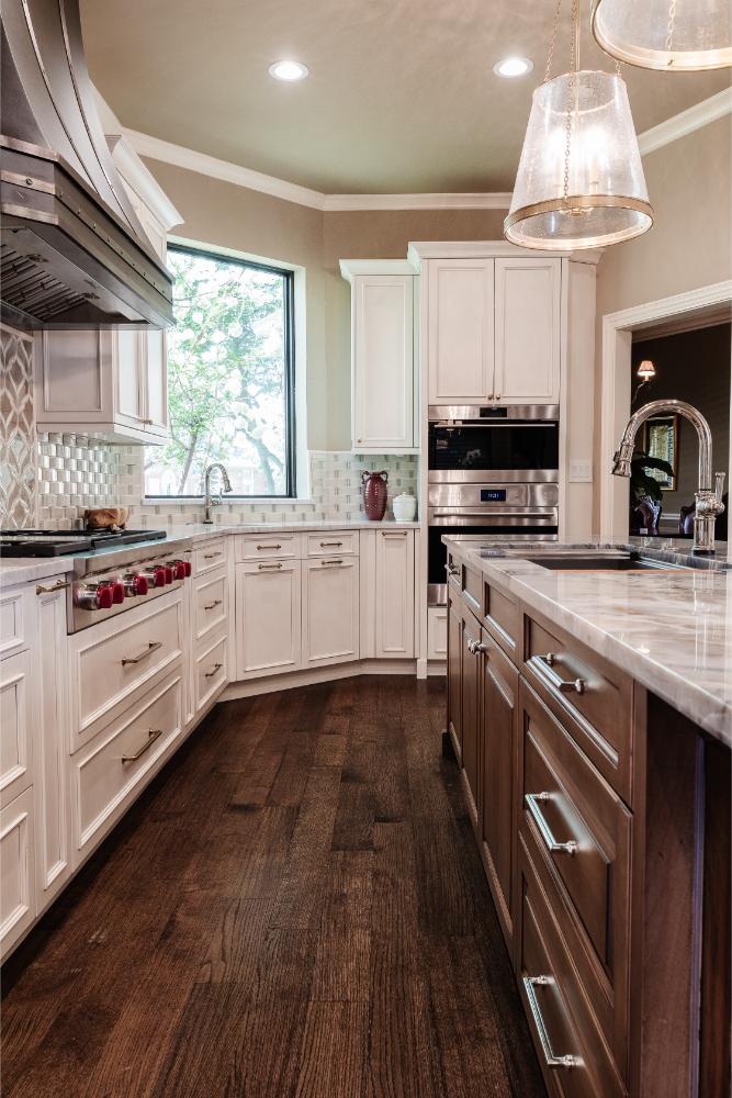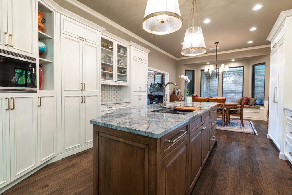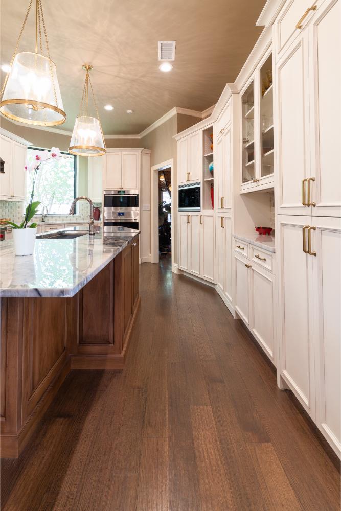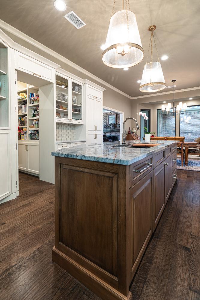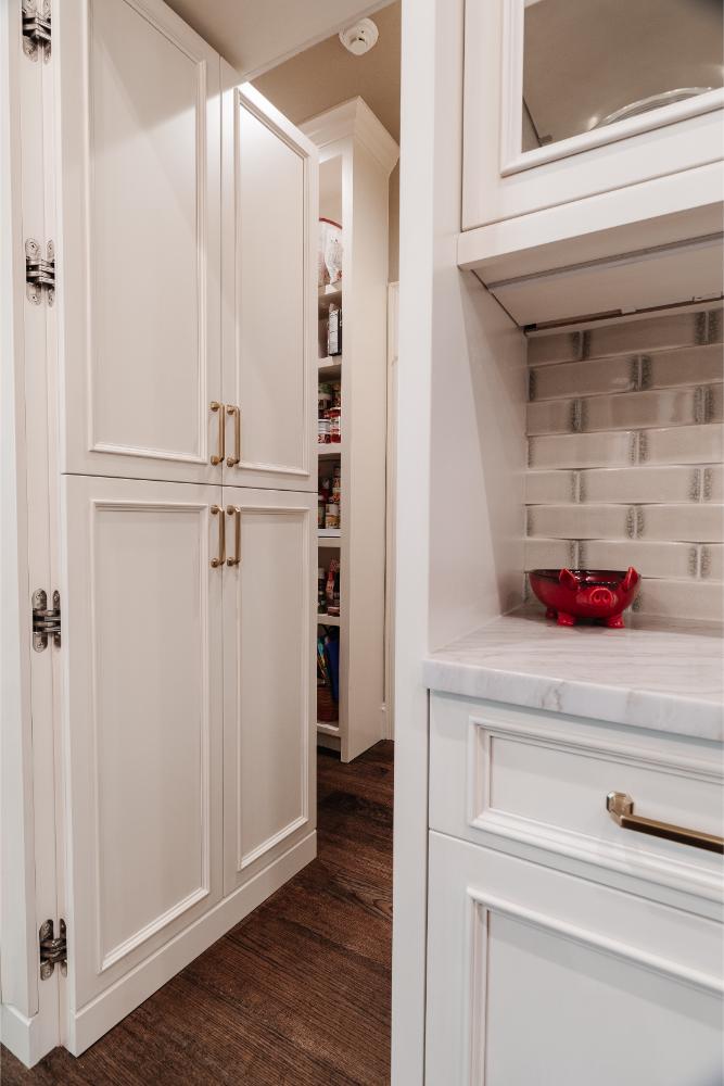 Our clients have lived in this North Dallas, TX home since it was built in 1987. Their children were all grown, so these active empty nesters saw the perfect chance to finally update their kitchen. They wanted better flow and functionality. He knew he wanted Bentwood cabinets, but she did not know anything about them. Once she saw them, she fell in love! There were so many personal customizations from roll out shelving, pull out utensil drawers, a stand mixer lift, and even hidden doors; anything was possible! She loved the fact that they got to visit the Bentwood factory and see their actual cabinets being painted. The couple also knew that they wanted to ensure that the updates they were making had a designer touch, so Jenifer Wiley, of J Wiley Designs brought her expertise to this project. Our clients added Subzero Wolf Appliances and hid the refrigerator and dishwasher behind matching cabinet panels. Speaking of hidden, the panty access door has a speakeasy function that keeps this kitchen remodel looking and functioning flawlessly.