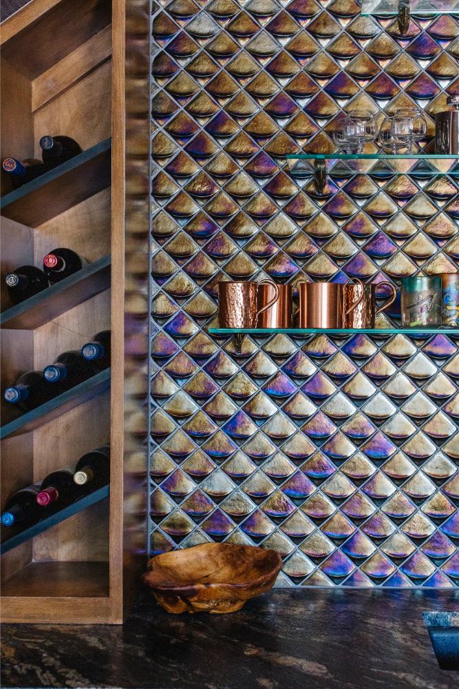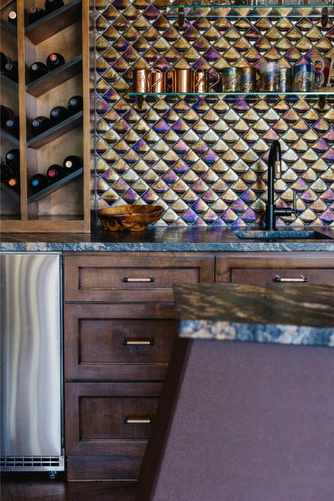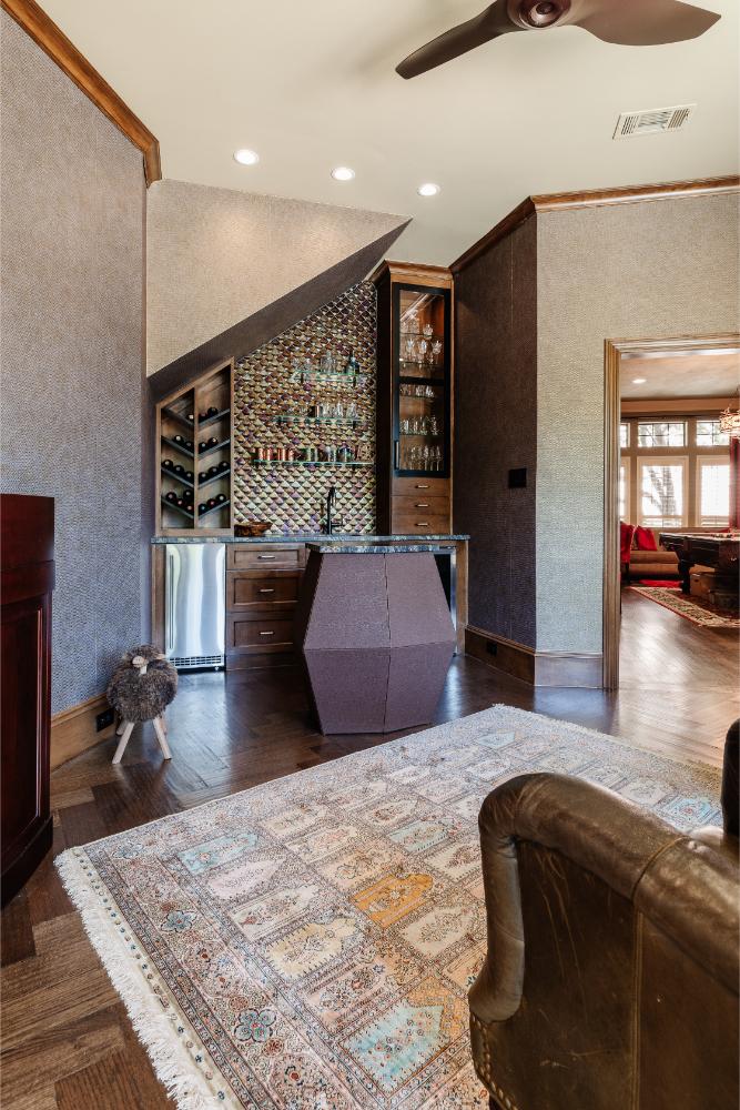 In addition to gutting their kitchen, we reconfigured a hallway that used to run alongside the kitchen leading from the entry to the den. It was really wasted space, so we closed it off and gave them a hidden walk-in pantry, that also connects to the existing storage closet that is below the stairs. New large floor to ceiling windows were installed in the living room that look out onto their beautiful backyard. The bar area adjacent to the living room also got a complete remodel. A unique custom island was built, and the wall was updated with new cabinets, stone tops and iridescent wall tile. Built-in glass shelves mixed with wine storage complete the look on the feature wall. Hardwood floors were installed in a herringbone pattern, separating the space, and calling attention to it from the rooms on either side of it. It was his perfect space to simply relax, read books or enjoy a glass of wine.