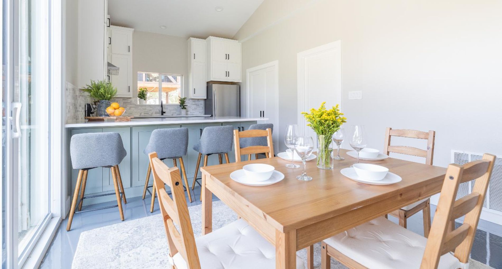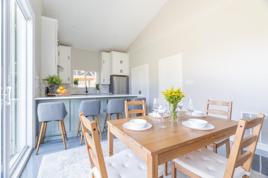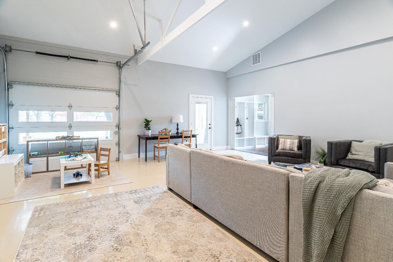 A young family with children purchased a home on 2 acres that came with a large open detached garage. The space was a blank slate inside and the family decided to turn it into living quarters for guests! Our Plano, TX remodeling company was just the right fit to renovate this 1500 sf barn into a great living space. Sarah Harper of h Designs was chosen to draw out the details of this garage renovation. Appearing like a red barn on the outside, the inside was remodeled to include a home office, large living area with roll up garage door to the outside patio, 2 bedrooms, an eat in kitchen, and full bathroom. New large windows in every room and sliding glass doors bring the outside in.