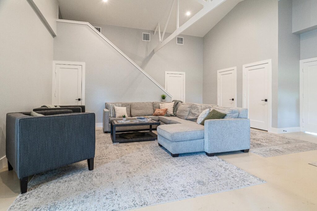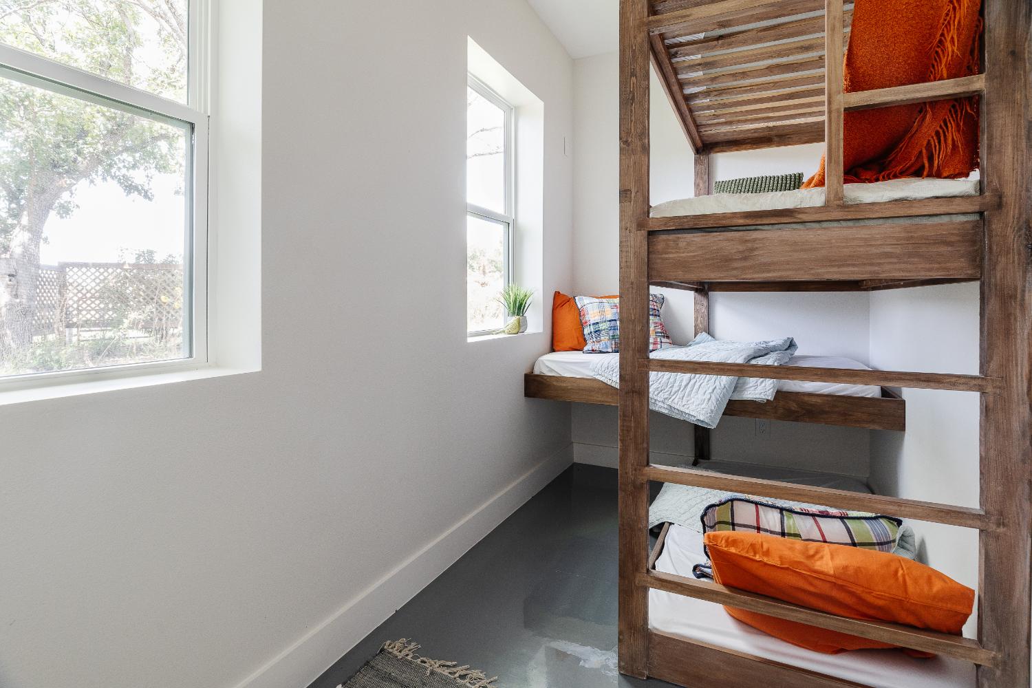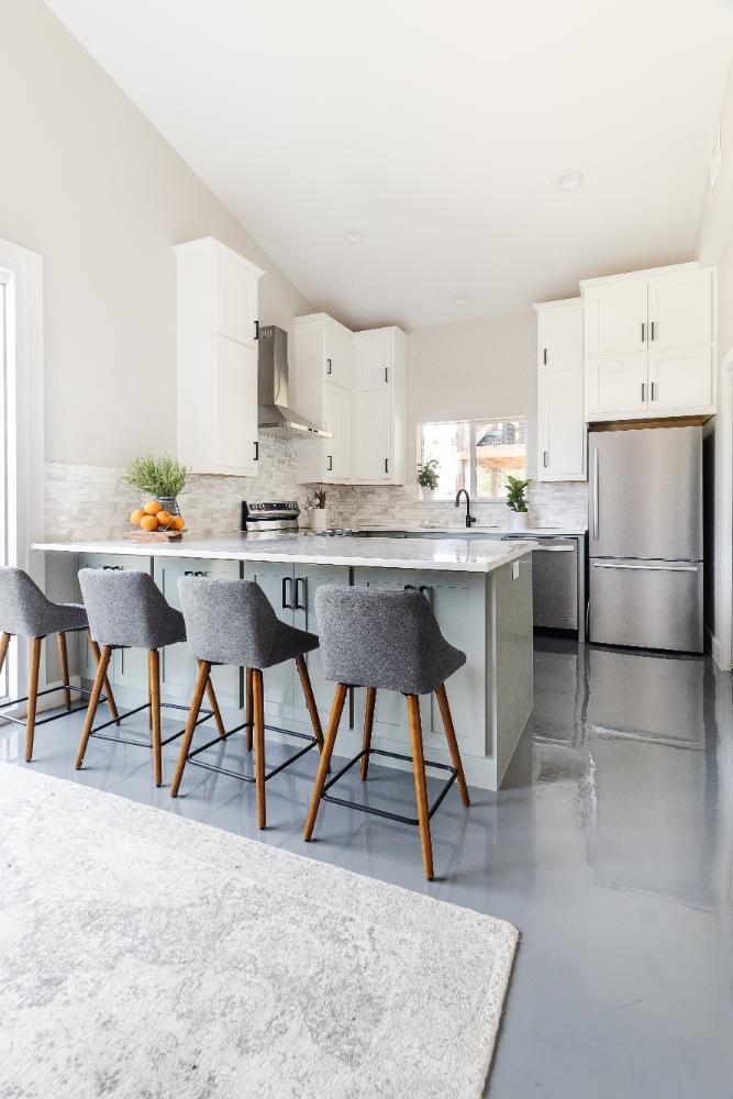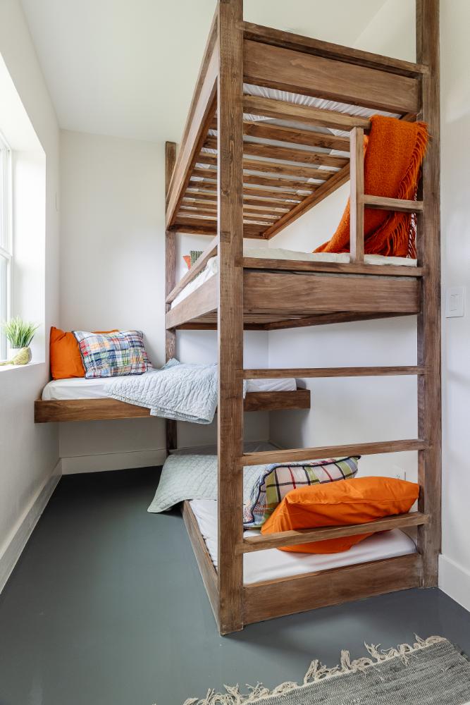 The versatile living room has a large area for seating, a staircase to walk in storage upstairs and doors that can be closed. renovation included stained concrete floors throughout the living and bedroom spaces. A large mud-room area with built-in hooks and shelves is the foyer to the home office. The kitchen is fully functional with Samsung range, full size refrigerator, pantry, countertop seating and room for a dining table. Custom cabinets from Latham Millwork are the perfect foundation for Cambria Quartz Weybourne countertops. The sage green accents give this space life and sliding glass doors allow for oodles of natural light. The full bath is decked out with a large shower and vanity and a smart toilet. Luxart fixtures and shower system give this bathroom an upgraded feel. Mosaic tile in grey gives the floor a neutral look. There’s a custom-built bunk room for the kids with 4 twin beds for sleepovers. And another bedroom large enough for a double bed and double closet storage. This custom remodel in Dallas, TX is just what our clients asked for.
