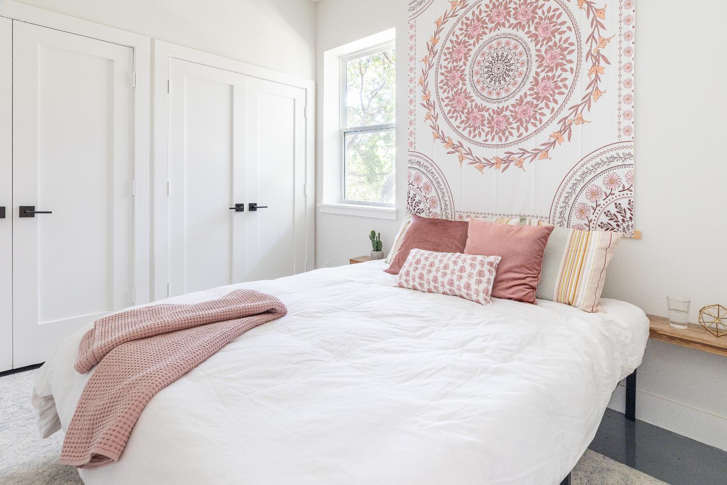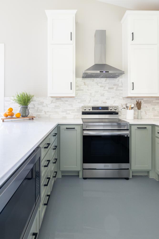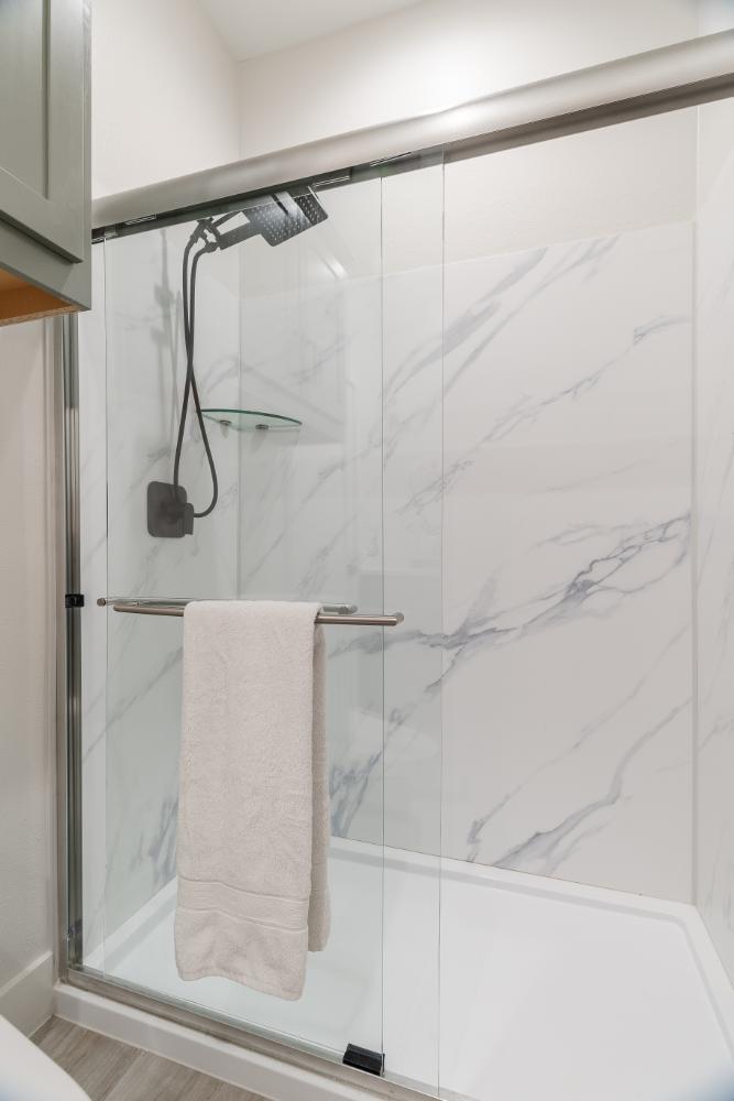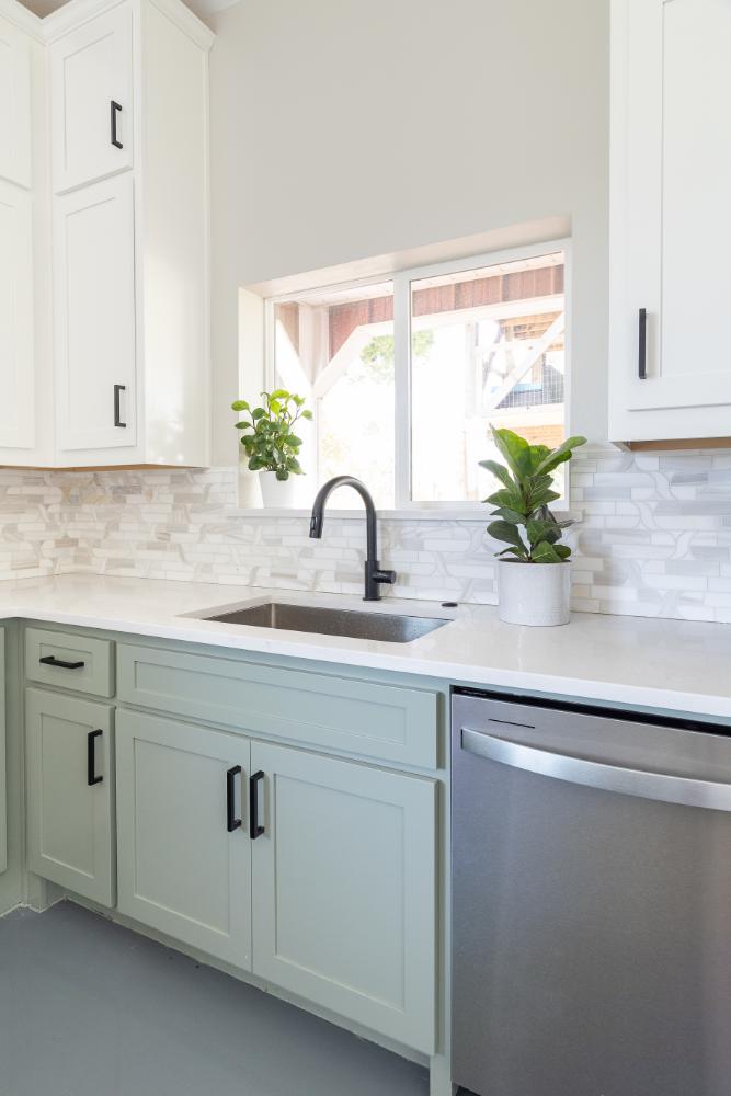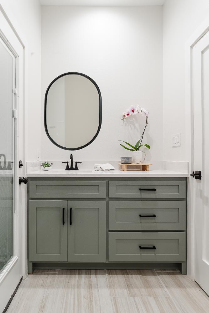 The versatile living room has a large area for seating, a staircase to walk in storage upstairs and doors that can be closed. renovation included stained concrete floors throughout the living and bedroom spaces. A large mud-room area with built-in hooks and shelves is the foyer to the home office. The kitchen is fully functional with Samsung range, full size refrigerator, pantry, countertop seating and room for a dining table. Custom cabinets from Latham Millwork are the perfect foundation for Cambria Quartz Weybourne countertops. The sage green accents give this space life and sliding glass doors allow for oodles of natural light. The full bath is decked out with a large shower and vanity and a smart toilet. Luxart fixtures and shower system give this bathroom an upgraded feel. Mosaic tile in grey gives the floor a neutral look. There’s a custom-built bunk room for the kids with 4 twin beds for sleepovers. And another bedroom large enough for a double bed and double closet storage. This custom remodel in Dallas, TX is just what our clients asked for.
