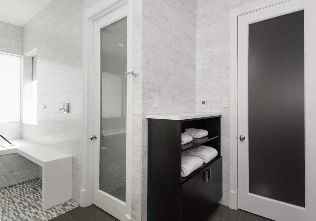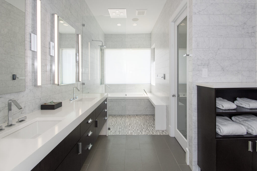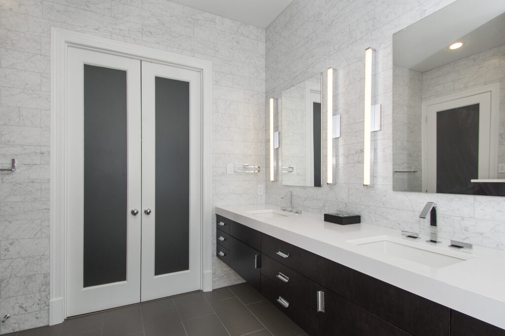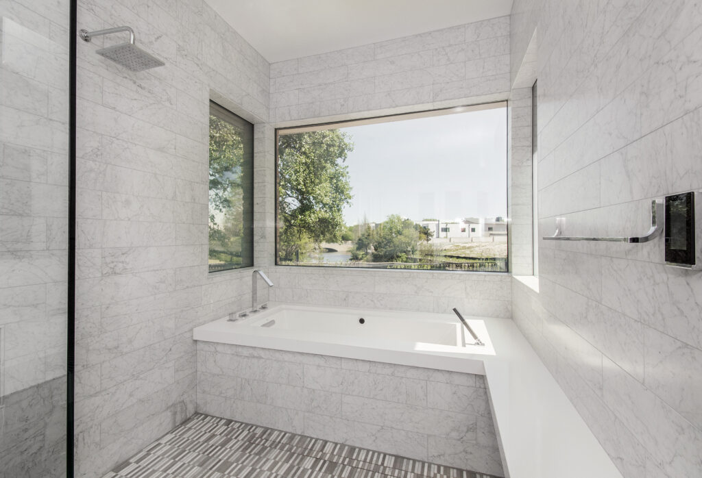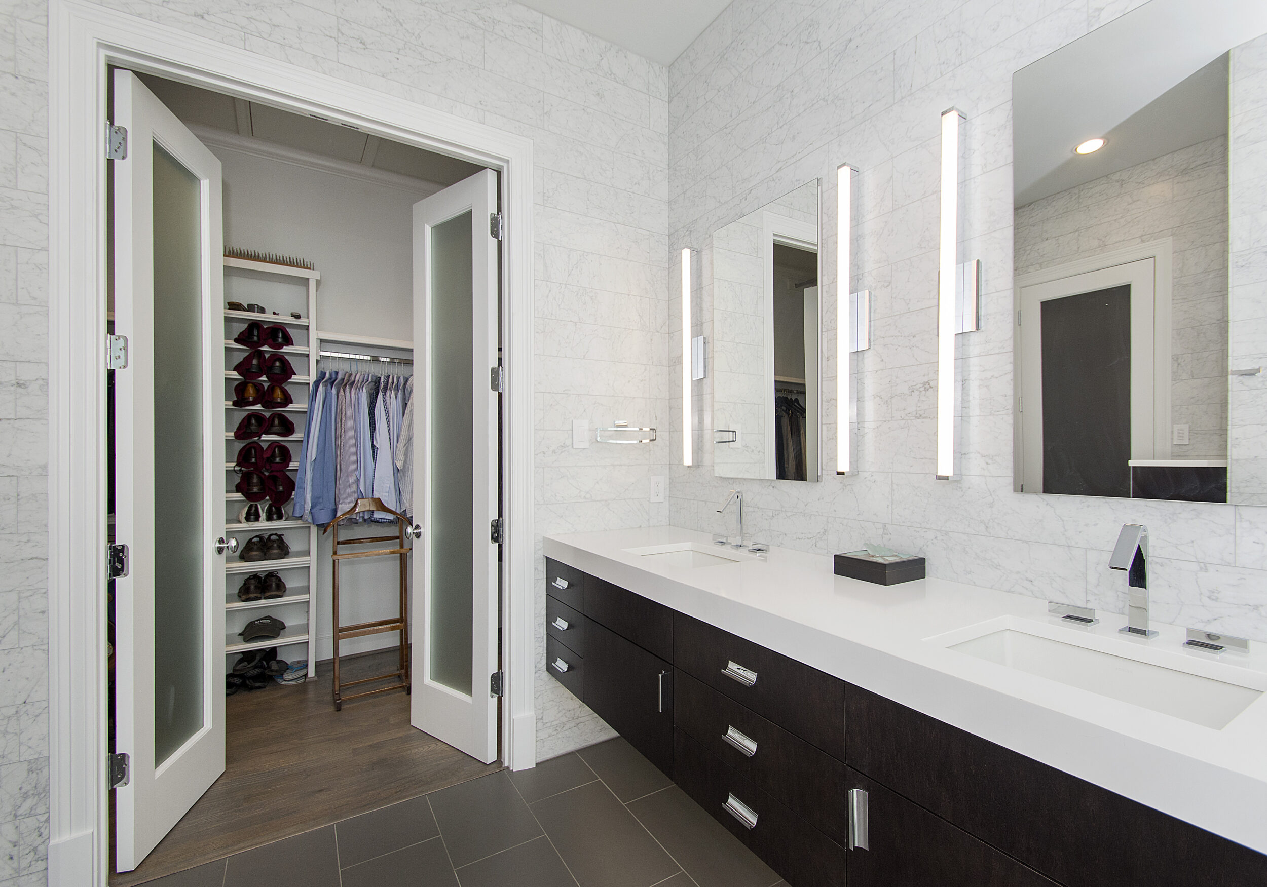 This Preston Hollow home built originally in 1978 had a really sad master bathroom that was depleted of life. With breathtaking views of the lake from these bath windows, the homeowner wanted to take advantage of the natural light in the wet room area. He wanted an unobstructed view of the lake behind his home but also privacy when getting ready for the day. We installed electrified glass that frosts at the flip of a switch allowing instant privacy but still letting the light through. We created a wet room placing the Kohler Underscore soaking tub under the windows and aligned the shower beside it. The shower has a Kohler ceiling mounted rain shower head with integrated chroma therapy accompanied by a Kohler wall mounted rain shower head controlled by a touch button Kohler DTV. Honed white marble tile from Waterworks adorns all of the walls. We lined the floors with a Scluter Ditra Heat Flooring System and a hidden linear floor drain. We used a floating vanity from Canyon Creek Cabinet company and topped it with Pure White Vicostone and under-mount sinks. The sleek chrome faucets, bath hardware, and sleek vanity sconces frame the bathroom. Lastly, the water closet got a major update with the Kohler Numi toilet with integrated bidet (and in case you were wondering, it has a remote control and will play music!). We think it is safe to say that this master bath stands out from the crowd and is quite a remarkable change from before!