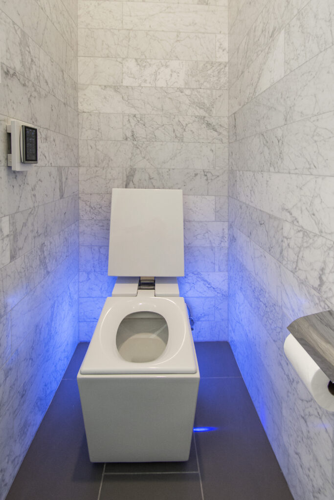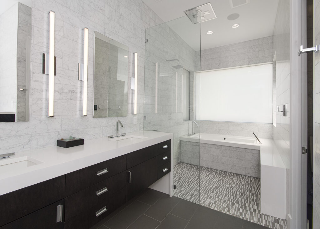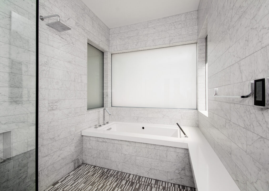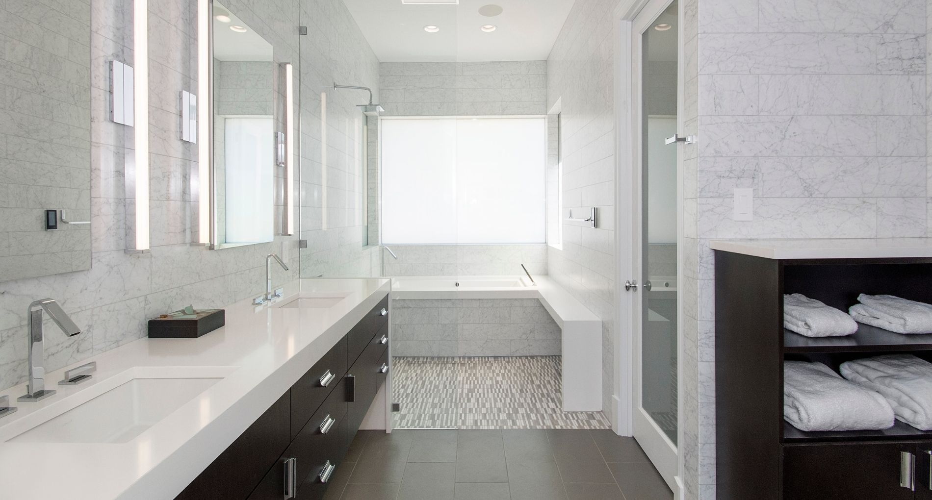 This Preston Hollow home built originally in 1978 had a really sad master bathroom that was depleted of life. With breathtaking views of the lake from these bath windows, the homeowner wanted to take advantage of the natural light in the wet room area. He wanted an unobstructed view of the lake behind his home but also privacy when getting ready for the day. We installed electrified glass that frosts at the flip of a switch allowing instant privacy but still letting the light through. We created a wet room placing the Kohler Underscore soaking tub under the windows and aligned the shower beside it. The shower has a Kohler ceiling mounted rain shower head with integrated chroma therapy accompanied by a Kohler wall mounted rain shower head controlled by a touch button Kohler DTV. Honed white marble tile from Waterworks adorns all of the walls. We lined the floors with a Scluter Ditra Heat Flooring System and a hidden linear floor drain. We used a floating vanity from Canyon Creek Cabinet company and topped it with Pure White Vicostone and under-mount sinks. The sleek chrome faucets, bath hardware, and sleek vanity sconces frame the bathroom. Lastly, the water closet got a major update with the Kohler Numi toilet with integrated bidet (and in case you were wondering, it has a remote control and will play music!). We think it is safe to say that this master bath stands out from the crowd and is quite a remarkable change from before!