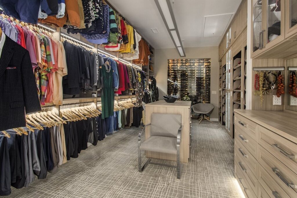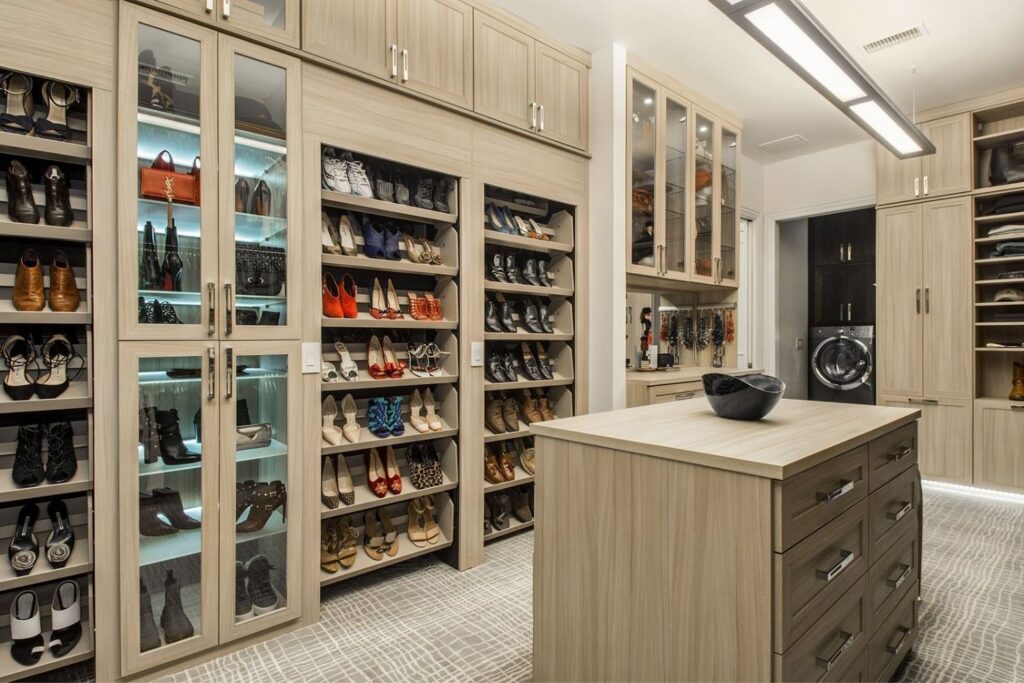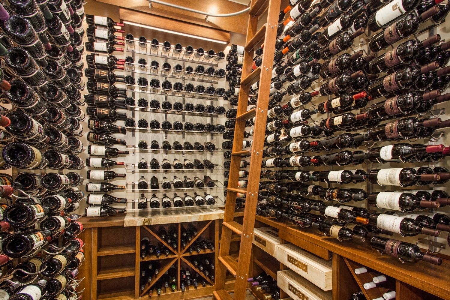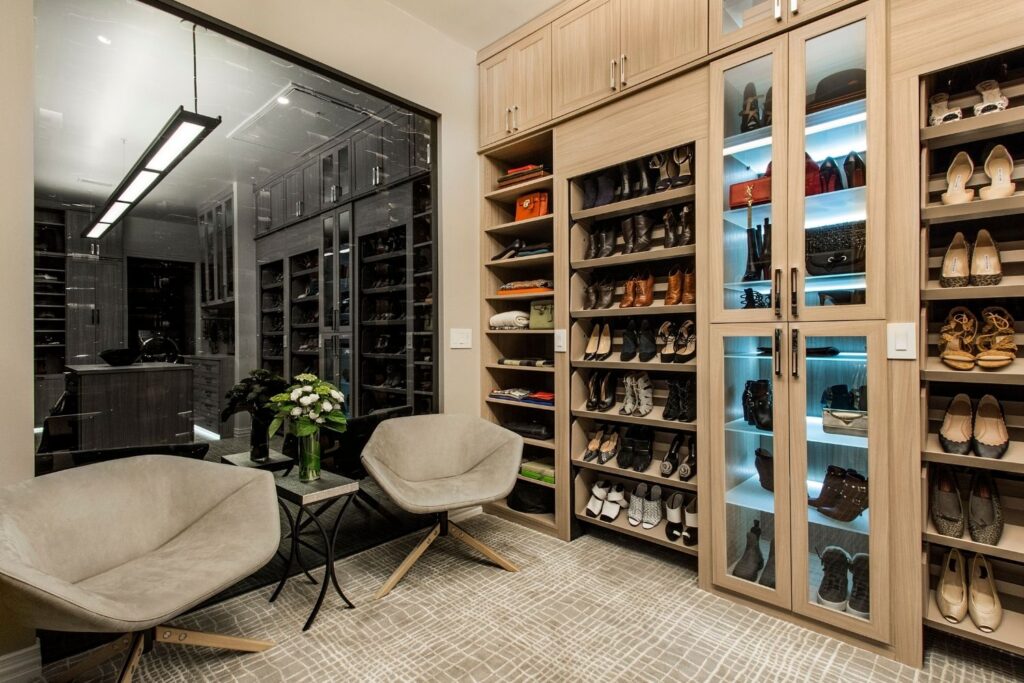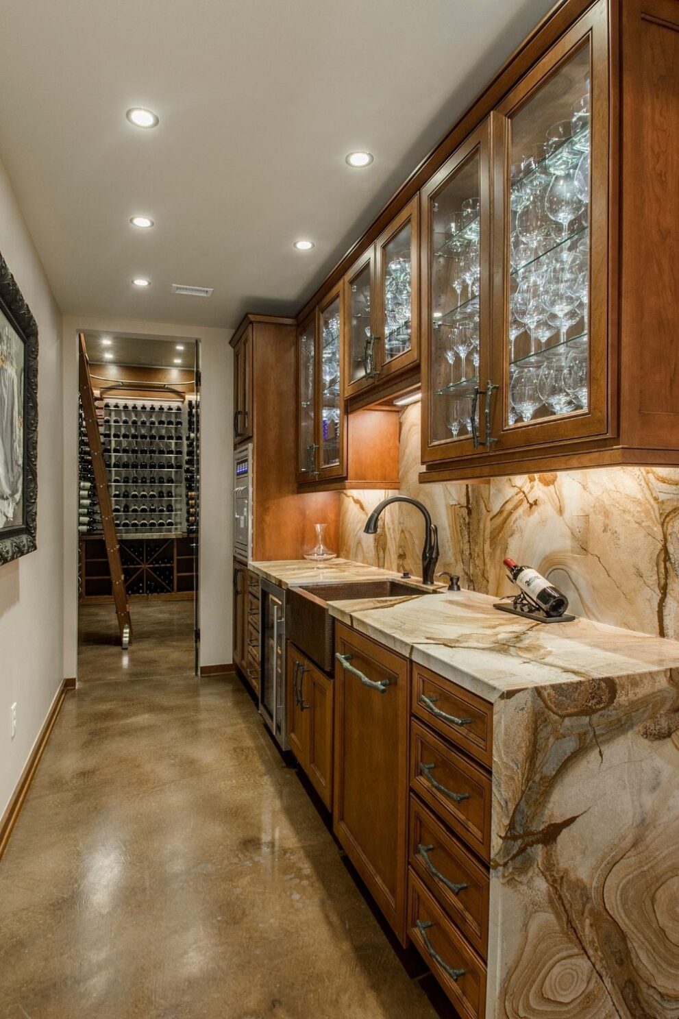 This master suite has every spa indulgence you can think of, from the rain shower head, the handheld shower and six body sprays in the steam shower to the heated flooring or the vanishing televisions in the mirrors, but the Bain Ultra Essencia Thermomasseur tub, including Aromatherapy and Chromatherapy, is definitely the star of the show! The Tivoli Beige and Ocean Blue veincut mosaic accents throughout really stand out with the Eleganza Acacia Driftwood floor tile and the Onyx countertops atop mulberry finished Canyon Creek Cabinets . LED toe kick lighting, backlit mirrors, wall sconces, cove lighting, and the gorgeous chandelier make sure there is indirect lighting all around. The water closet features a state-of-the-art Toto Neorest commode which comes with every option one could imagine and a Duravit wall-mounted bidet. In the bedroom, automatic window shades, additional ceiling molding, LED cove lighting, headboard sconces, and motion-activated walkway nightlights ensure this couple will never be out of reach of the lighting they need. The sitting area’s focal point is now the striking Pirce LED Chandelier by Artemide. Teaming up with California Closets gave this homeowner the closet of her dreams. StorageMotion automatic shoe racks display designer shoes, the center island and expansive drawers and cabinets allow everything to have a place. The dressing area includes a mirrored vanity with pull-out organizers for jewelry, LED-lit clothing racks, and a Peerless LightEdge center fixture. Oh, and let’s not forget the automatic wardrobe lifts for out of season clothes. The convenient laundry space right off the closet makes washing and putting away clothes easy. This area also boasts floor to ceiling cabinets by Canyon Creek in a dark stain. A stellar view into the wine cellar along with a comfortable spot to enjoy a glass of wine while getting ready completes this spectacular closet!