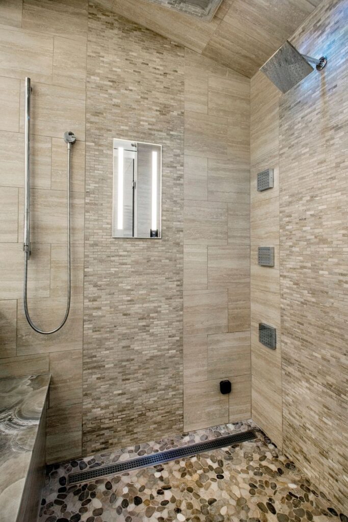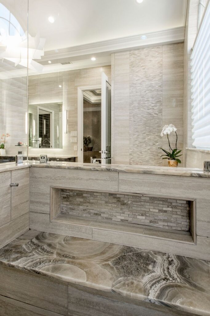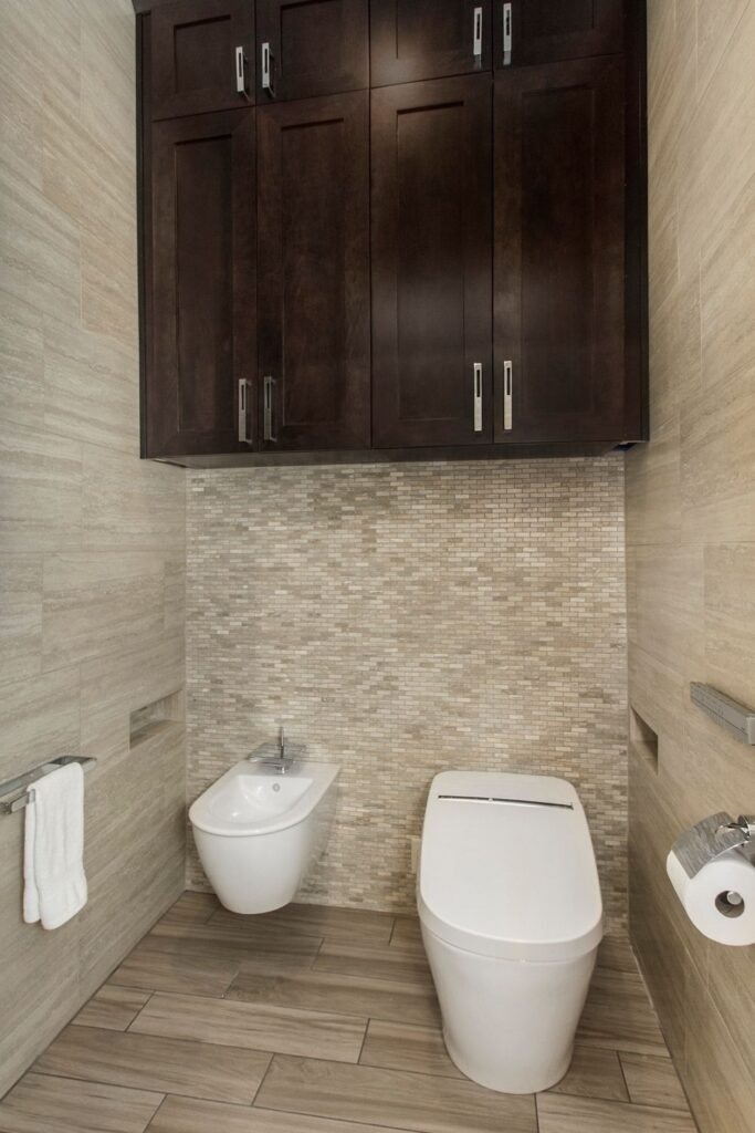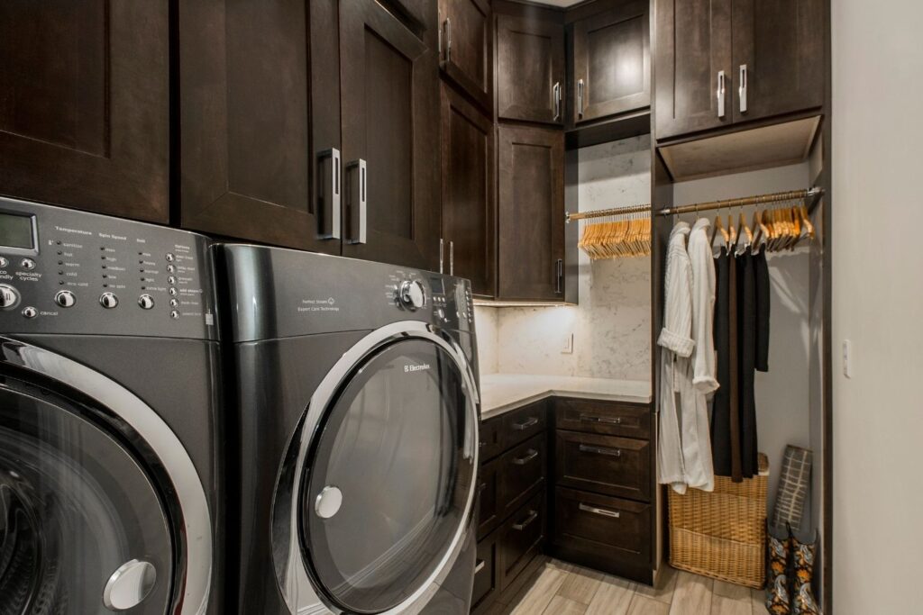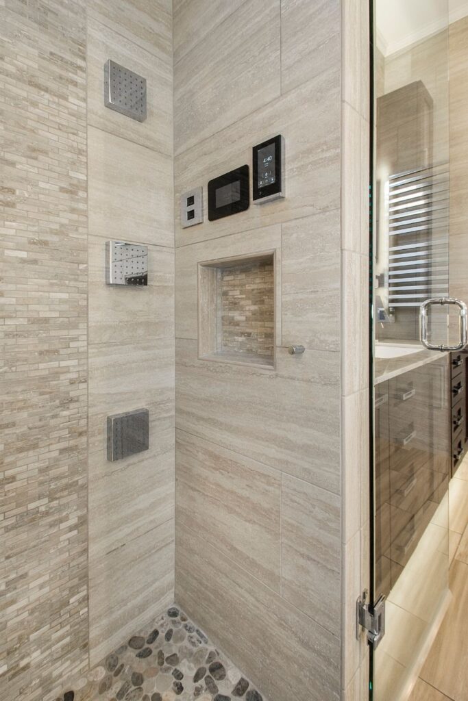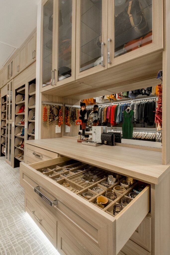 This master suite has every spa indulgence you can think of, from the rain shower head, the handheld shower and six body sprays in the steam shower to the heated flooring or the vanishing televisions in the mirrors, but the Bain Ultra Essencia Thermomasseur tub, including Aromatherapy and Chromatherapy, is definitely the star of the show! The Tivoli Beige and Ocean Blue veincut mosaic accents throughout really stand out with the Eleganza Acacia Driftwood floor tile and the Onyx countertops atop mulberry finished Canyon Creek Cabinets . LED toe kick lighting, backlit mirrors, wall sconces, cove lighting, and the gorgeous chandelier make sure there is indirect lighting all around. The water closet features a state-of-the-art Toto Neorest commode which comes with every option one could imagine and a Duravit wall-mounted bidet. In the bedroom, automatic window shades, additional ceiling molding, LED cove lighting, headboard sconces, and motion-activated walkway nightlights ensure this couple will never be out of reach of the lighting they need. The sitting area’s focal point is now the striking Pirce LED Chandelier by Artemide. Teaming up with California Closets gave this homeowner the closet of her dreams. StorageMotion automatic shoe racks display designer shoes, the center island and expansive drawers and cabinets allow everything to have a place. The dressing area includes a mirrored vanity with pull-out organizers for jewelry, LED-lit clothing racks, and a Peerless LightEdge center fixture. Oh, and let’s not forget the automatic wardrobe lifts for out of season clothes. The convenient laundry space right off the closet makes washing and putting away clothes easy. This area also boasts floor to ceiling cabinets by Canyon Creek in a dark stain. A stellar view into the wine cellar along with a comfortable spot to enjoy a glass of wine while getting ready completes this spectacular closet!