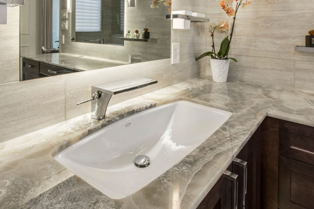 Floating InVinity wine racks provide storage for up to 1000 bottles! The glass door and the tinted glass wine cellar window into the master closet give added dimension to this space and is the perfect spot to select your favorite red or white. In the prep space, the 4 bottle WineStation suits those who just want to enjoy their wine by the glass. The prep area is gorgeous with its glass displays, Stone Wood marble countertops, hidden outlets and copper front apron sink, not to mention the hidden dishwasher or the additional under counter beverage refrigerator.
