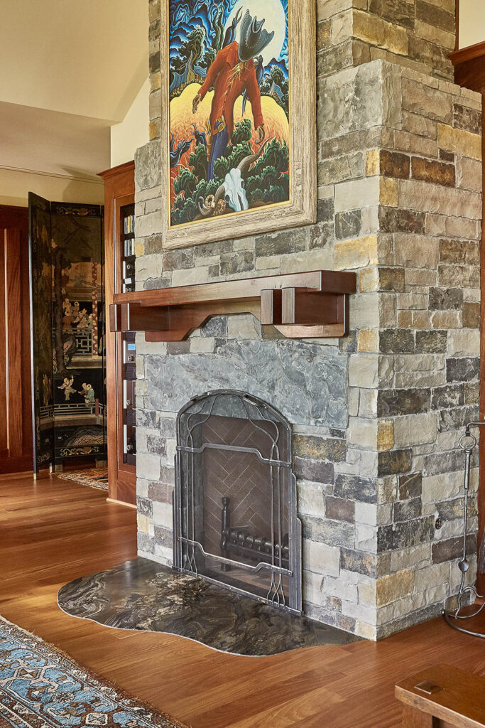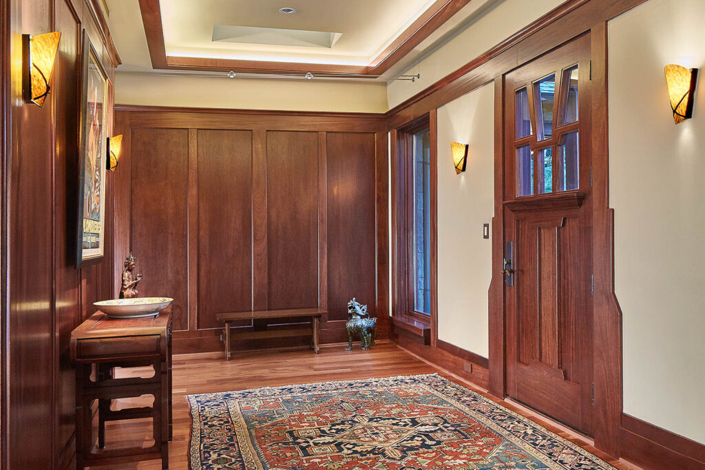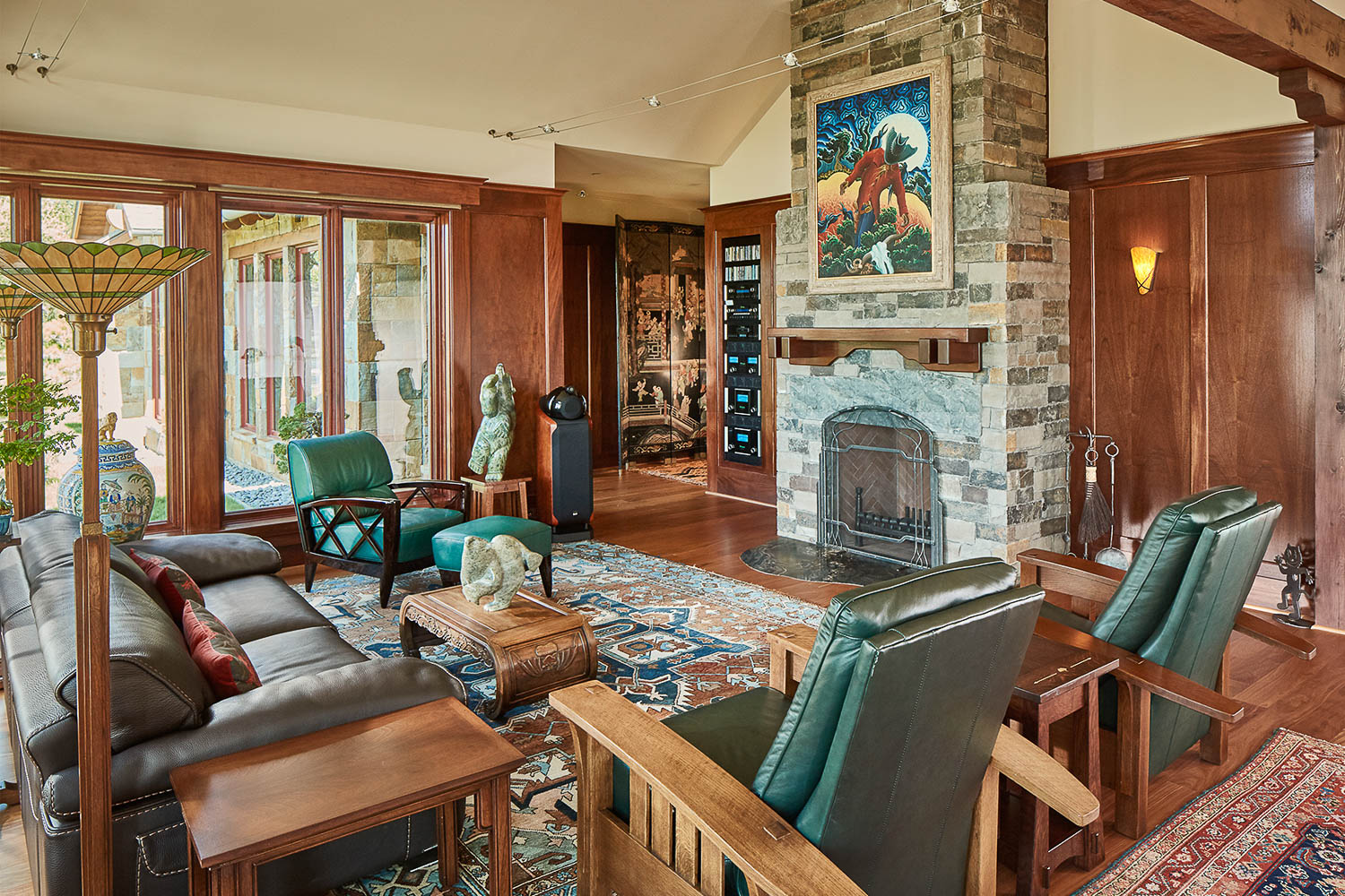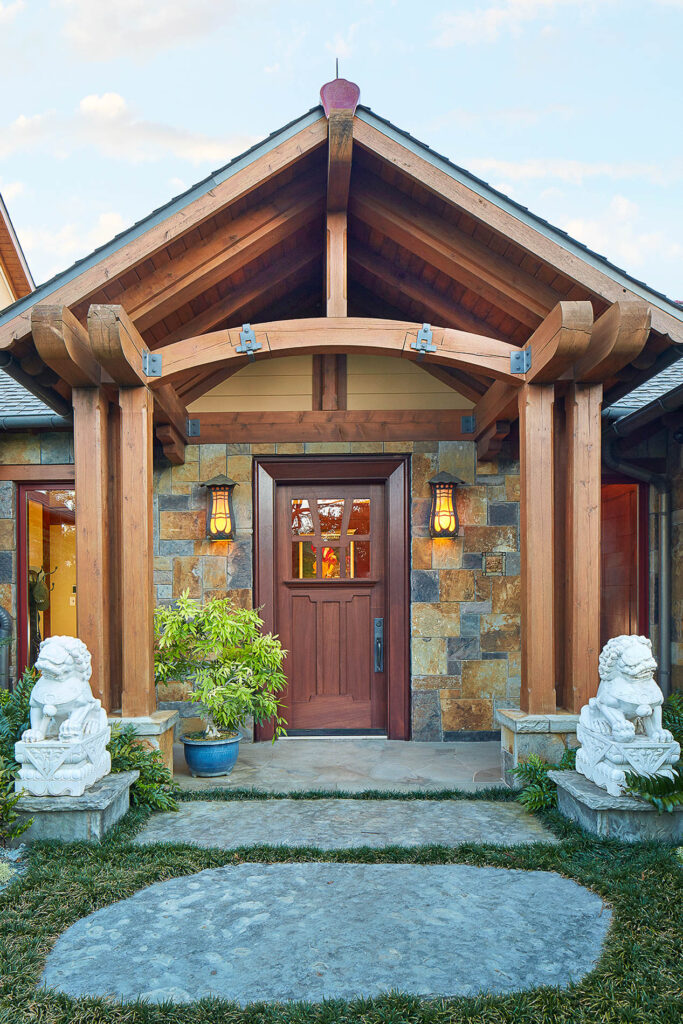The architect on this project created the perfect upscale bachelor pad that blends the classic Craftsman style home with touches of Asian-inspired influences. The striking interior design features include mahogany paneled walls, TruStile doors, and custom millwork and cabinetry that are blended beautifully with the exterior artistry of Arkansas rock, stucco, and heavy wood timbers. Adding to the ambiance, and perfect balance of form and function, are the fully automated Lutron Homeworks lighting and shade controls.
