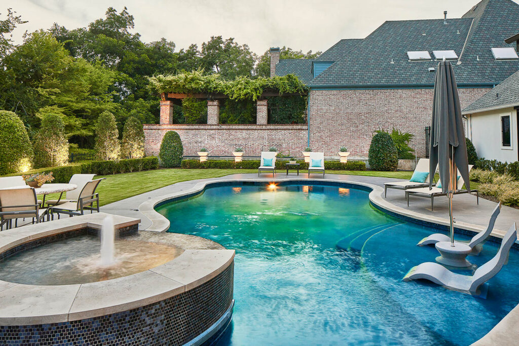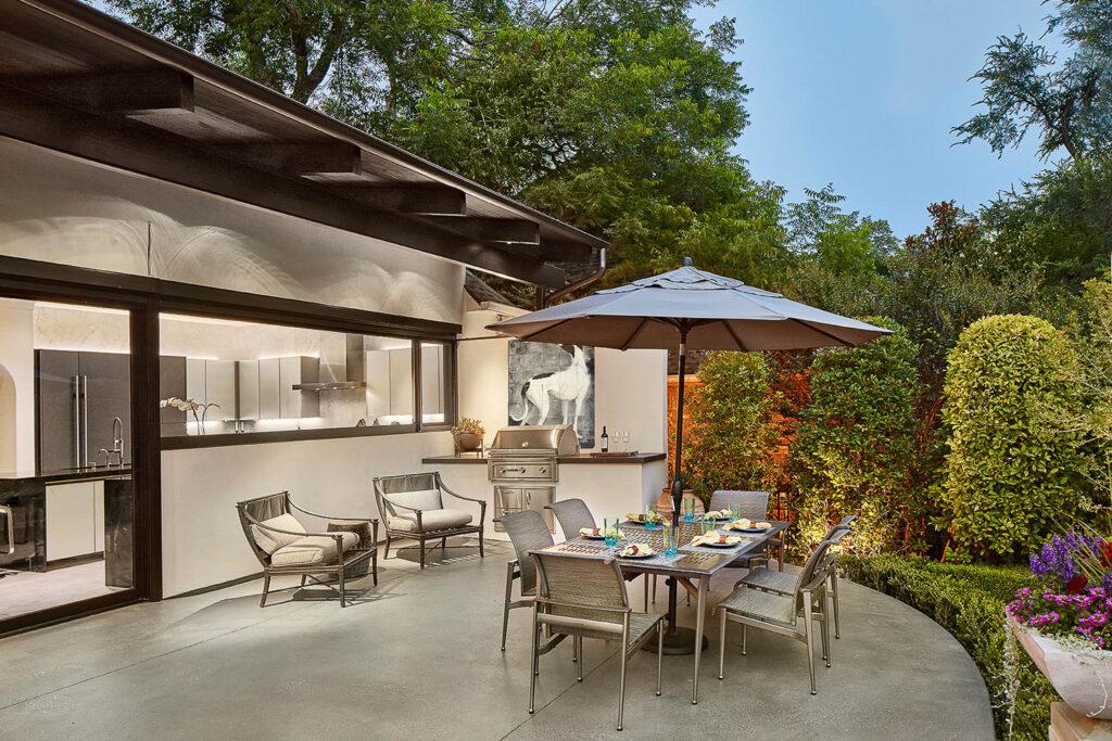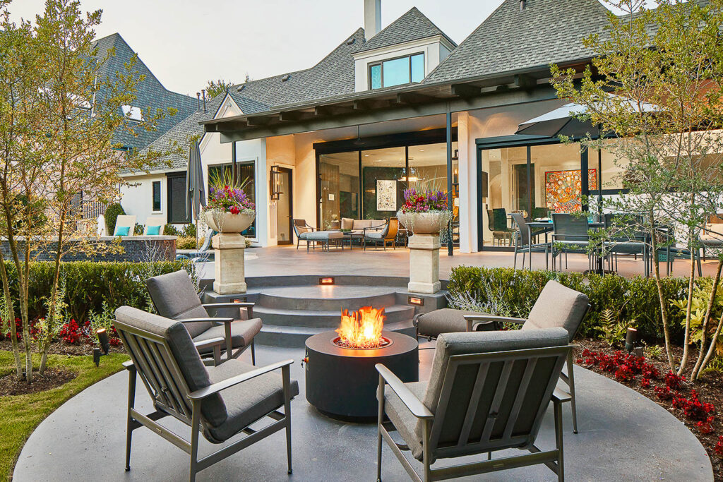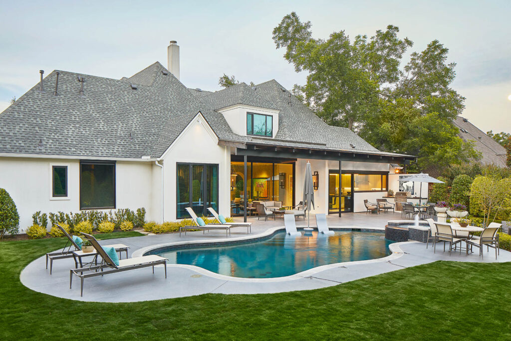 The house had a fabulous back yard bordered by a creek and mature trees. The covered porch was too small, and the cast stone balustrade further exasperated the limited space and views to the property. The pool, surrounding deck and landscape was also dated and tired. We engaged an architect and a seasoned landscape designer to rethink the exterior spaces. The result delivered a large modern covered patio that extends across the back of the house to the grill center that is located off the kitchen. The pool was modified to add a shallow tanning ledge, modern glass tiles and a darker plaster. A separate area was created to accommodate a firepit and the landscape was completely refreshed.