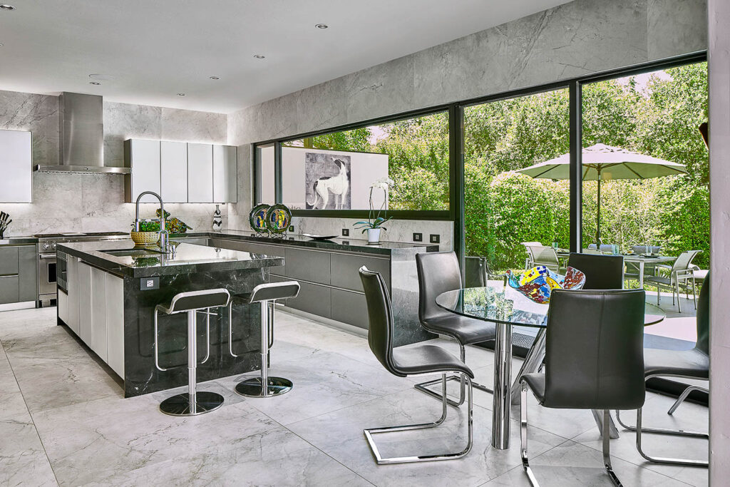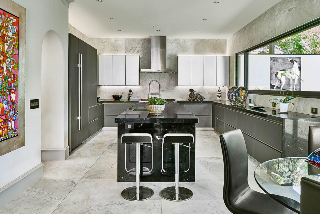With a stunning back yard redesign, it became important to open the exterior walls to blur the lines between the interior and exterior spaces. Floor to ceiling sliding glass doors were incorporated to maximize the views and natural light. The kitchen was completely gutted and reconfigured to accommodate the modern Ornare cabinetry and professional appliances. The floors and walls were tiled in very large format porcelain tiles and the Quartzite countertops were designed with waterfall ends and mitered drop edges to complement the modern aesthetic. A pass-through window between the kitchen and outdoor grill was added for convenience.