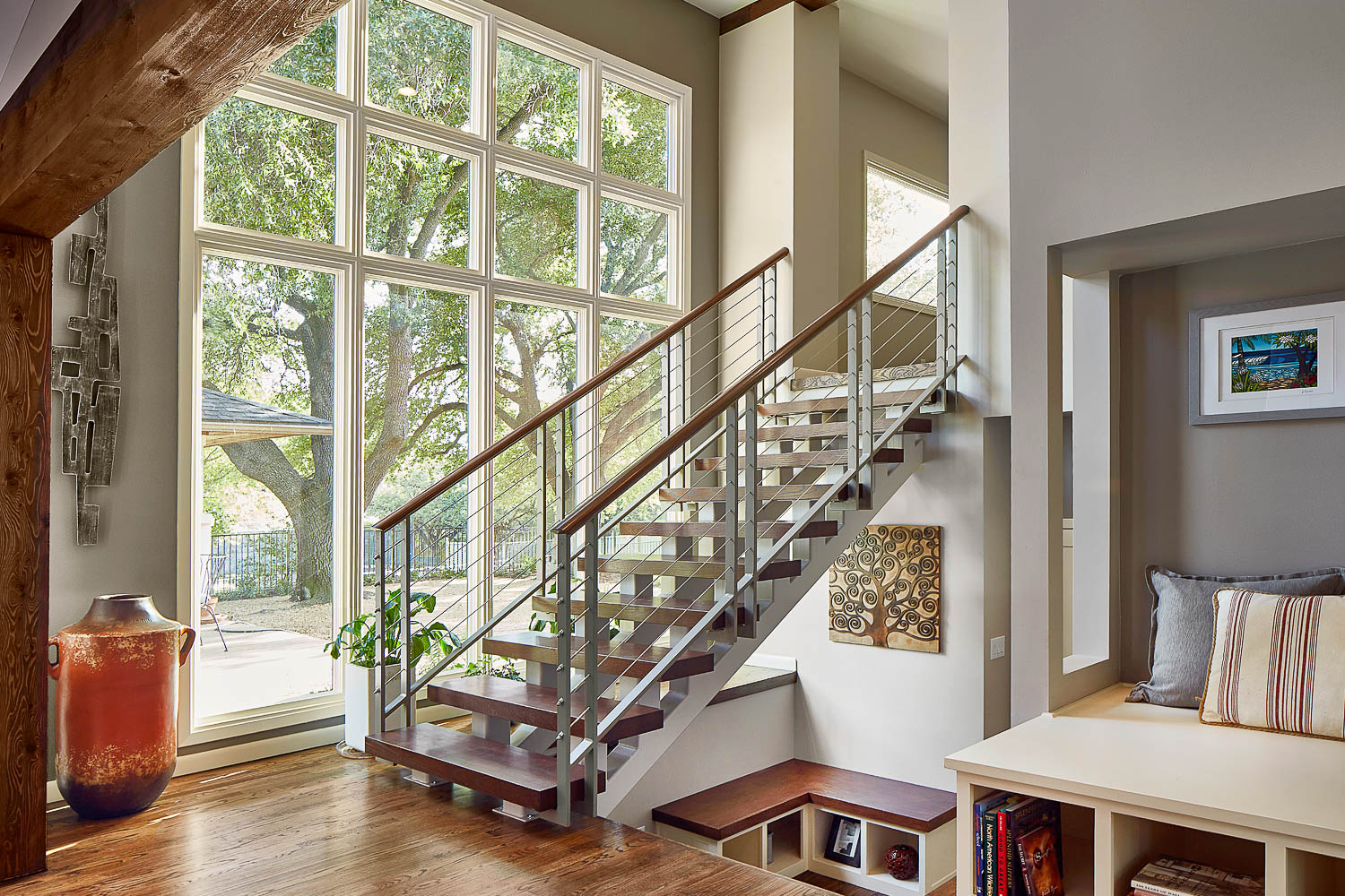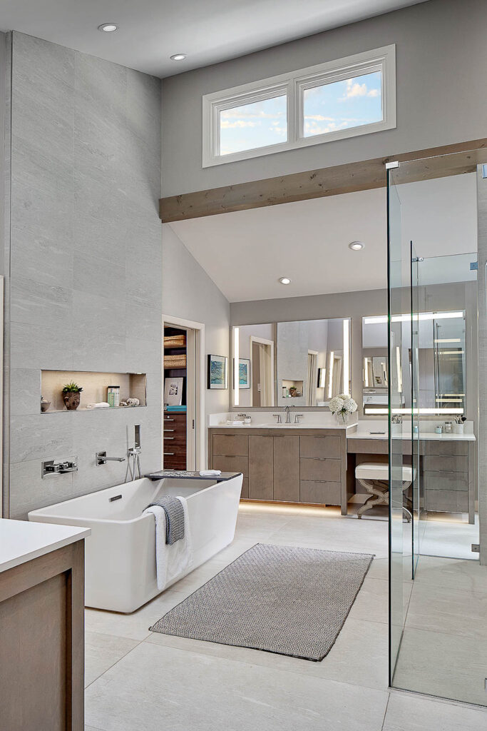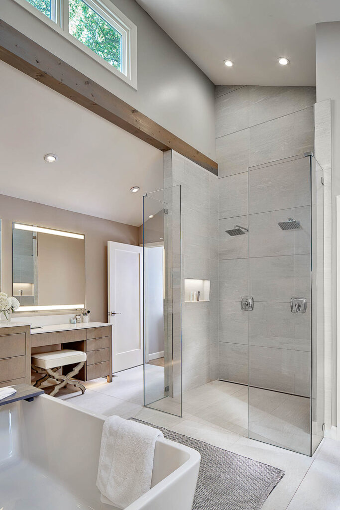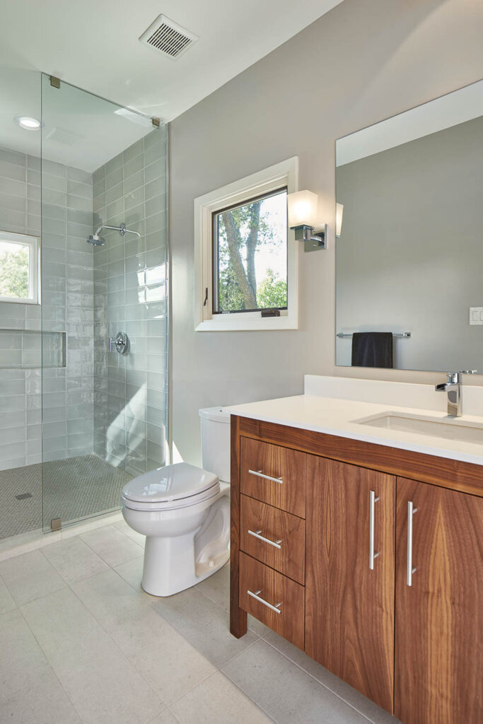 The open staircase leading to the second-floor bedrooms was the focal point of the interior “connector hub”. The stair treads used were custom built utilizing 3’ thick laminated White Oak strips. Beautiful floor to ceiling Marvin picture windows creates a dramatic visual effect and allows an abundance of natural light and clear sightlines to the back yard. Both bathrooms have open walk-in showers with low barrier thresholds and non-slip tile to ensure adequate access and safety were properly addressed. The modern vanities were custom built using vertical grain Walnut with “Explosion White” Quartzite countertops.