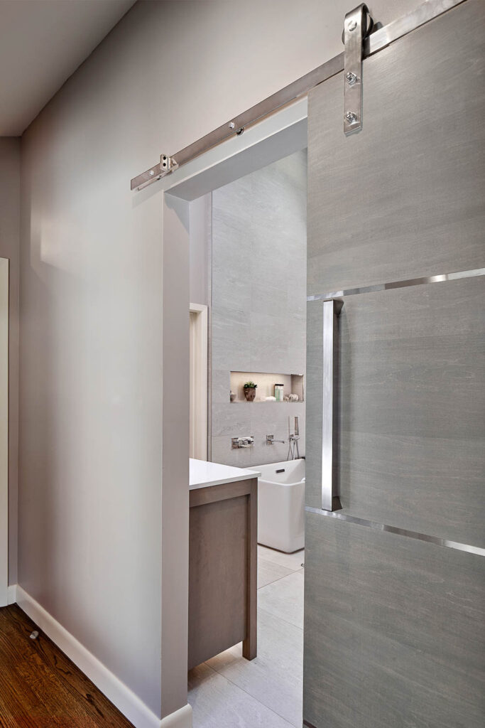 Goal for the interior renovation was to completely reconfigure the bedroom wing of the house to provide a modern master suite with ample natural light and views to the pool from the bedroom. The master bath and bedroom locations were reversed. The original closets were too small and inefficient for their needs, so a secondary bedroom was transformed into what was the master closet.