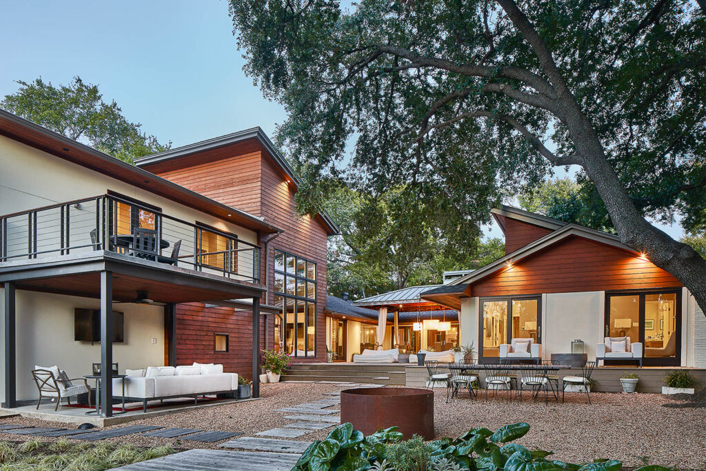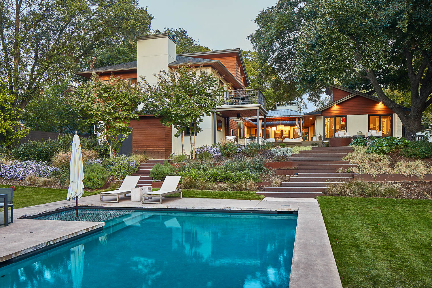 Included a 2-story addition, pool & landscape. The addition provided a much needed 2-car garage with storage, a mud room and 2-bedroom suites for their growing family. Key elements that the homeowners requested included a covered patio with a modern gas firepit and a balcony with a view of the pool and rear yard. A lighting designer was consulted to design the lighting to ensure the addition was properly lit for function as well as creating a dramatic nighttime visual effect.
