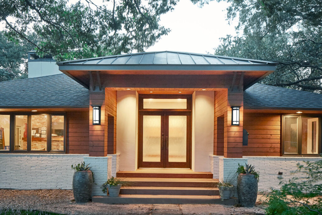 Brick was removed beside the existing windows across the entire front elevation and horizontal narrow gap wood siding was added to the façade. The existing brick chimney was clad in stucco and a new custom metal chimney cap was added. The remaining brick was painted the same color as the stucco to add contrast and a cleaner visual appeal.