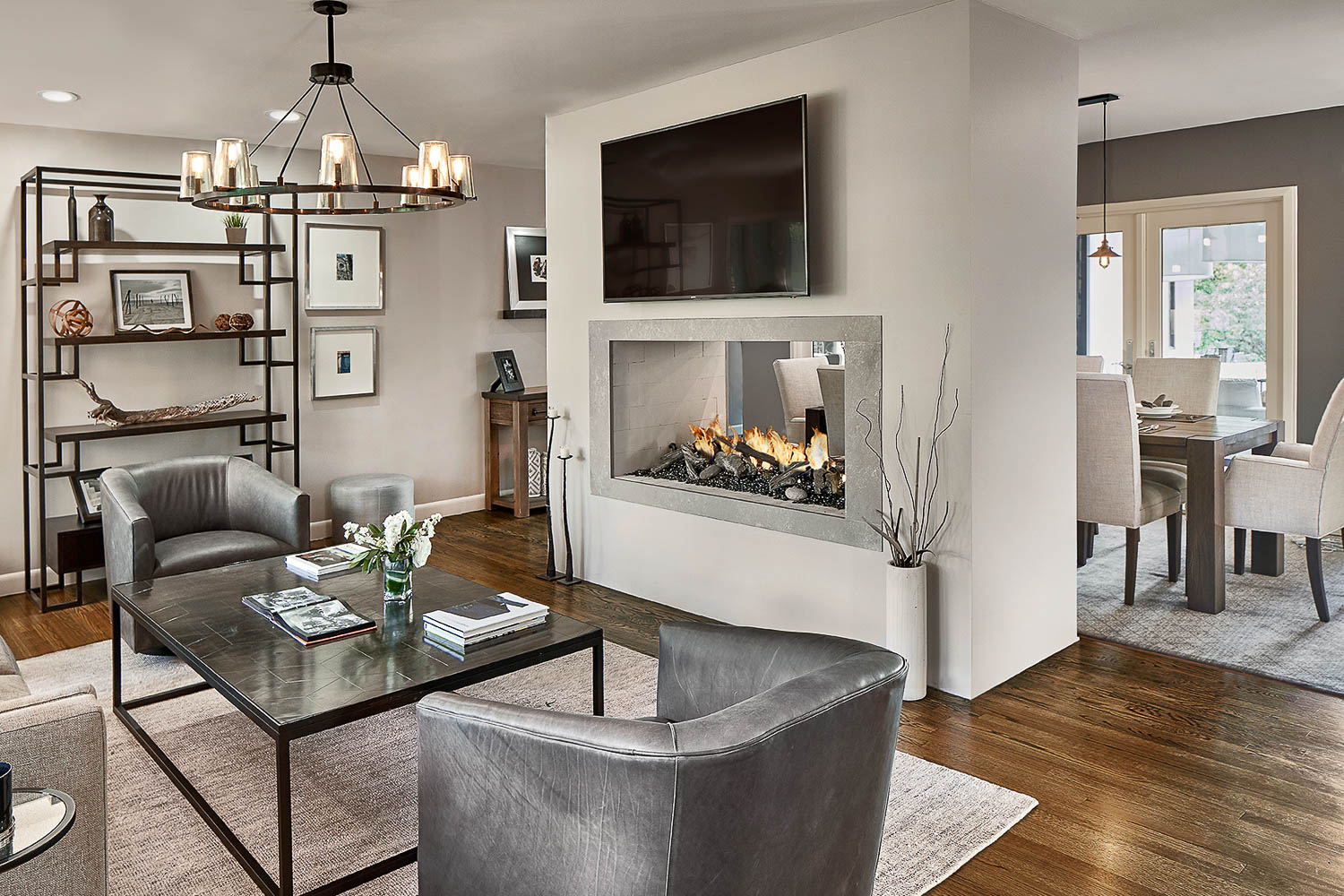 The project also included cosmetic updates to the kitchen and living area. A traditional side by side fireplace was transformed into a modern horizontal see-through fireplace. The kitchen received cosmetic updates with new quartz counters, raised butcher-block/island seating, painting, hardwood floors, cabinet modifications and updated lighting.