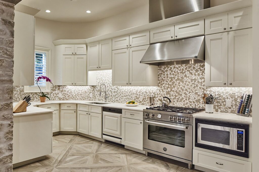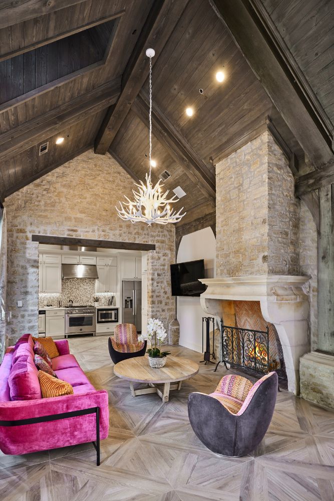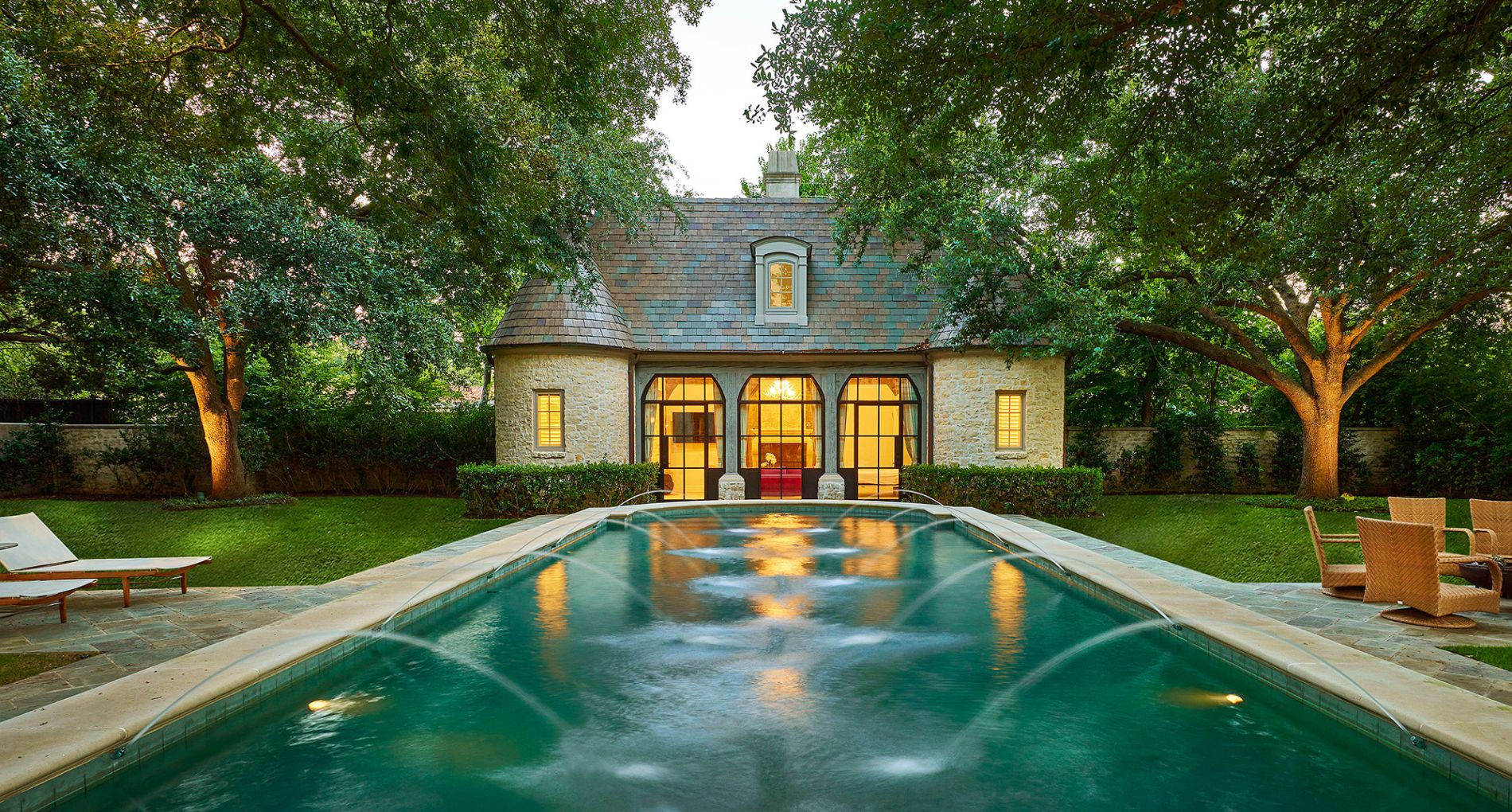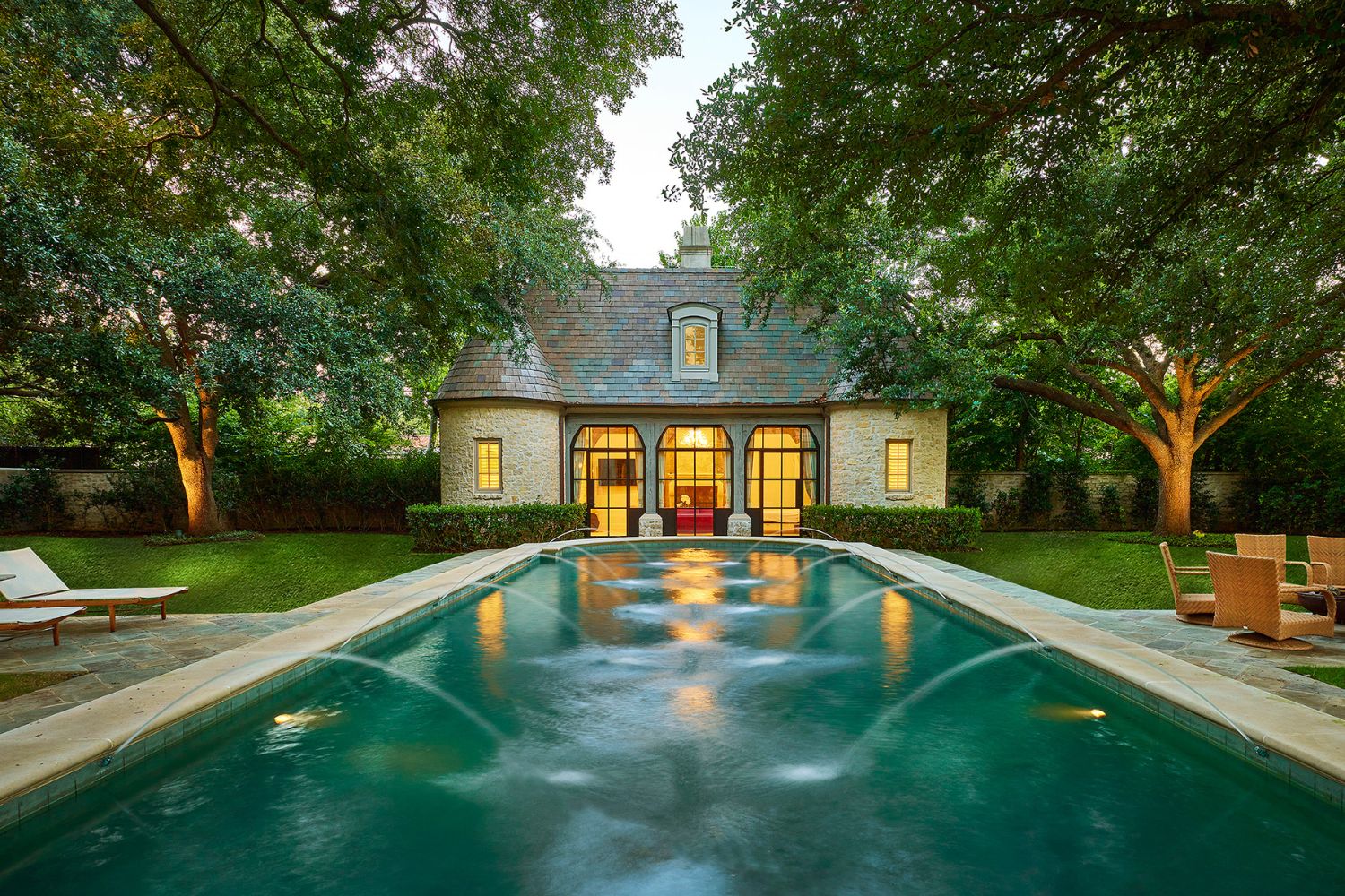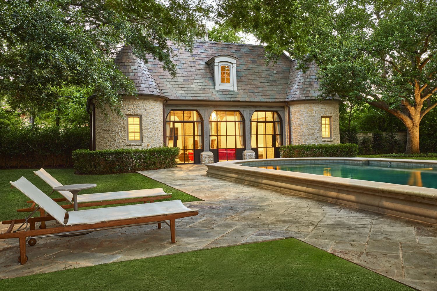 We transformed this 780-square-foot cabana into a guest house for a family in Old Preston Hollow. Originally designed by a renowned Dallas architect, the structure was once a poolside cabana with an open-air covered space, featuring a fireplace, a catering kitchen, two bathrooms, and a storage closet. However, the homeowners envisioned something different and wanted to convert it into a guest cottage for visitors and their college-aged children during breaks. To achieve this, we installed narrow-profile steel doors to enclose the space while preserving the pool view. The catering kitchen and one bathroom were combined to create a full kitchen with generous cabinet and counter space. The second bathroom and storage closet were transformed into a full bath with a walk-in shower and closet. A Murphy bed was added to the living room to optimize space and versatility.
